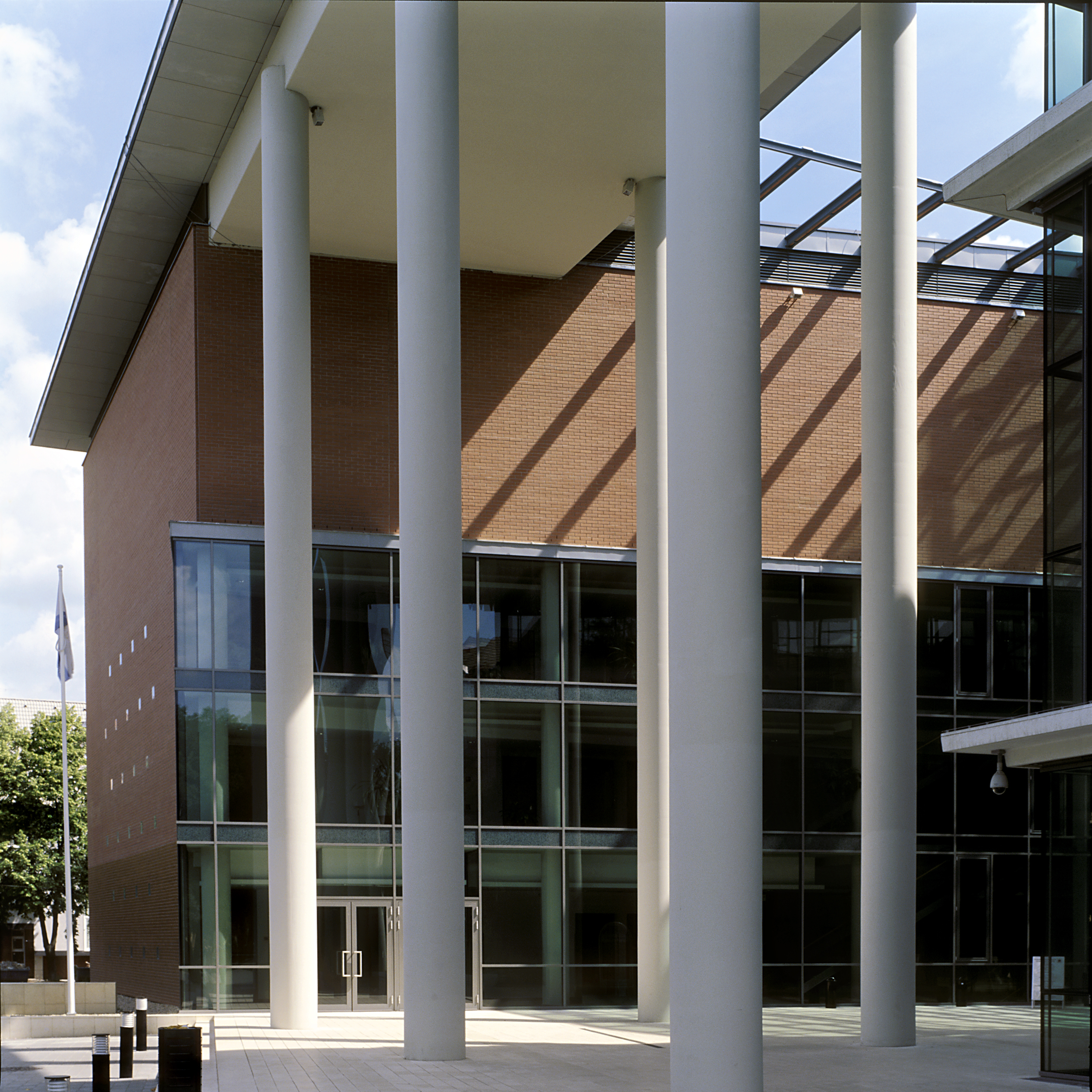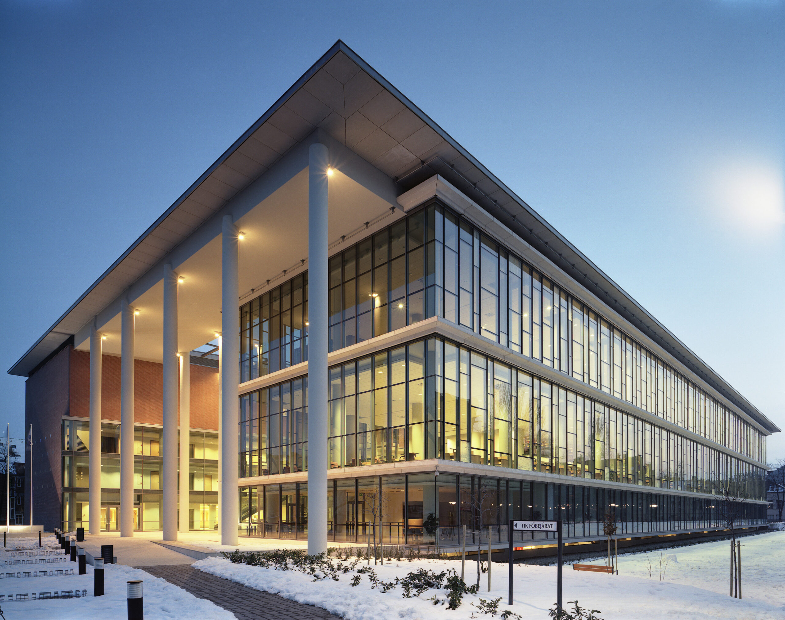 Az épület építészeti karakterét egy hossztengely menti sávos elrendezés adja. A természetes megvilágítást és csendet igénylő szabadpolcos olvasó és tanuló termek a belső udvar két oldalán helyezkednek el, transzparens üveghomlokzatokkal. A tömör térfalat adó zárt raktárak, irodák, kiszolgáló és gépészeti terek, valamint az előadótermek az épület dél felőli szélső sávjában helyezkednek el. Ez az oldal zaj, hőterhelési és környezeti szempontból egyaránt a legmostohább, ezért ebben az irányban az épület zárkózott hatást mutat. Az eltérő funkciójú és homlokzati megjelenésű épülettömböket egységes tető fogja össze, zárt idomba rendezve az épület kontúrját, kijelölve a tömb határvonalait.