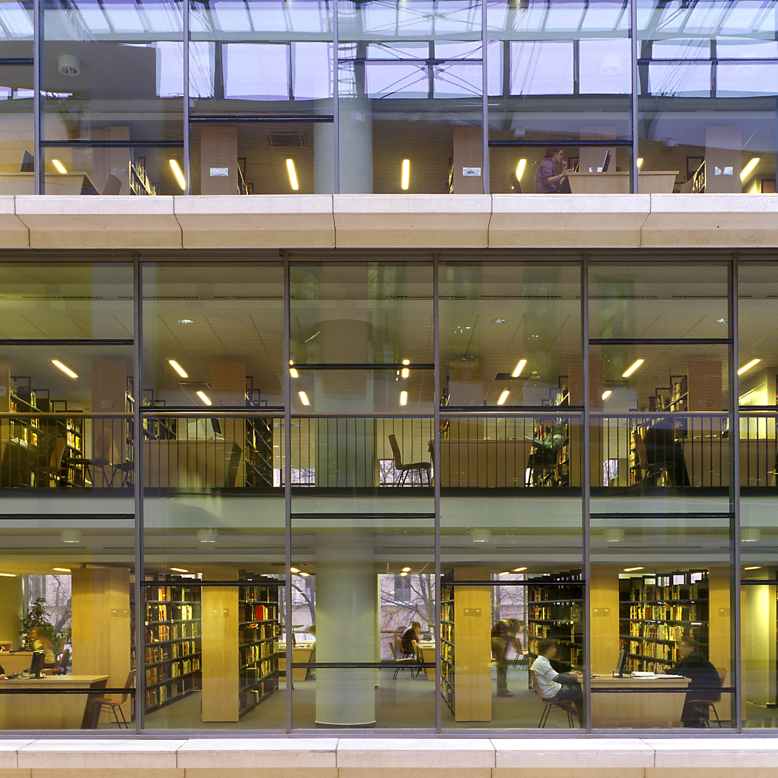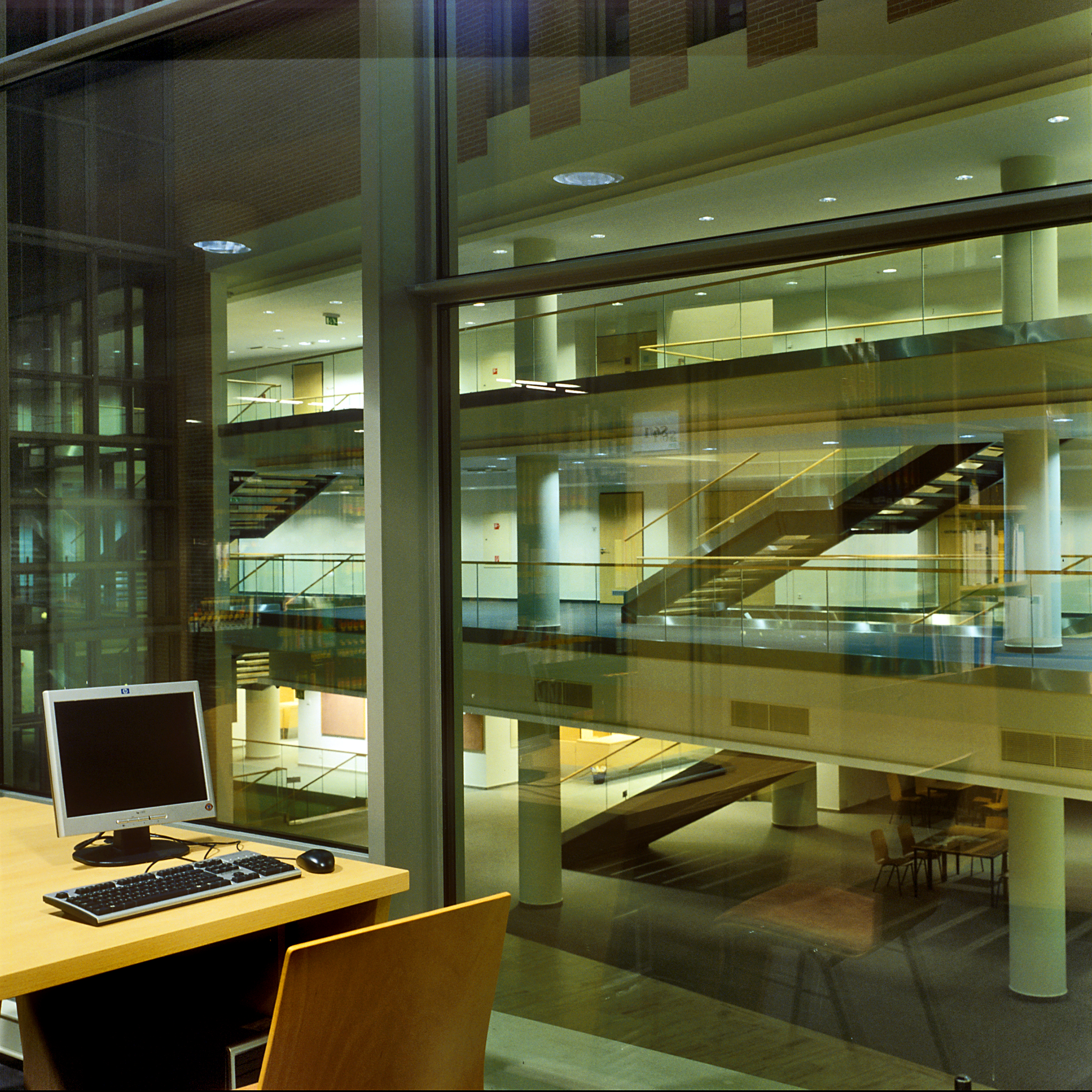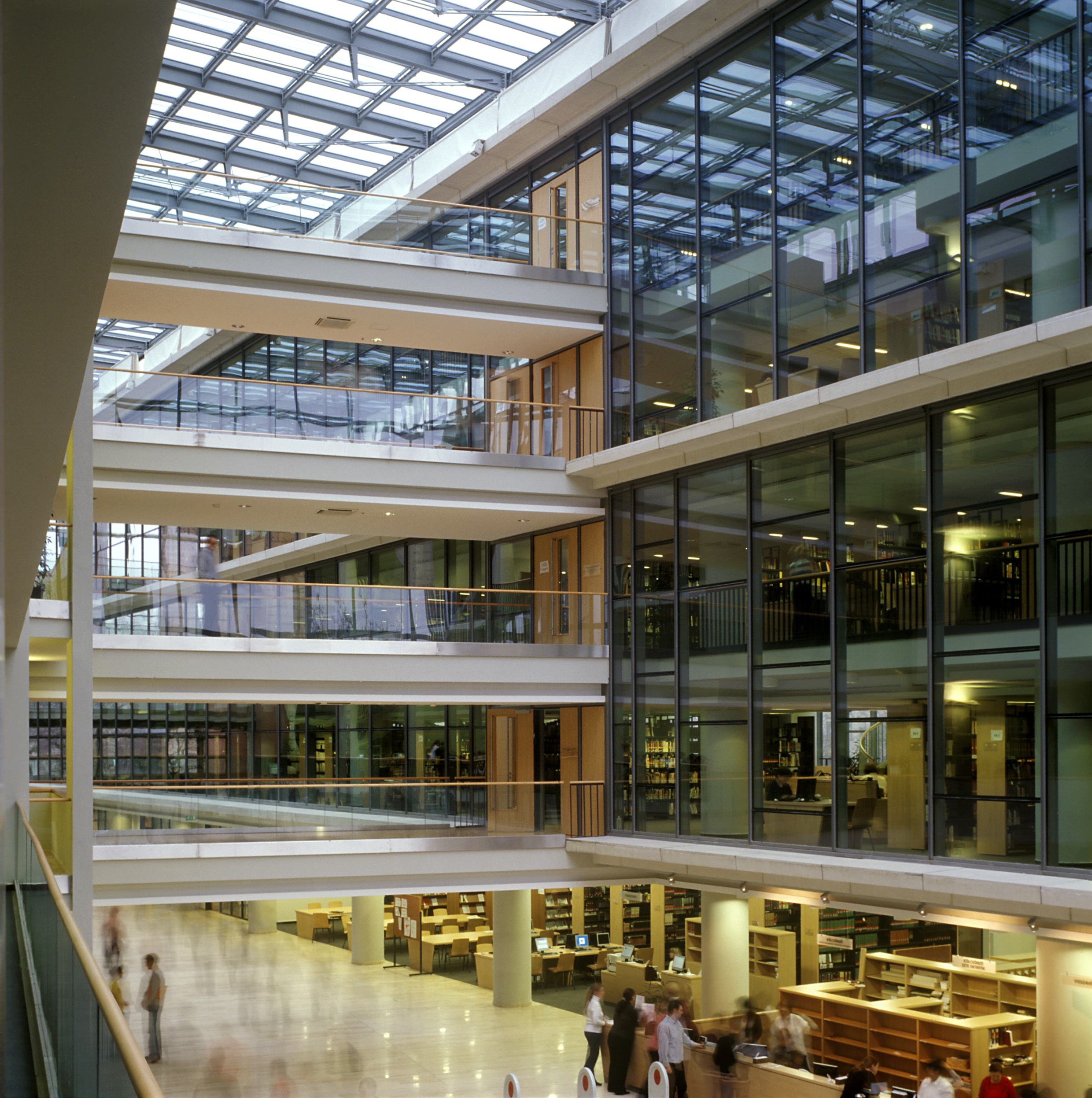 Az épület térbeli elrendezése áttekinthető, tömör. A szabadpolcos olvasói terek a szomszédos egyetemi épület felőli északi tájolású parkra néznek. Az épület hossztengelye mentén átlátható, térfalat adó funkció nem került a középső traktusba, csak előkert, előcsarnok, vertikális közlekedők, hidak és fedett olvasókert. Ez a nagy belmagasságú, üveggel fedett térsor képezi az épület belső tengelyét. Az épület derékszögű koordináta rendszerébe egy, a meglévő egyetemi épület hossztengelyével párhuzamos tengely hasít bele.