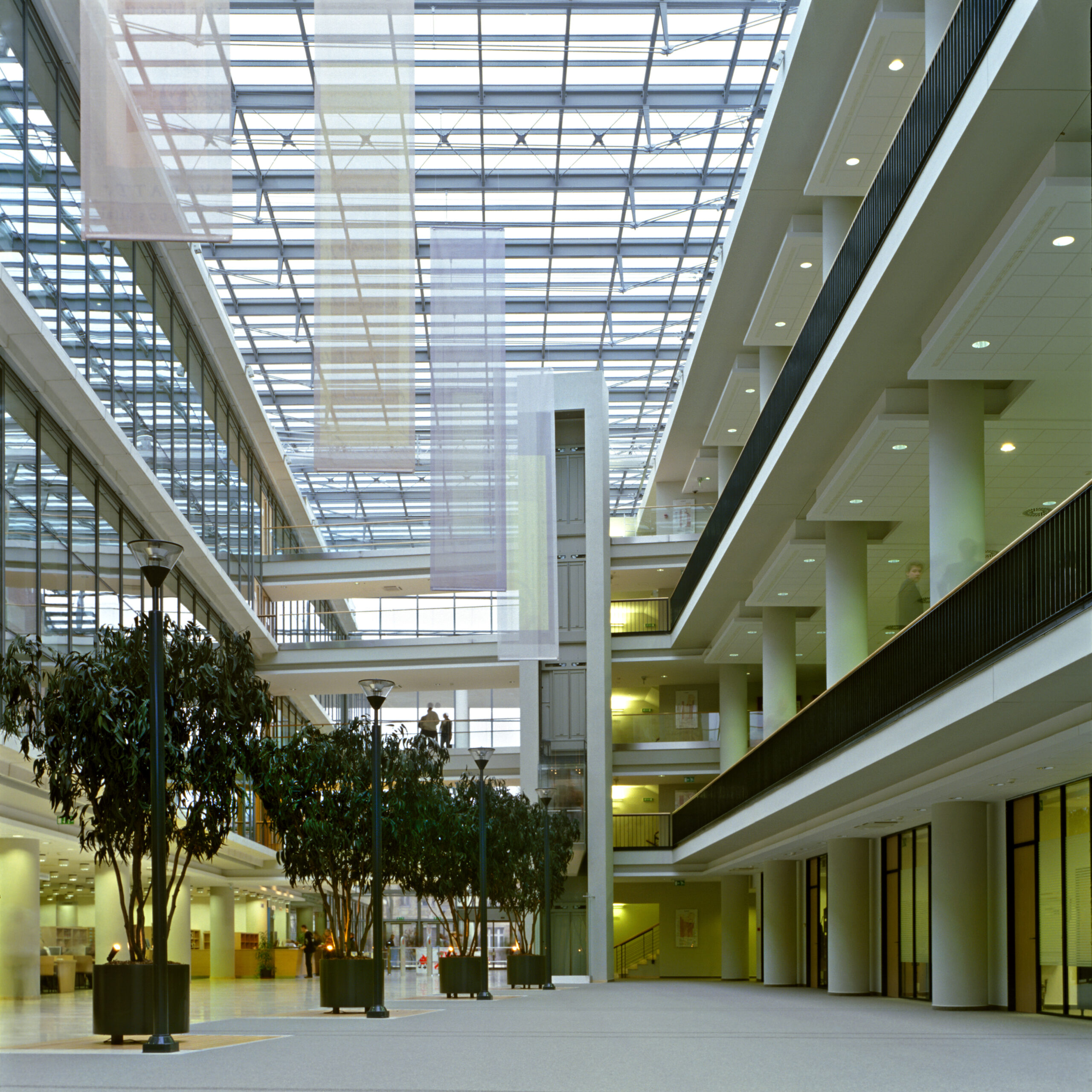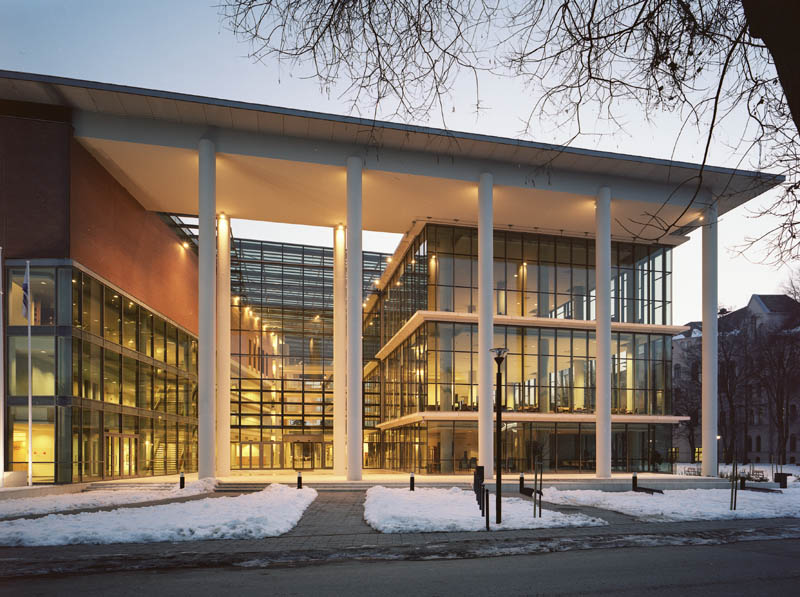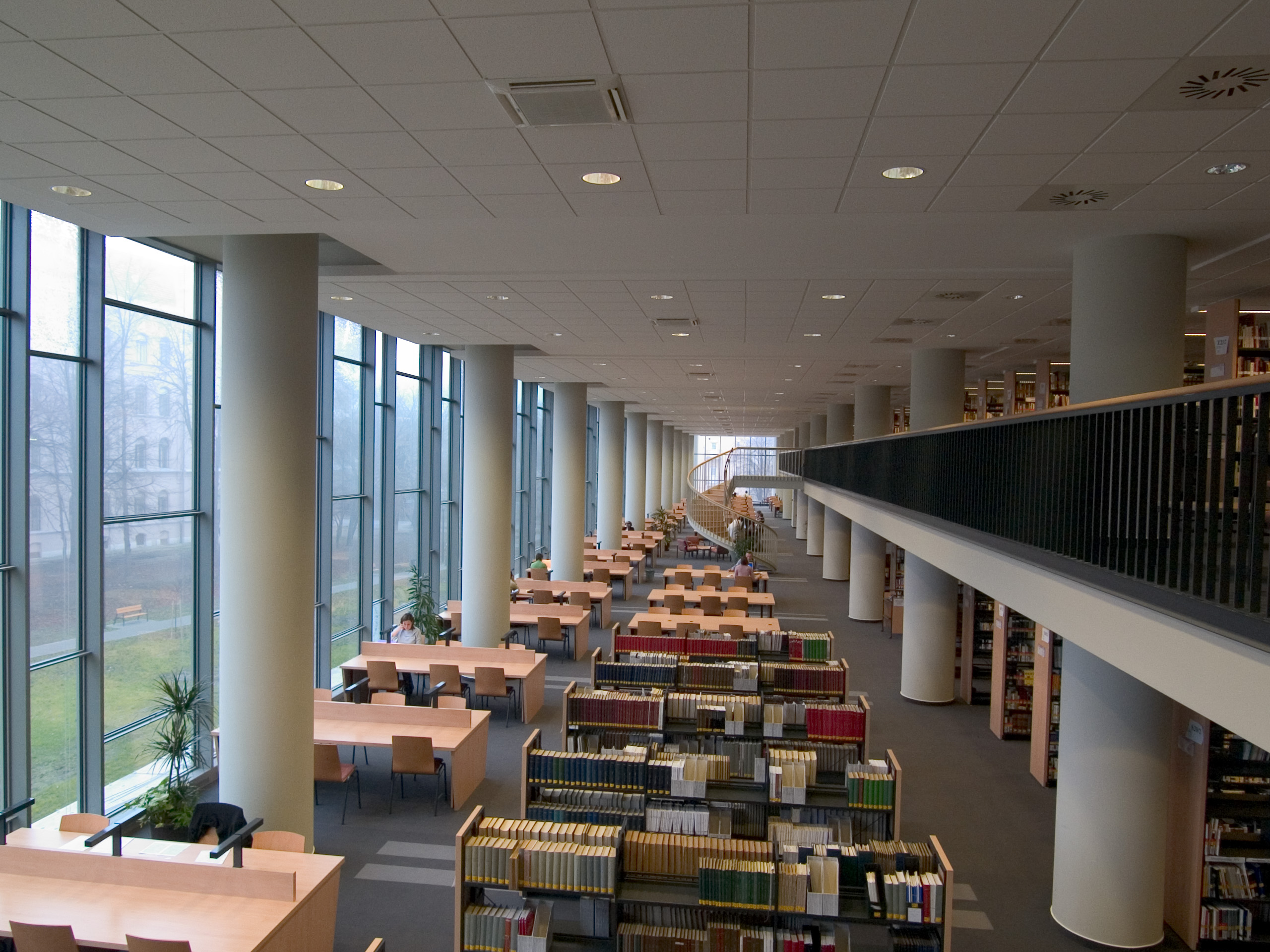Az épület térbeli elrendezése áttekinthető, tömör. A szabadpolcos olvasói terek a szomszédos egyetemi épület felőli északi tájolású parkra néznek. Az épület hossztengelye mentén átlátható, térfalat adó funkció nem került a középső traktusba, csak előkert, előcsarnok, vertikális közlekedők, hidak és fedett olvasókert. Ez a nagy belmagasságú, üveggel fedett térsor képezi az épület belső tengelyét. Az épület derékszögű koordináta rendszerébe egy, a meglévő egyetemi épület hossztengelyével párhuzamos tengely hasít bele.