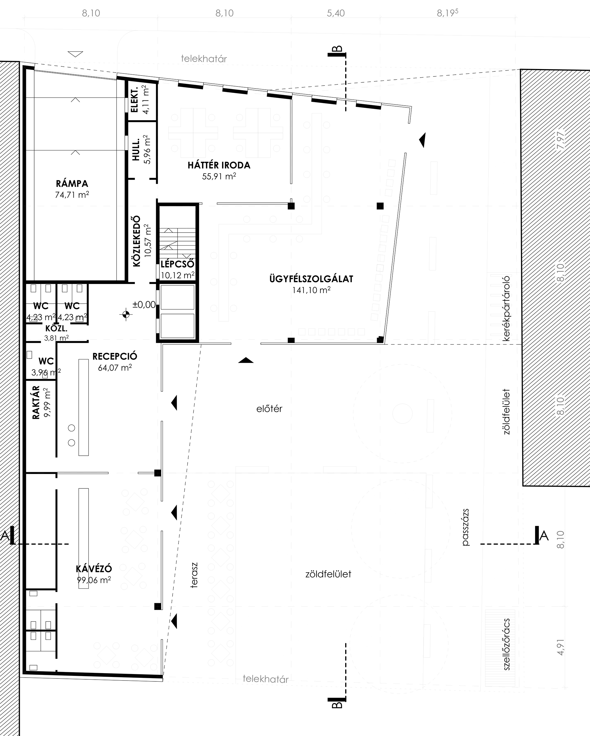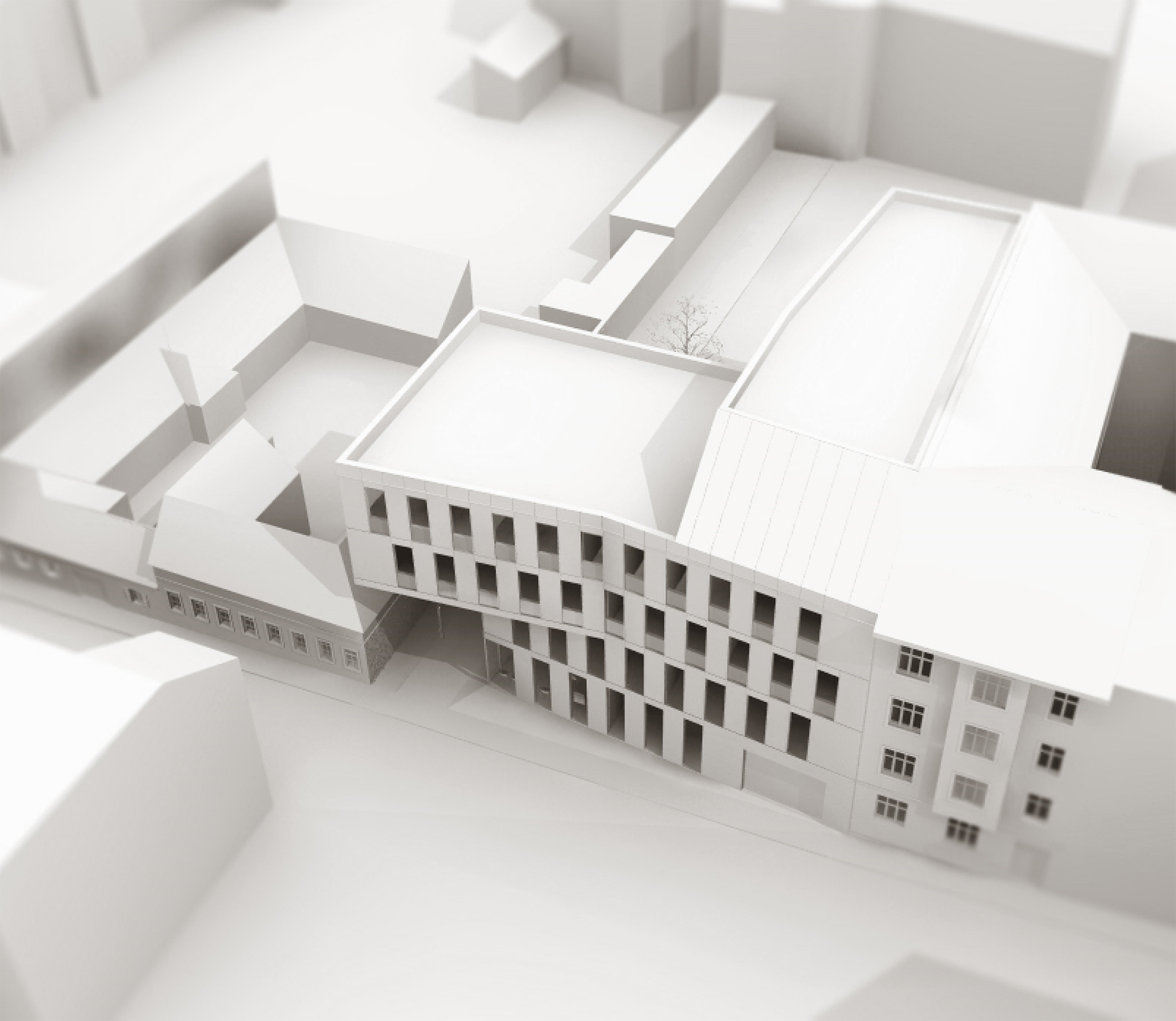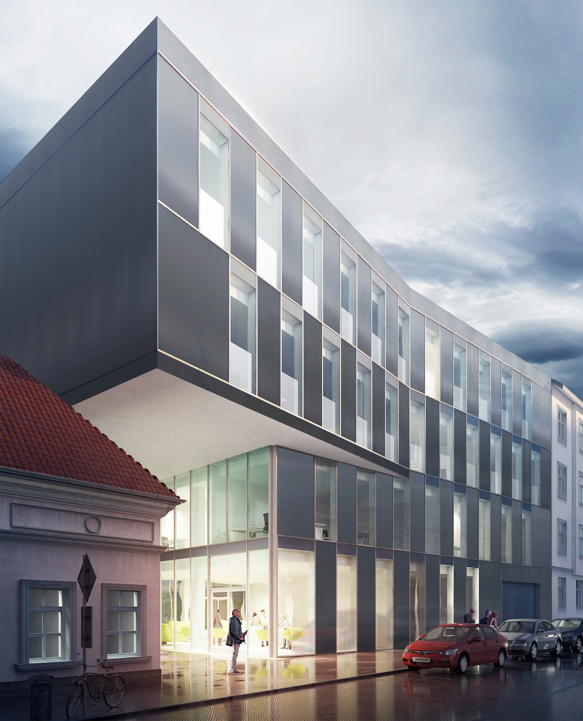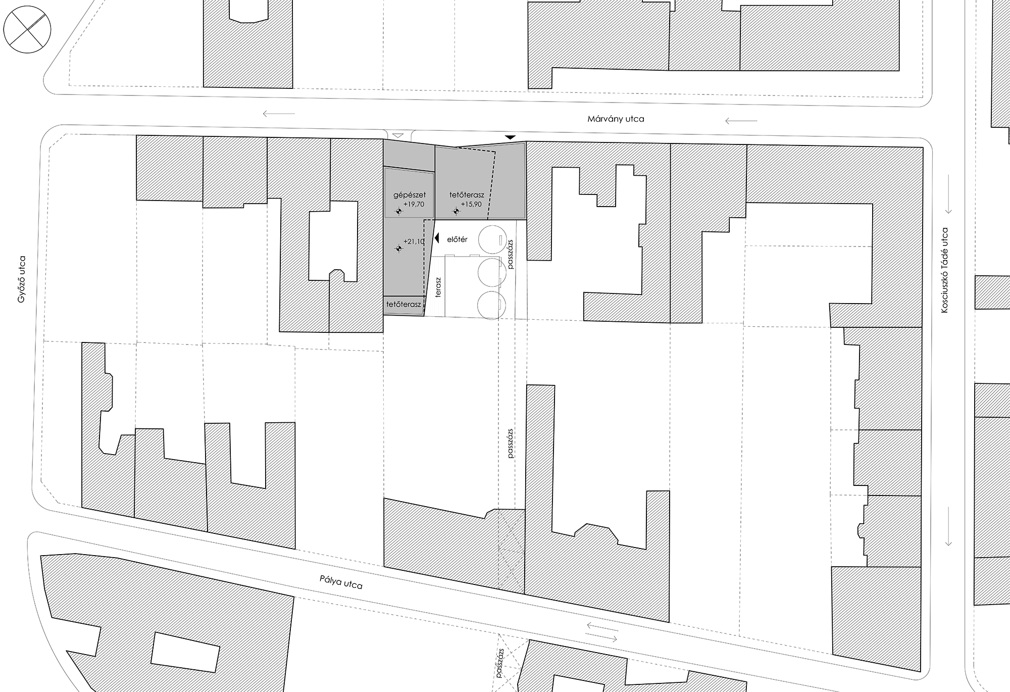 A telek legizgalmasabb kérdése a szomszédos, eltérő léptékű épületek közötti feszültség feloldása. Ezt a feszültséget tovább fokozza a szabályozási terven túlhangsúlyozott gyalogos passzázs, mely, ha teljes hosszában megvalósul, akkor egy hangulatos sétány lehet, de jelenlegi állapotban az előírt gesztus túlzónak tűnik.