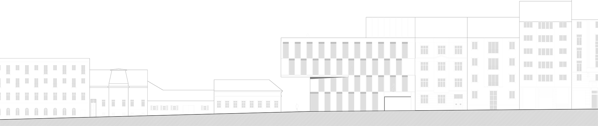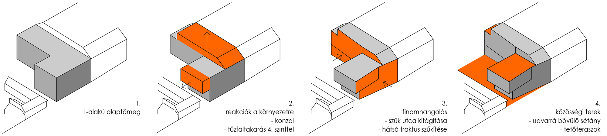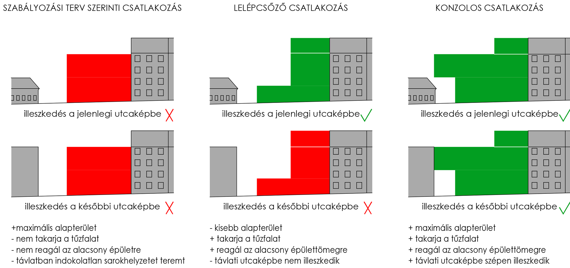 A szomszédos épületekkel kapcsolatban felmerül még egy fontos kérdés: vajon a Márvány Menyasszony épülete meddig maradhat meg? Véleményünk szerint mind városépítészeti, mind gazdasági szempontból reális jövőkép ennek az évtizedek alatt megváltozott utcaképbe nem illeszkedő, alacsony szintterületi mutatójú épületegyüttesnek a későbbi elbontásával is számolni. Számunkra ez azt jelenti, hogy olyan építészeti megoldást kell keresnünk, mely megnyugtatóan kezeli a jelenlegi, alacsony épülettömeghez való csatlakozást, de egy későbbi, zártsorú utcaképbe is illeszkedik.