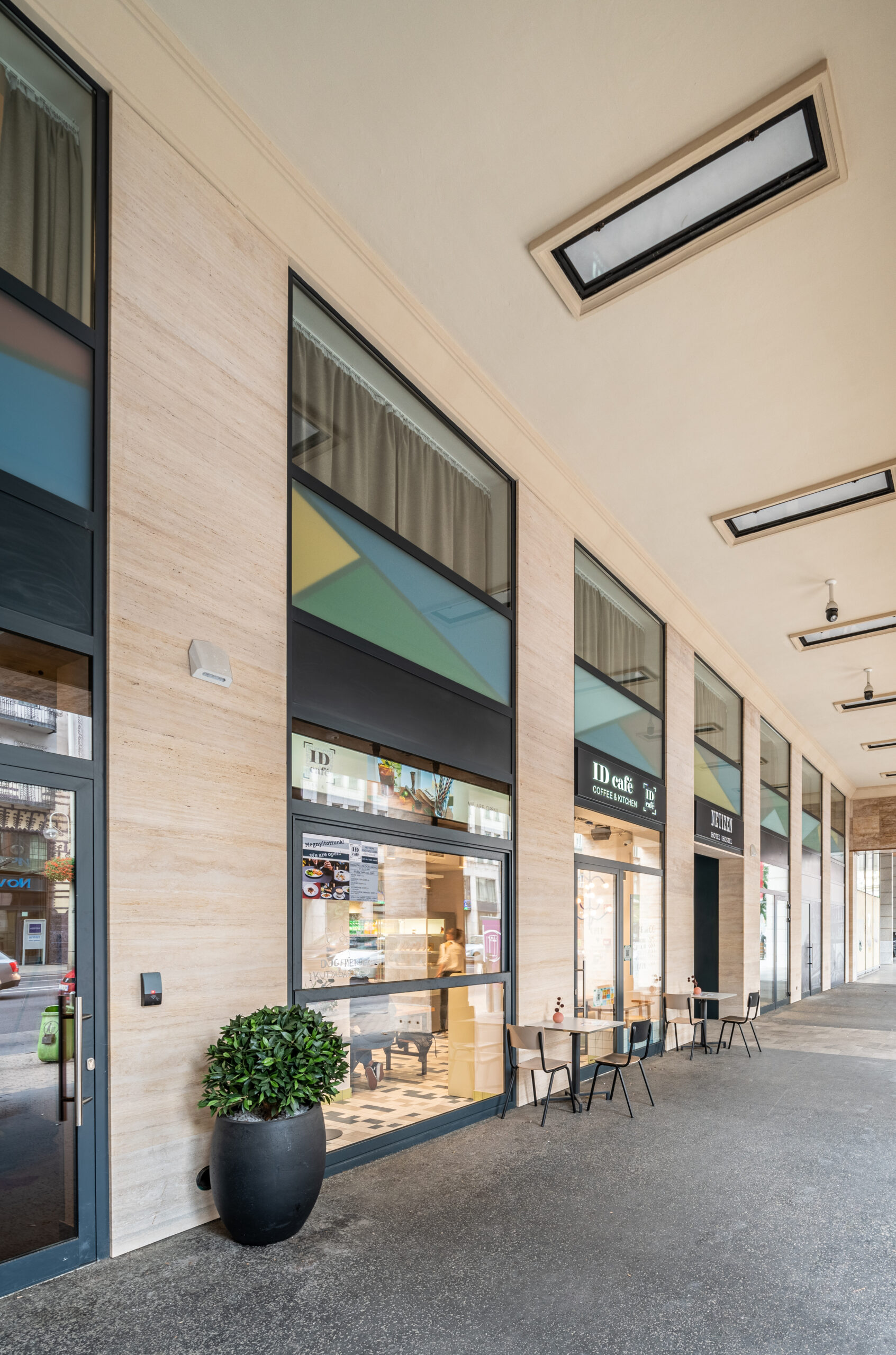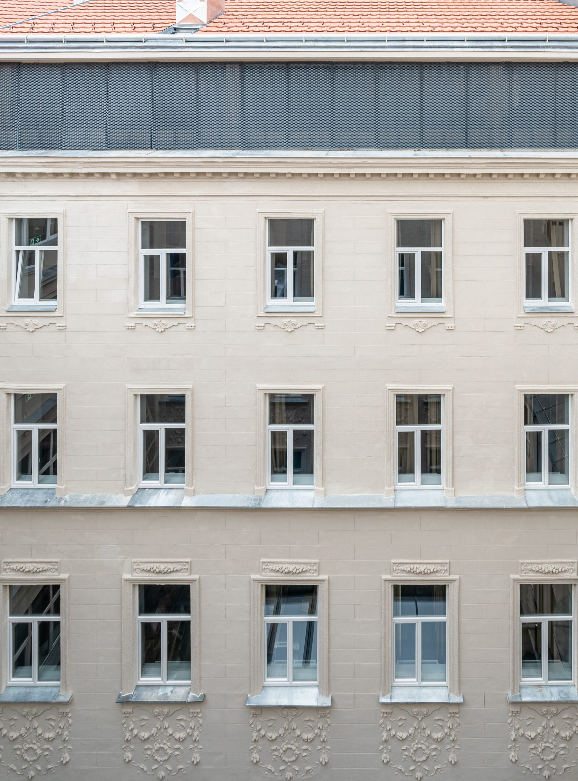 Az emeleti szinteken sajnos nem sikerült megőrizni az eredeti kapcsolt gerébtokos, bélletborításos nyílászárókat, helyükre az utcai homlokzaton az eredetivel egyező díszítésű és színű egyrétegű, hőszigetelő üvegezésű nyílászárók, míg a belső udvarban – költségcsökkentés miatt – műanyag ablakok kerültek beépítésre. Az árkádra néző homlokzaton kétszintes alumínium portálok készültek. A felújítás és funkcióváltás megvalósítása során a megörökölt épület megfeleltetése a mai tartószerkezeti, épületszerkezeti, akusztikai, tűzvédelmi követelményeknek jelentős erőfeszítést igényelt. A Hostel belsőépítészeti tervezését irodánktól független megbízás alapján orosz belsőépítészek végezték.