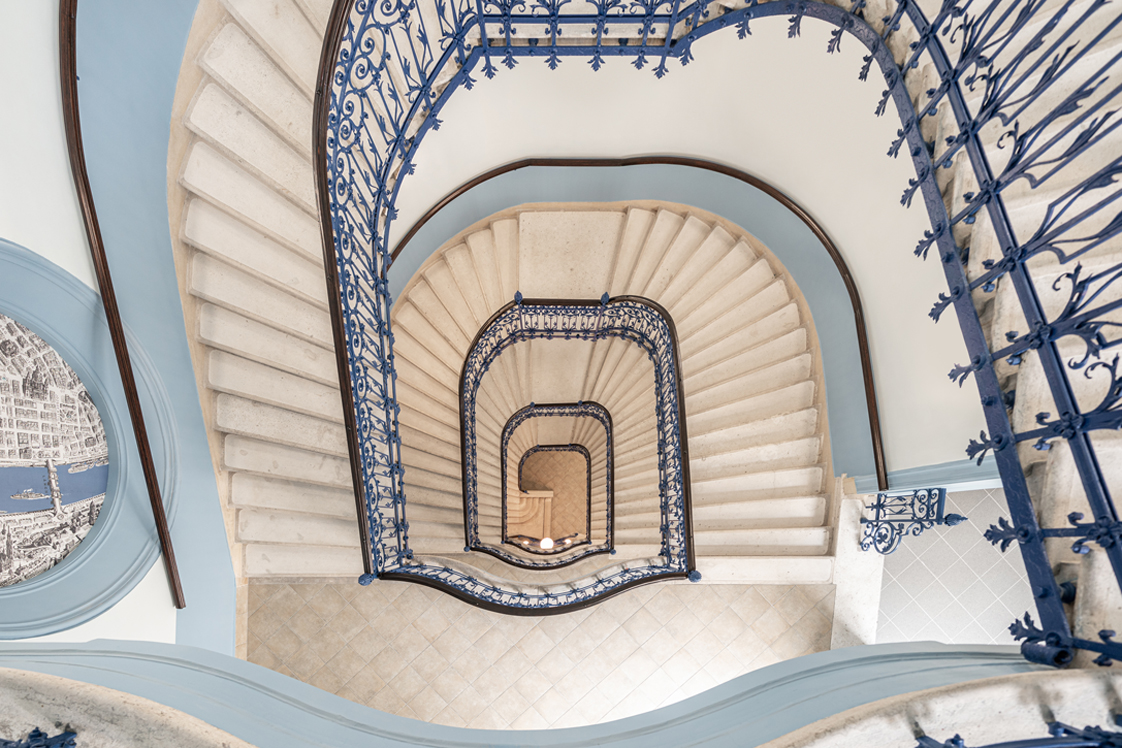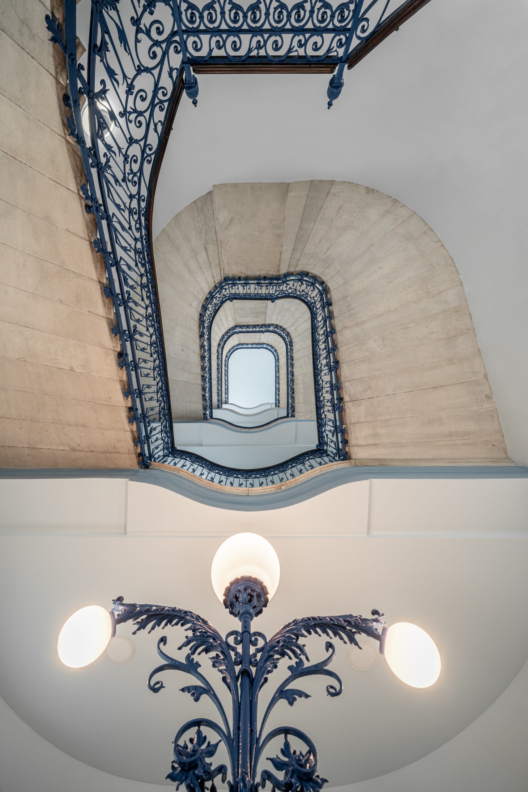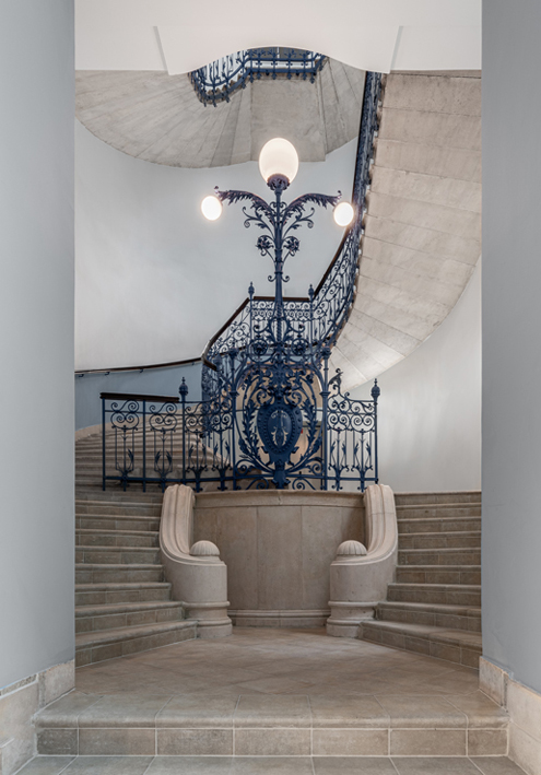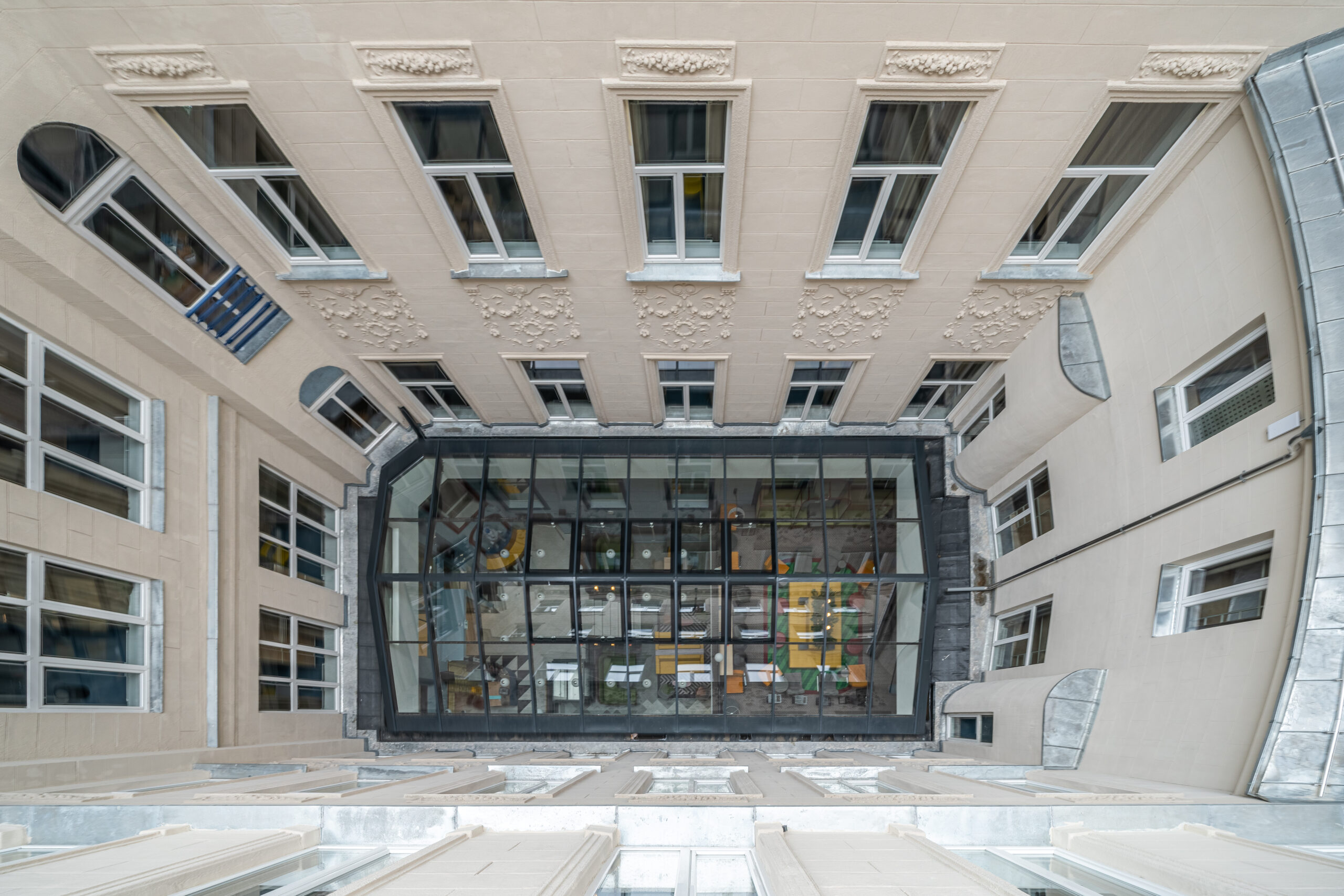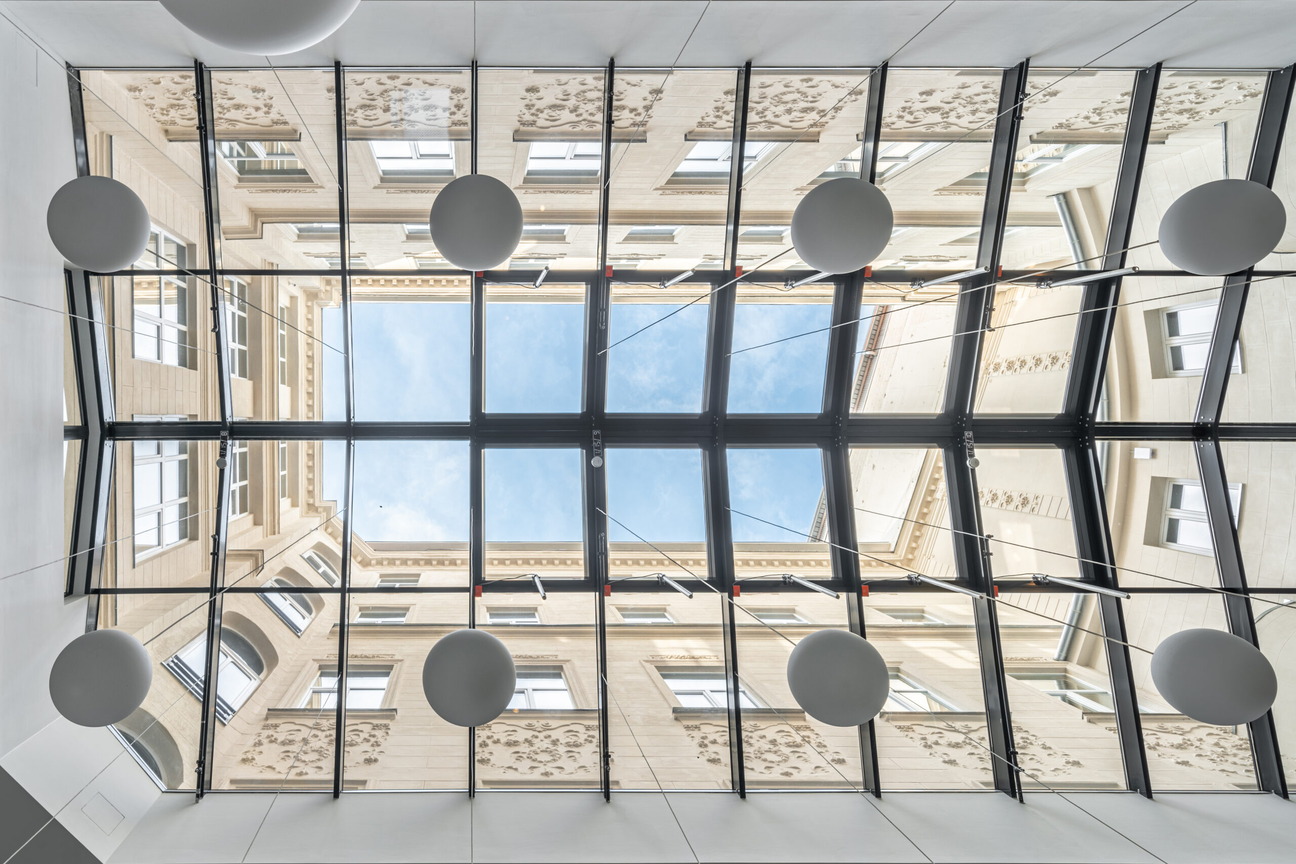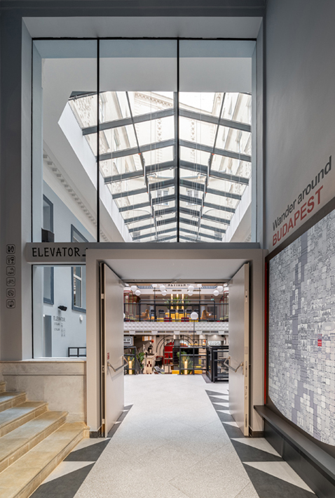 A meglévő főlépcsőházat, mint az épület legértékesebb részét felújítottuk, a hátsó melléklépcsőház elbontott részét pótoltuk. Az udvar korábbi üveg lefedését korszerű, alacsony hajlásszögű üvegtetőre cseréltük.
