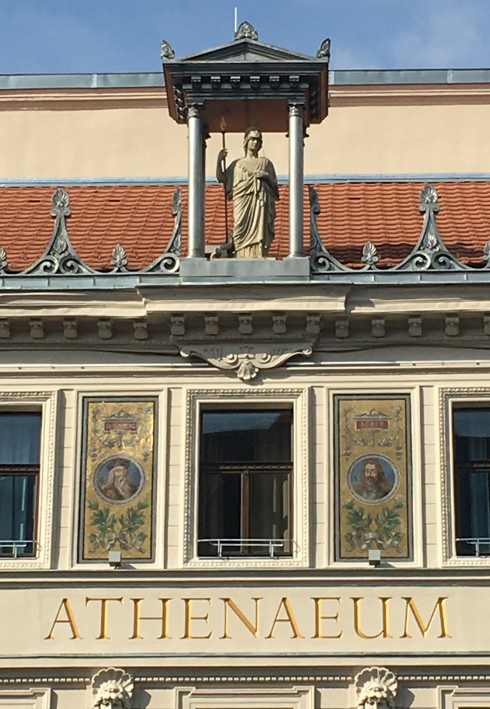 A terveket Kauser József és Hauszmann Sándor készítette, Hauszmann a ház építője is egyben. 1898-ban fejezték be az építést. Az épület főhomlokzatának felirata a Párizsból indult és Európa szerte elterjedt Athenaeum kulturális és művészeti egyletekhez való tartozást hirdette. A homlokzat gazdagon díszített, főpárkányán Róth Miksa által készített mozaik képek -Senefelder, Rembrandt, Gutenberg, Mozart, Dürer, Táncsics Mihály képei arany mozaik háttérrel- voltak láthatók. Pártázatos főpárkányán sarokdíszek, a tengelyben Pallasz Athéné aedikulába állított lándzsás szobra helyezkedett el. A háború után a homlokzat gazdag díszítéséből a mozaik képek kivételével minden díszítő elem megsemmisült.