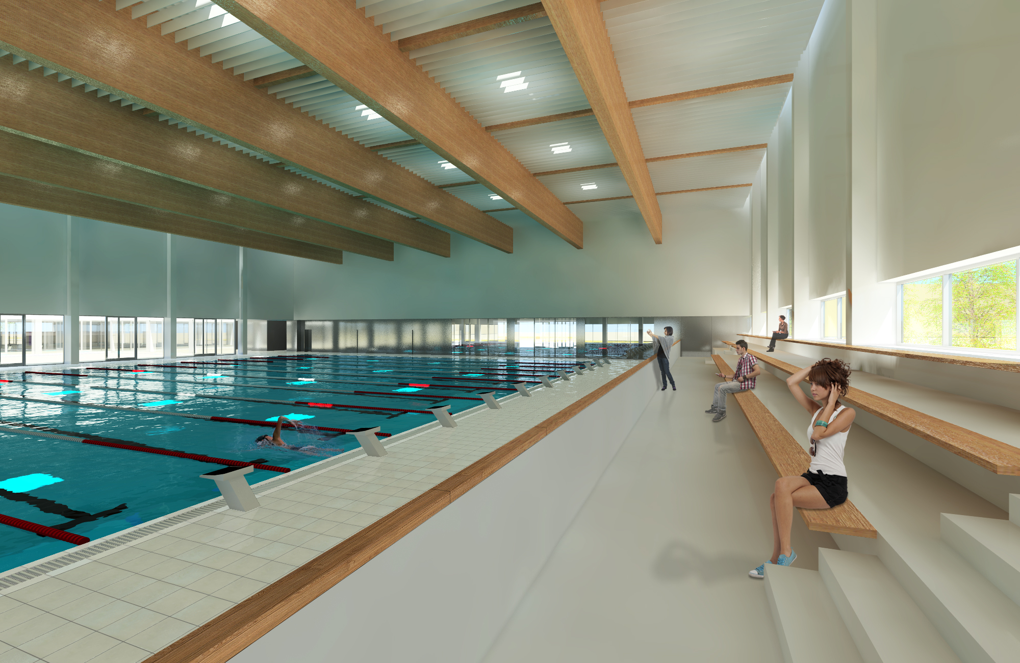 A tervezési program elrendezésekor lényeges szempont volt, hogy a közönség által használt terek a földszintre kerüljenek, csak az edzőterem és annak öltözői kerültek az emeletre. Az uszoda főbejárata és nagymedence csarnok tömege a leendő köztér tengelyébe helyezkedik el, az előcsarnok és a nagymedence csarnok vizuális kapcsolata biztosított.