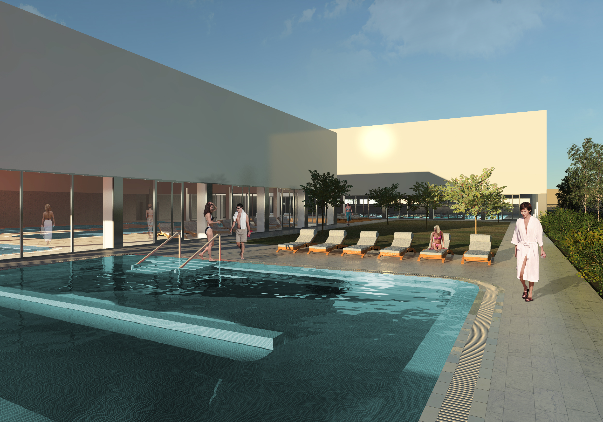 Az épület térbeli rendjét egy földszint + egy emeletes kelet-nyugat hossztengelyű kiszolgáló szárny és arra merőleges nagymedence és élménymedence csarnokok alkotják, a csarnokok között udvarral. Az emeleti szint csak a kiszolgáló épület hossztengelye mentén elfelezett területére terjed ki, a fennmaradó terület zöldtető és az edzőterem előtti szakaszon terasz. Az épület részben alápincézett, a nagymedence és lelátó alatti teljes terület, a kiszolgáló hosszház alatt részben létesül pinceszint.