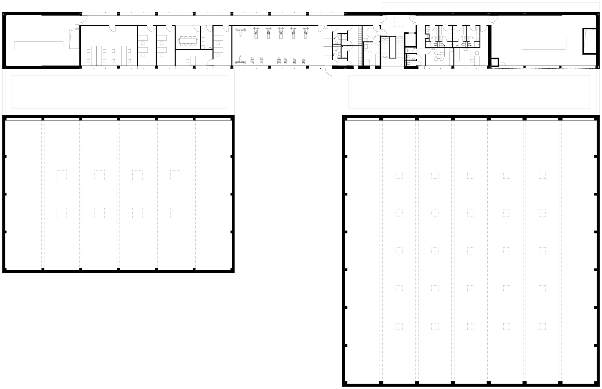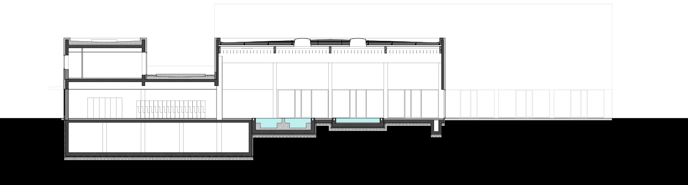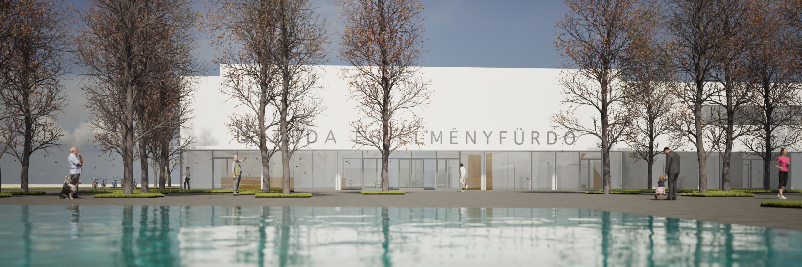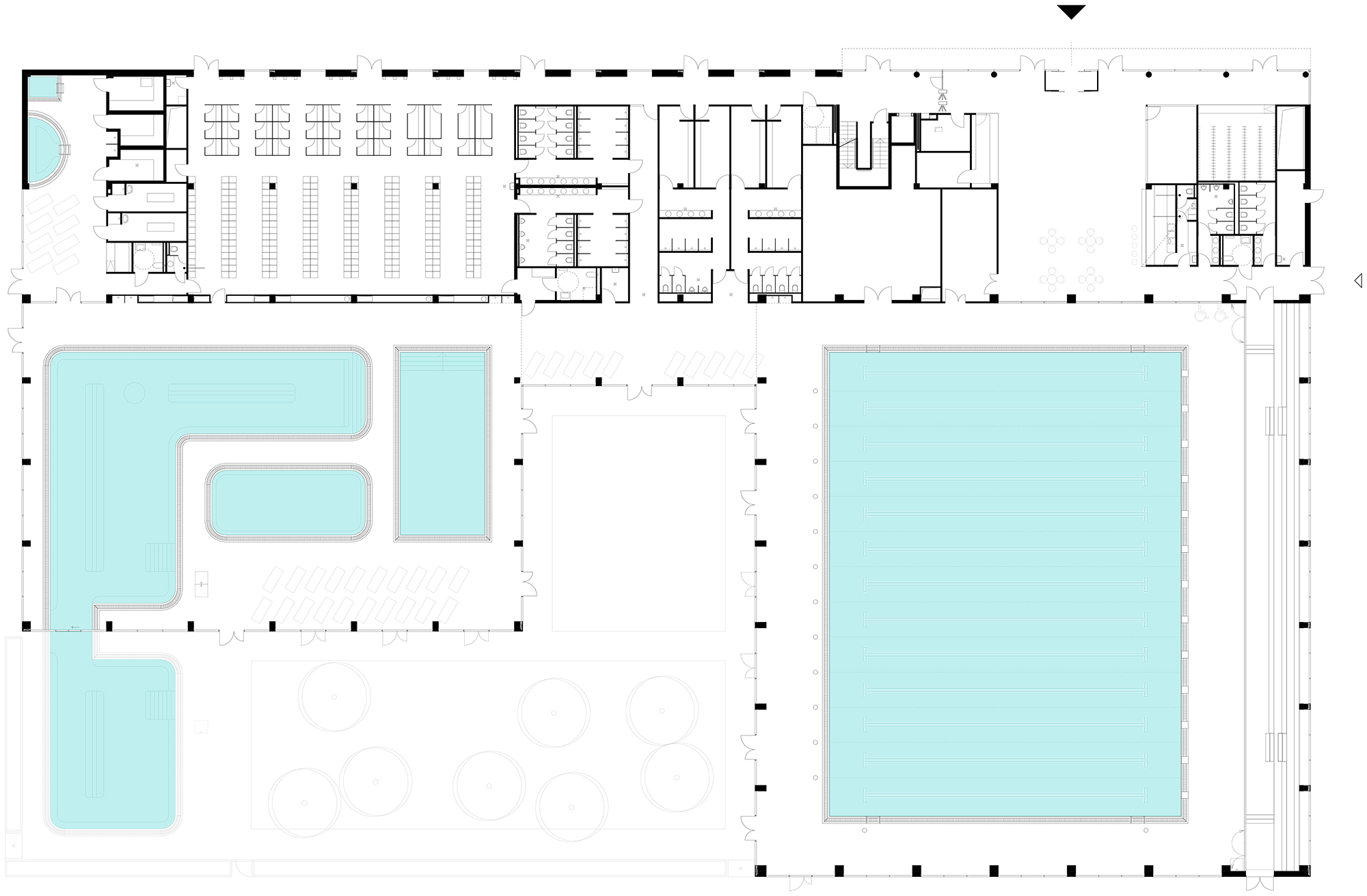 A főbejárattól balra a fürdőközönség és a lelátó közönség eseti kiszolgáló funkciói helyezkednek el, úgymint büfé, üzlet, vizesblokk, ruhatár. A nagymedence hosszoldala mentén 200 fős lelátó létesül.