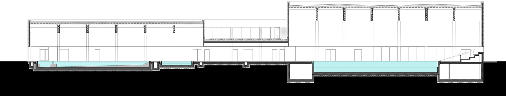 Érkezési irányból nézve a főbejárattól jobbra az uszoda, élményfürdő és wellness szolgáltatások közönsége halad át a jegyvásárlási, ellenőrzési és öltözői terek szoros funkcionális rendjén, mielőtt a medencecsarnokokba lép. Ebben a blokkban kap helyet a biztonsági szolgálat, úszómester és a sportszer raktár.