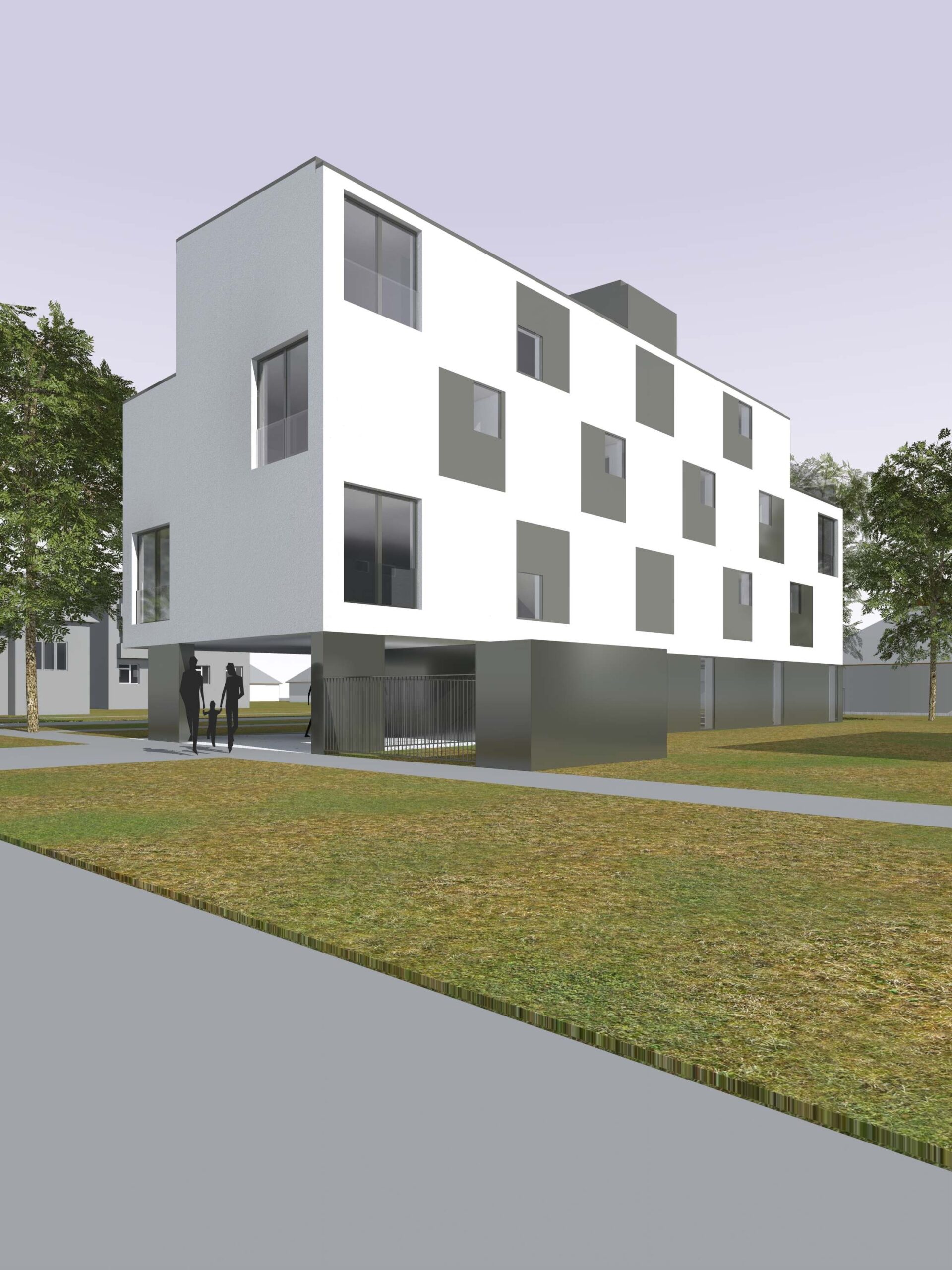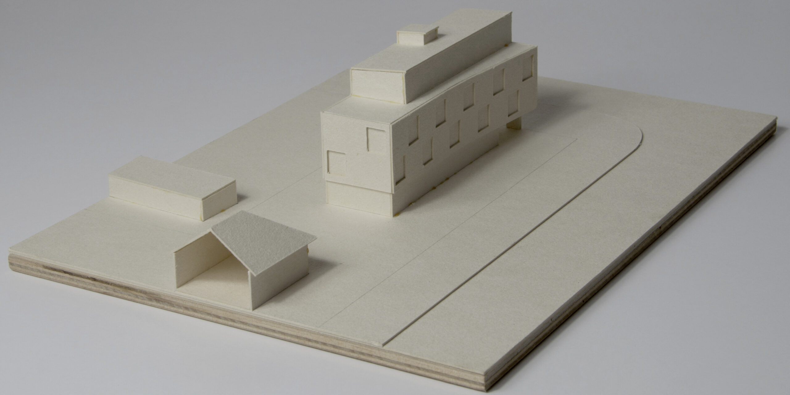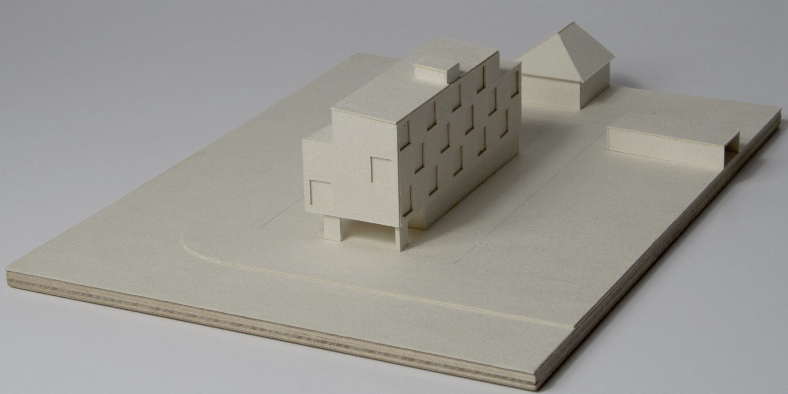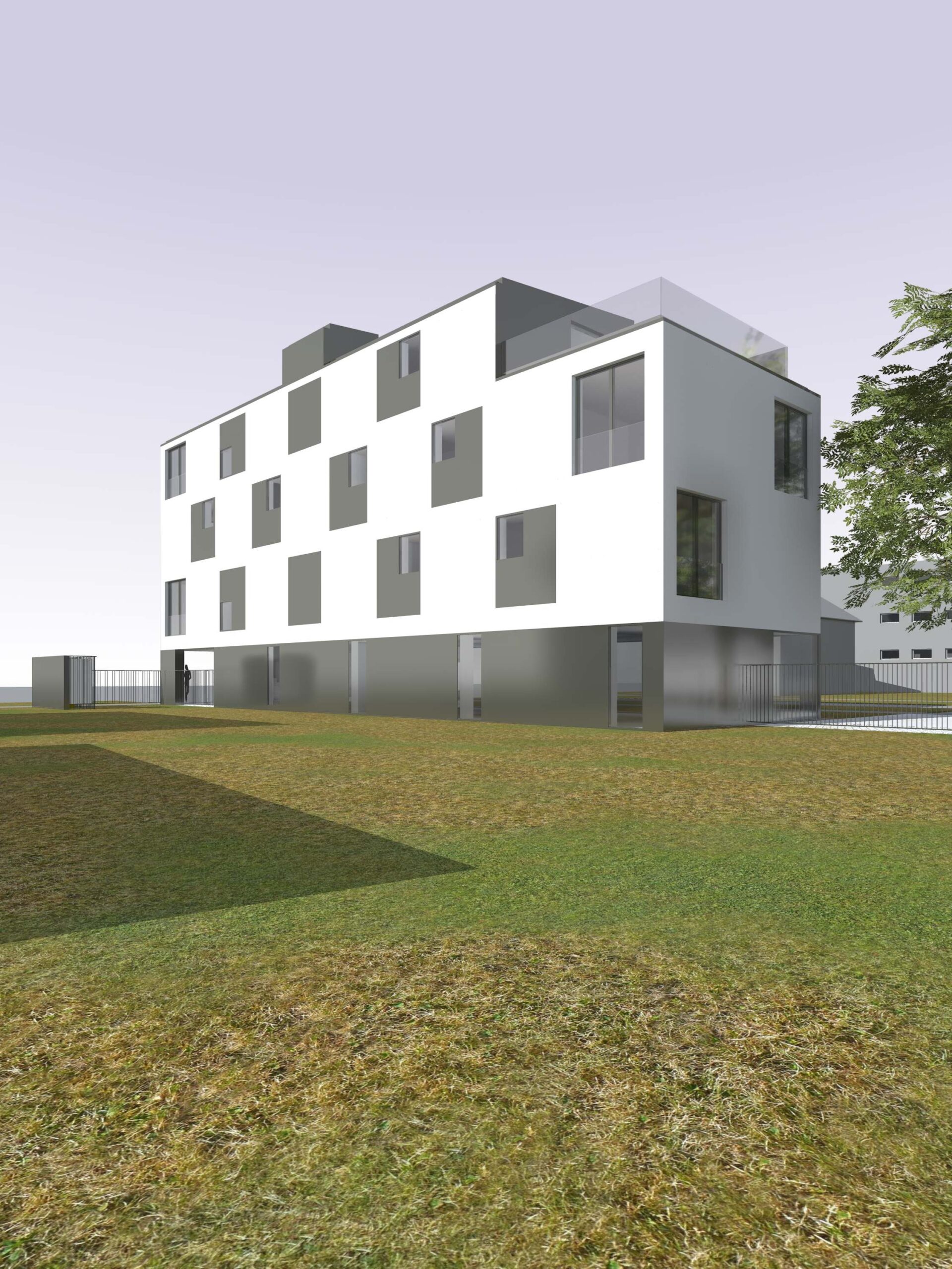 Az általunk tervezett tömeg ezen elvek mentén született: az alaprajzi forma a sarokhelyzetre és a szomszédos családi ház építési vonalára dinamikusan reagál. A földszintet a sarok felől visszahúztuk és körben kikönnyítettük, míg a harmadik emeleti tömeget a Felsőbüki utca és a szomszédos családi ház felől húztuk vissza. Így a lábakra állított háromszintes „fej” a Nagy Lajosnak szól, míg hátrafelé az alaprajzban és magasságban is elfogyó tömeg finoman feloldódik a Vitéztelep fái és házai között.
