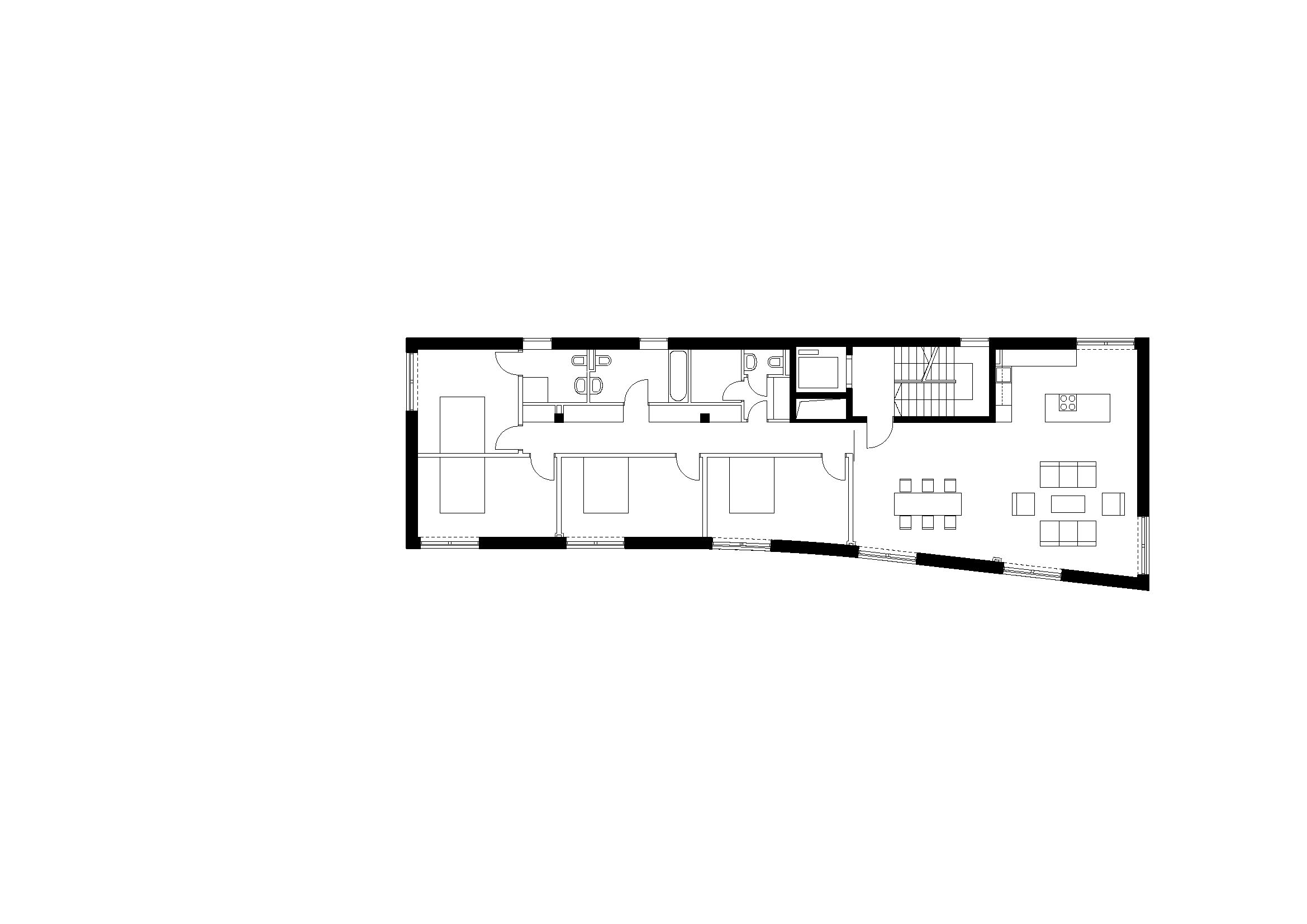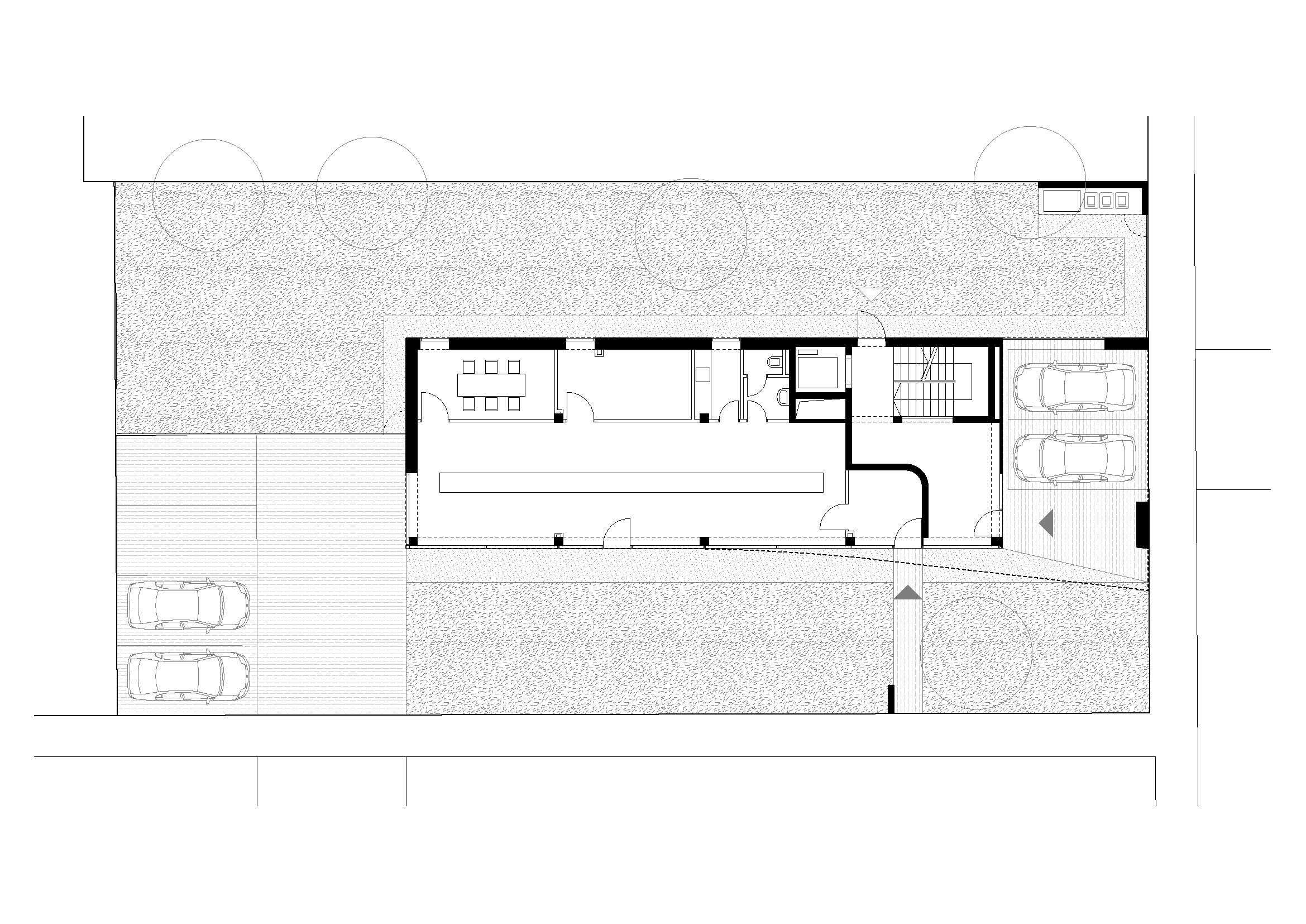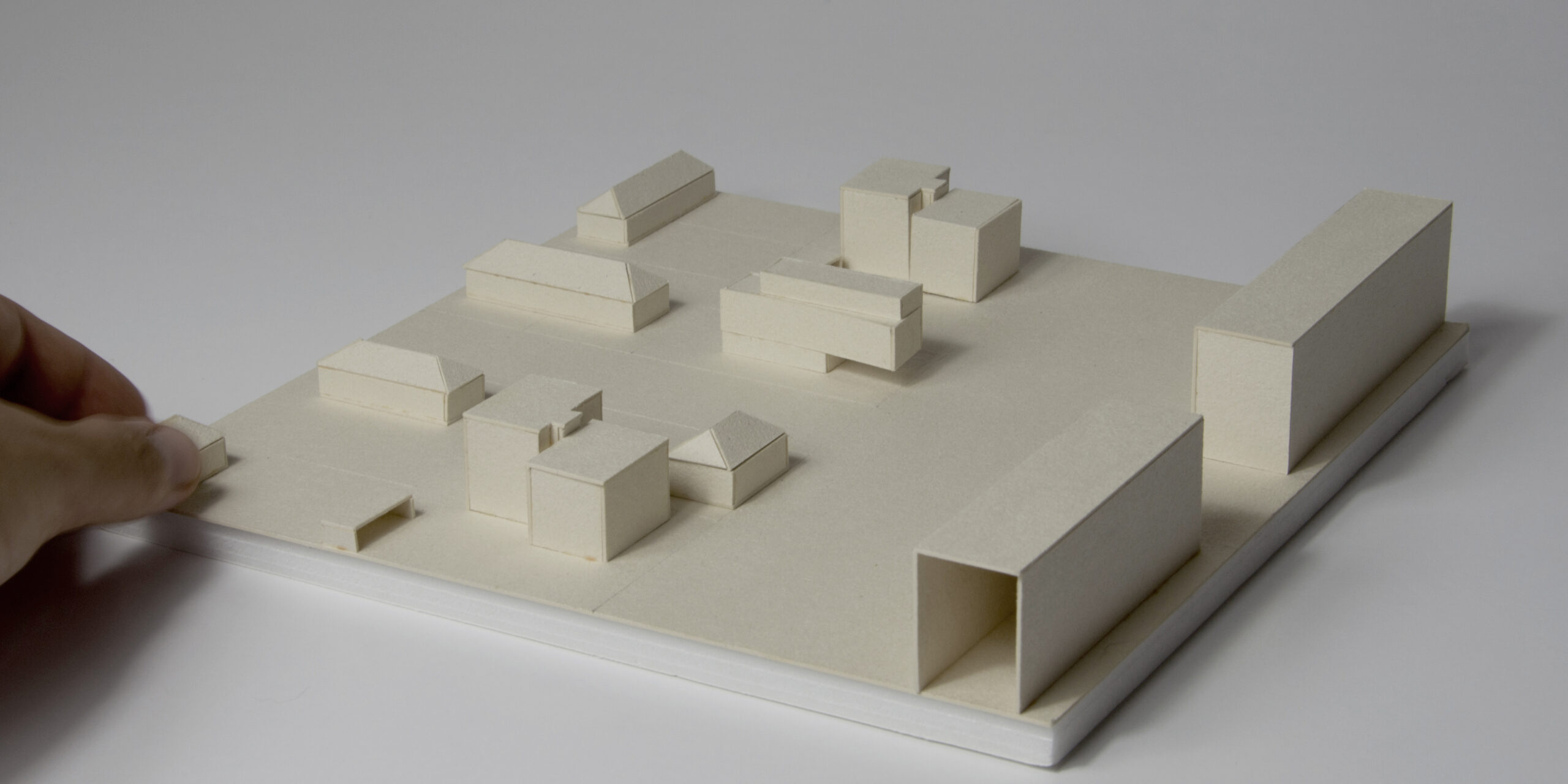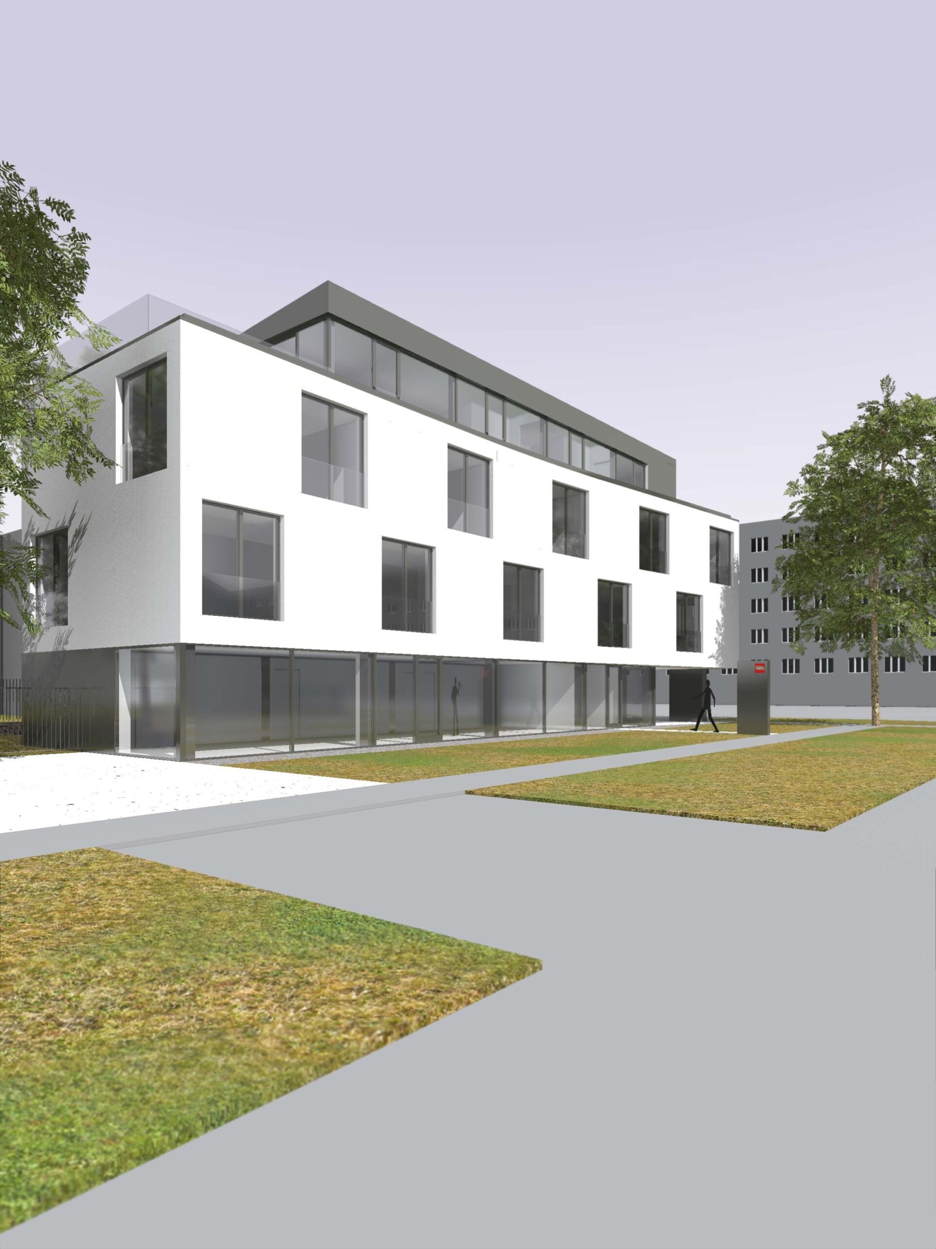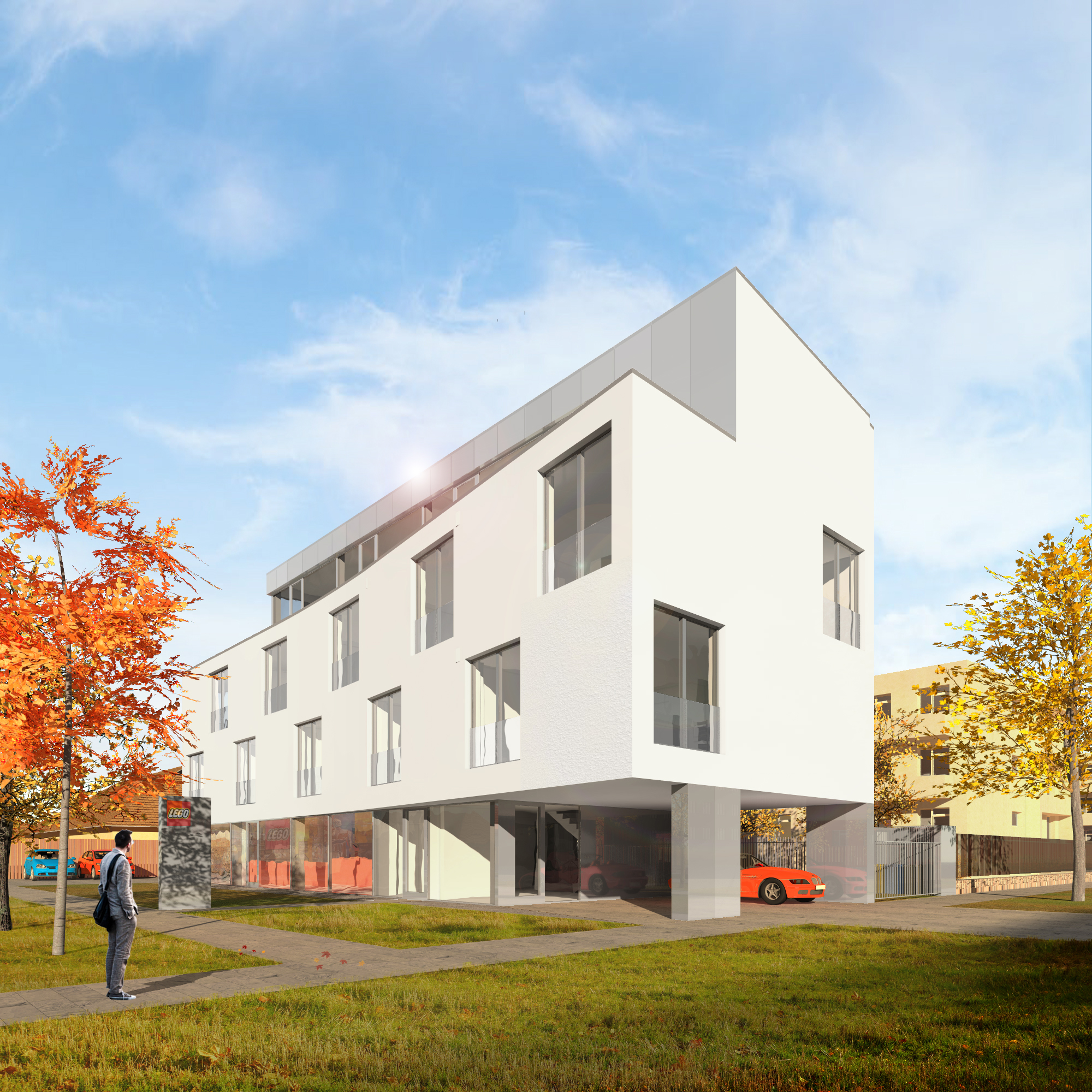 Az általunk tervezett tömeg ezen elvek mentén született: az alaprajzi forma a sarokhelyzetre és a szomszédos családi ház építési vonalára dinamikusan reagál. A földszintet a sarok felől visszahúztuk és körben kikönnyítettük, míg a harmadik emeleti tömeget a Felsőbüki utca és a szomszédos családi ház felől húztuk vissza. Így a lábakra állított háromszintes „fej” a Nagy Lajosnak szól, míg hátrafelé az alaprajzban és magasságban is elfogyó tömeg finoman feloldódik a Vitéztelep fái és házai között.