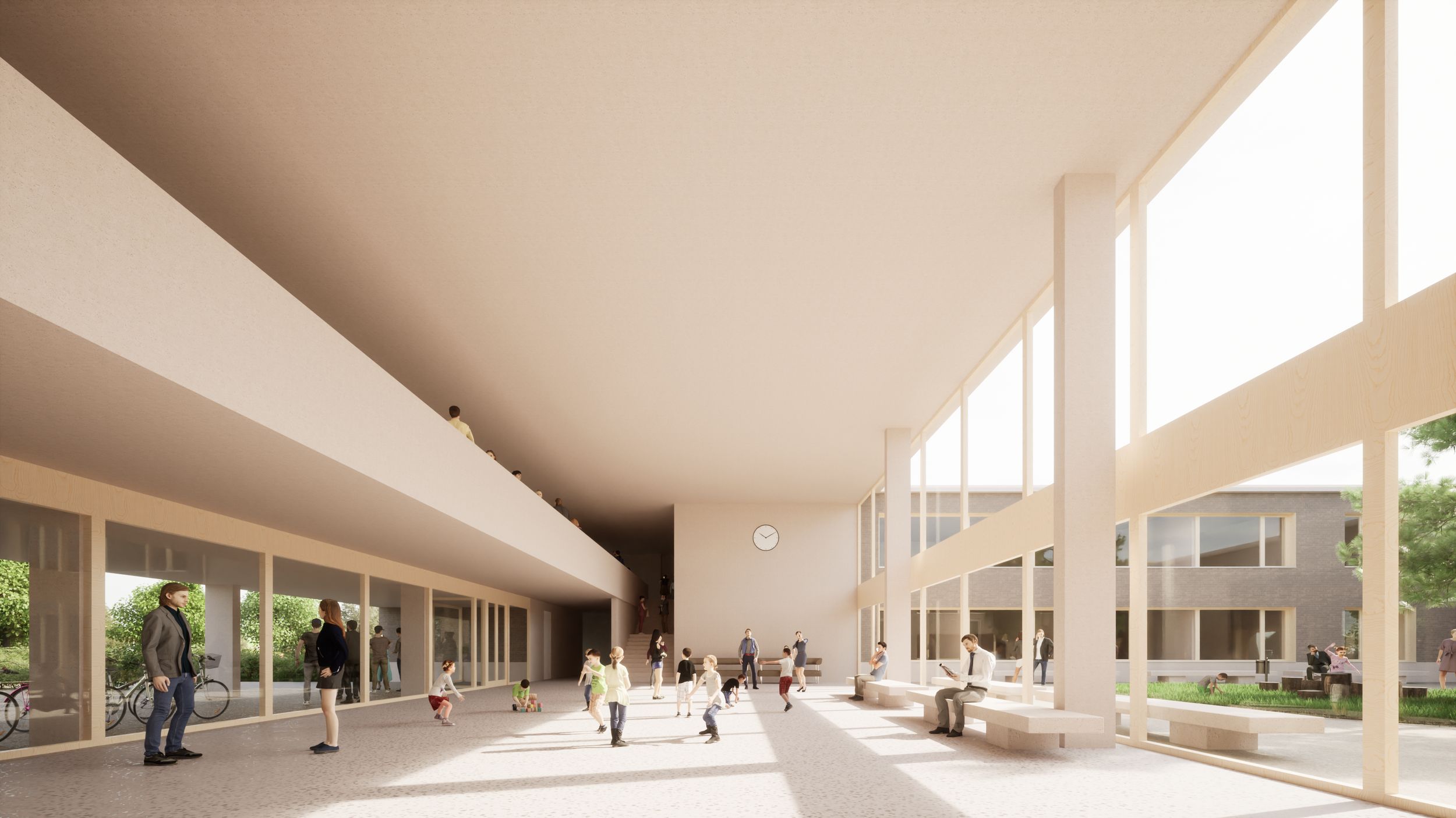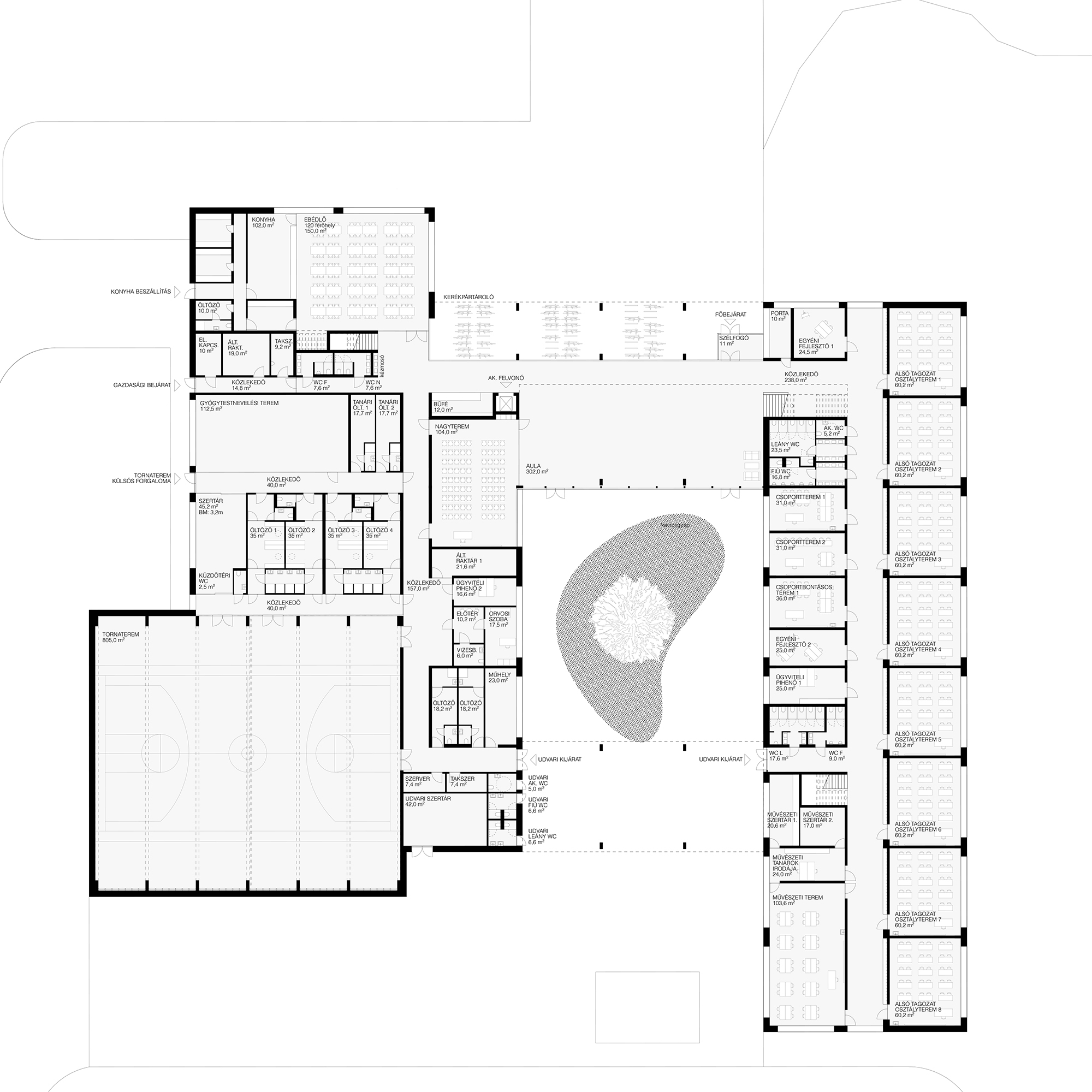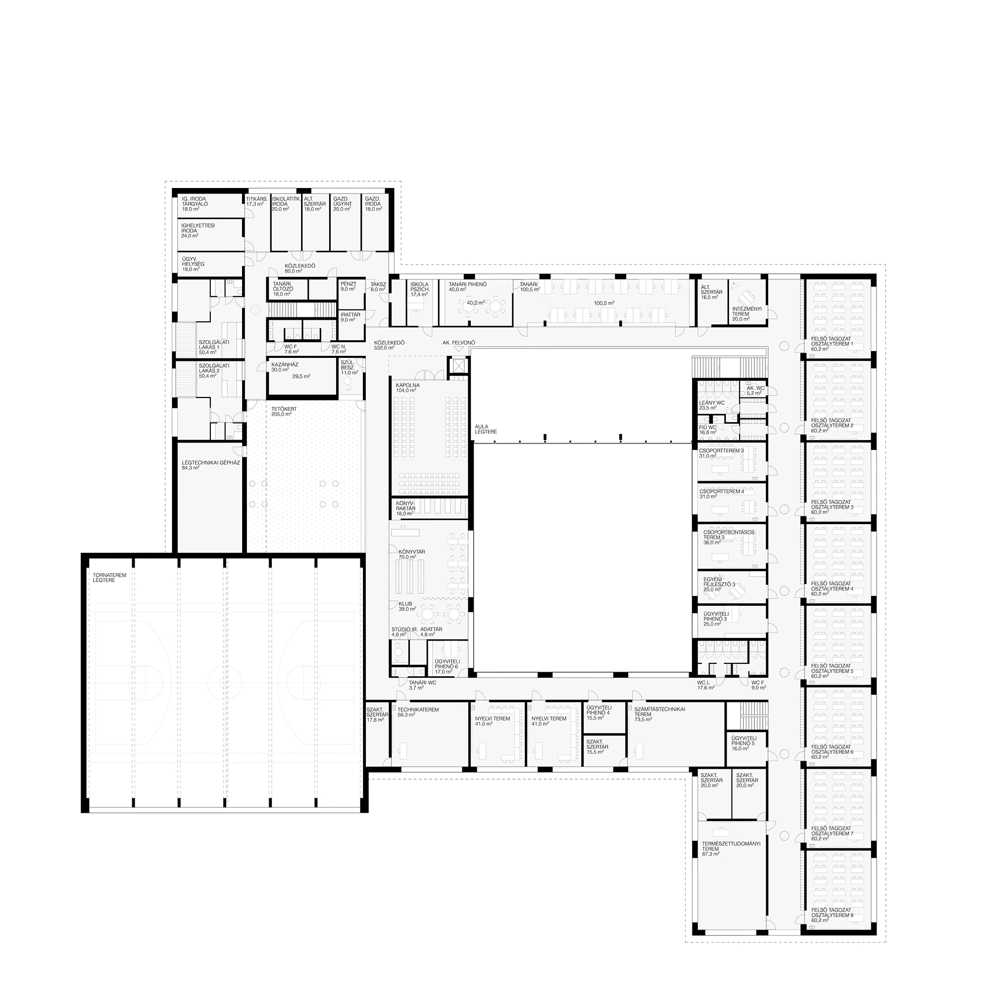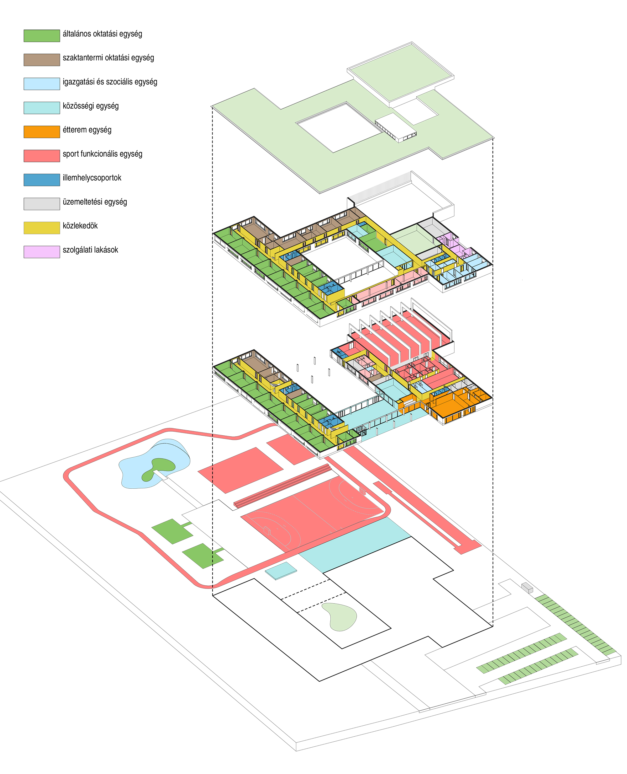 Olyan térbeli rend kialakítását tűztük ki célul, melynek magja a statikus időtlenséget, a magot körülvevő elemek pedig a térbeli és időbeli dinamikus változást jelenítik meg. A belső udvar az oktatási intézmények hagyományos központi szervező eleme, az összetartozás és a befelé forduló elmélyedés szimbóluma. Az épület belső udvar köré szervezett centrális kompozícióját alkotó funkcionális egységek igény szerint szabadon alakíthatók, bővíthetők. Az alakítás a továbbtervezés folyamatára, a bővítés a megépítés utáni jövőbeli igényekre utal. Az oktatási szárny ÉK-i és DNY-i irányban bővíthető például további osztálytermekkel, vagy tanuszodával.