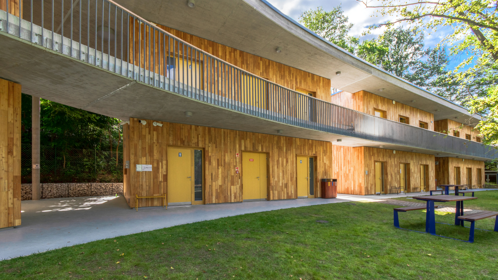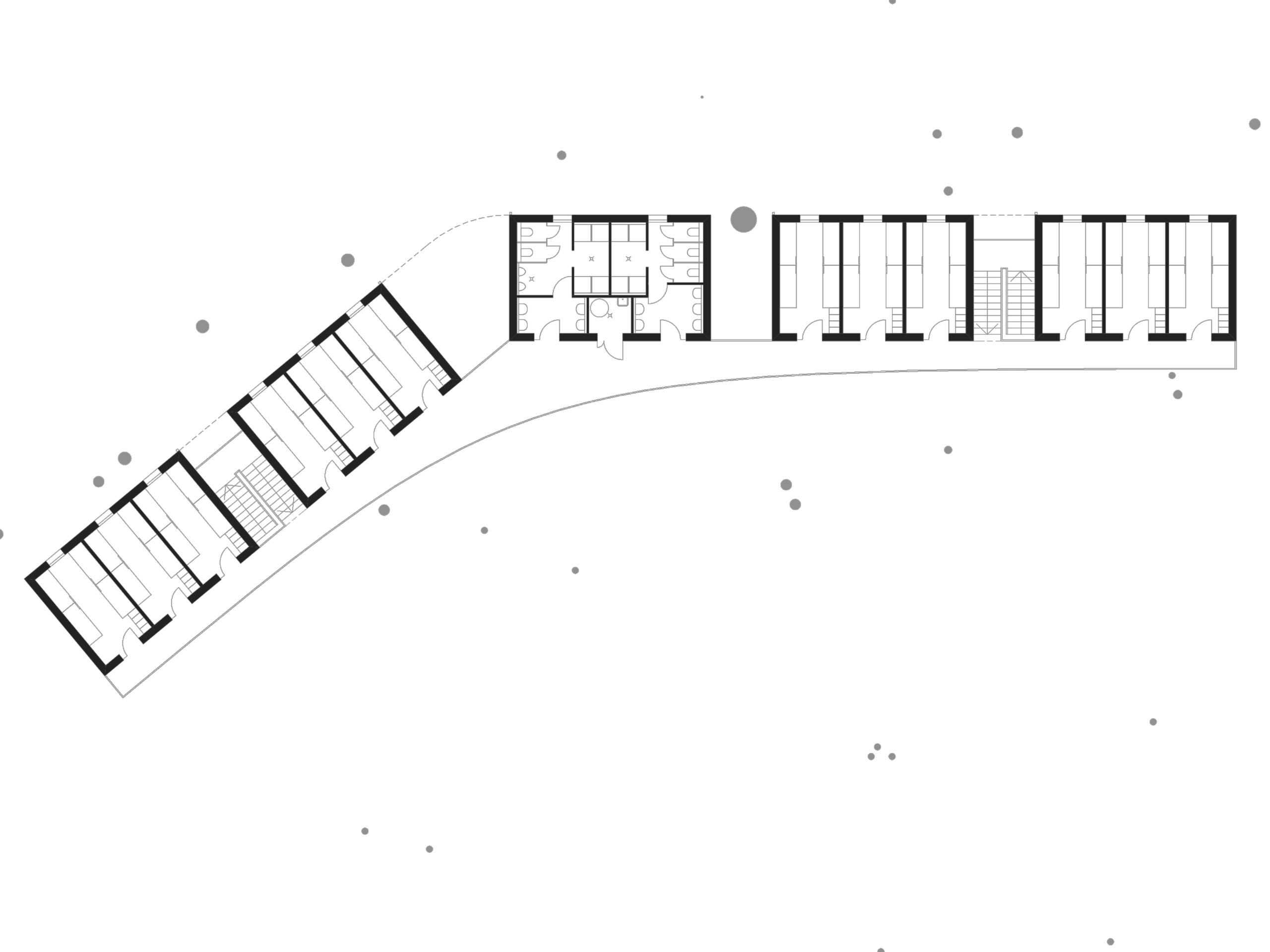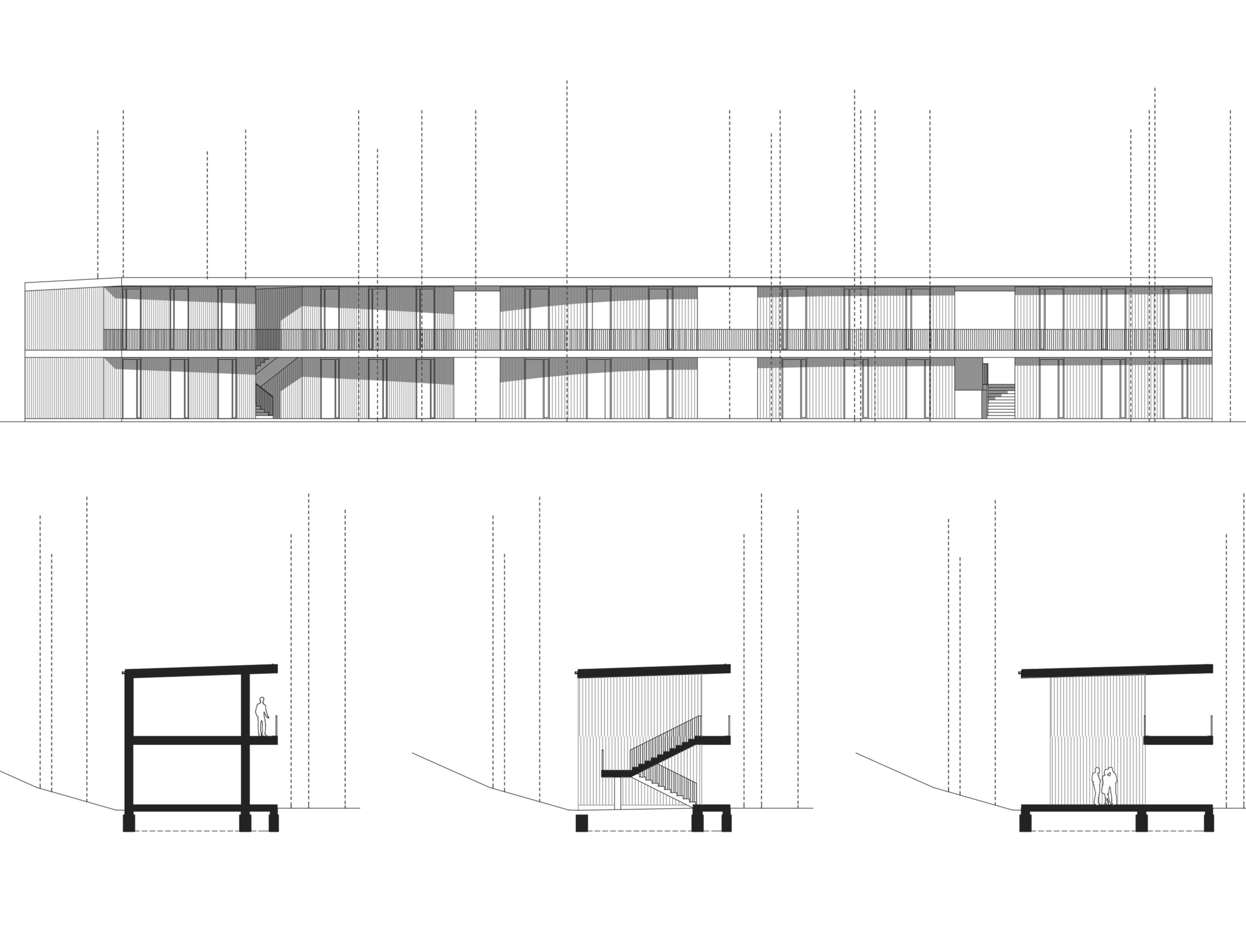 Az új épület kétszintes. Ez tudatos döntés: fontos volt, hogy a növekvő létszám mellett se növekedjen a terület beépítése. A minimális méretűre szerkesztett szobák csak az alvást szolgálják, ahogy a vizesblokkokat is feszesre szabtuk. „Cserébe” a közlekedőket már-már közösségi terekké növeltük és a kertnek, mint nappalinak a fedett-nyitott galériájaként fogalmaztuk meg.