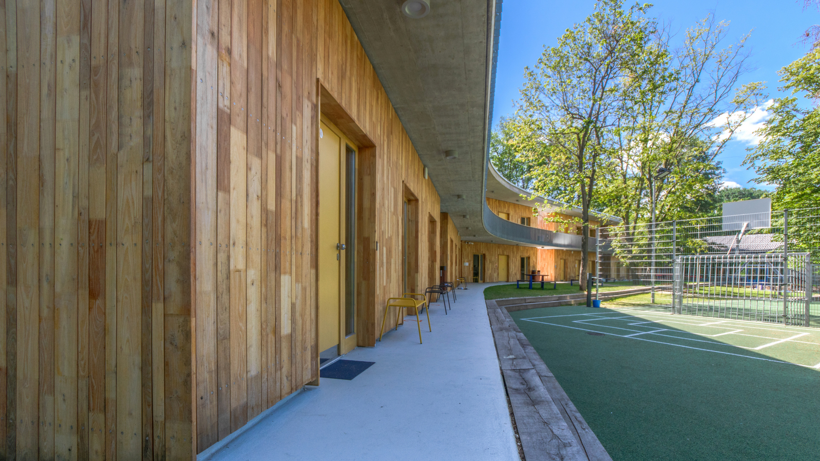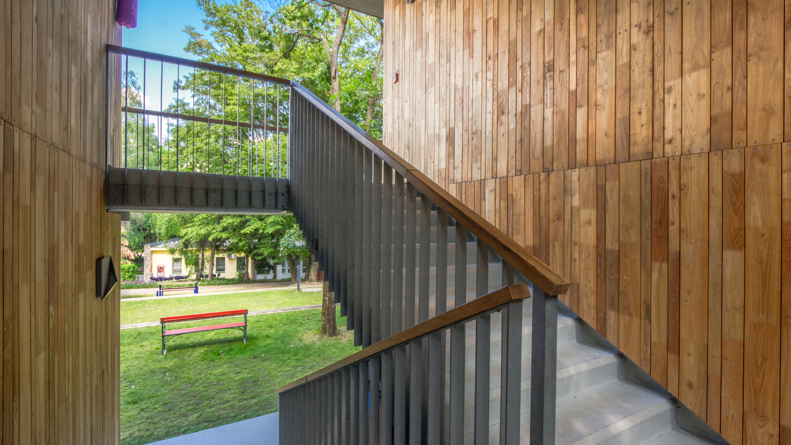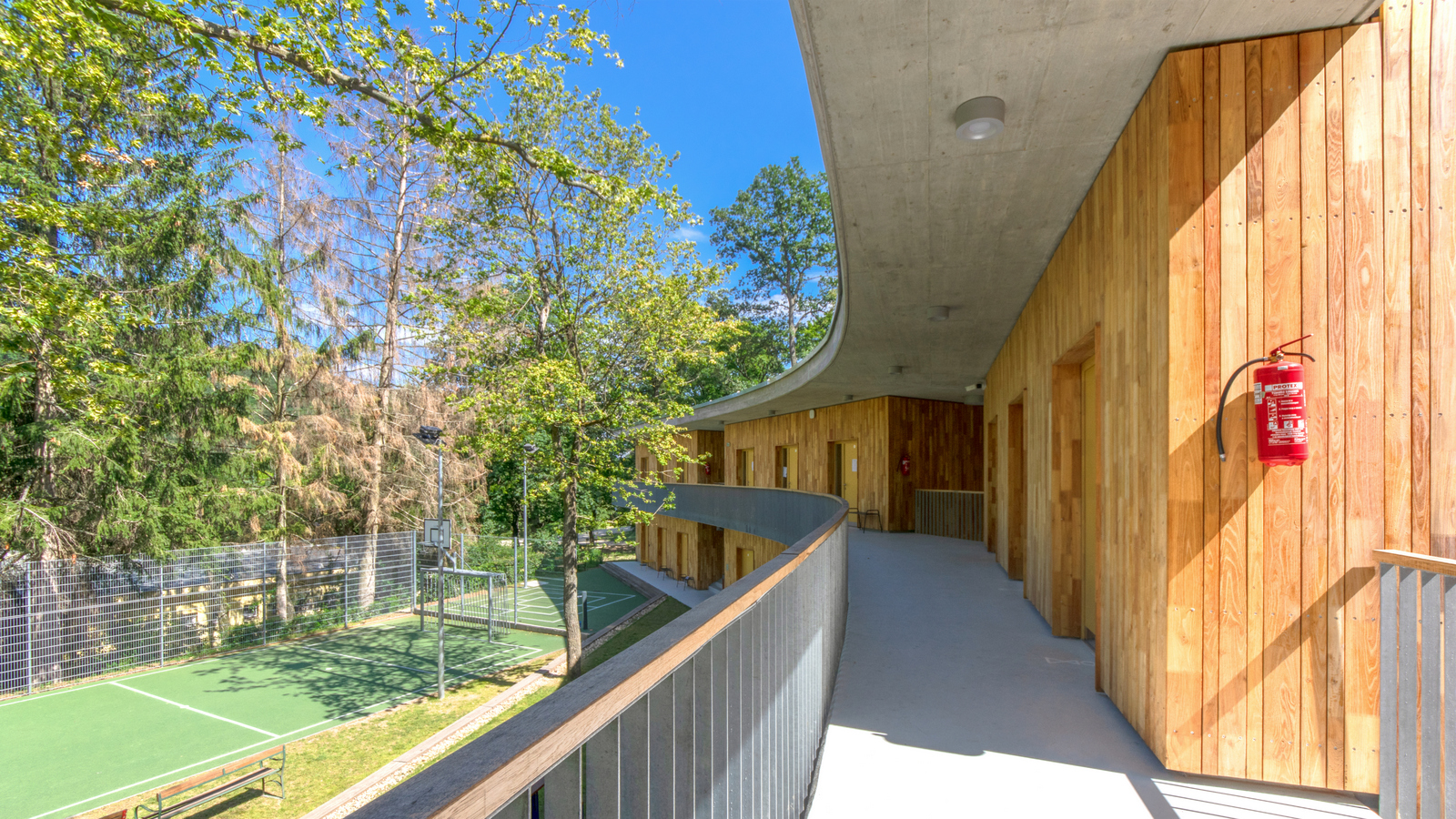 Az új épület kétszintes. Ez tudatos döntés: fontos volt, hogy a növekvő létszám mellett se növekedjen a terület beépítése. A minimális méretűre szerkesztett szobák csak az alvást szolgálják, ahogy a vizesblokkokat is feszesre szabtuk. „Cserébe” a közlekedőket már-már közösségi terekké növeltük és a kertnek, mint nappalinak a fedett-nyitott galériájaként fogalmaztuk meg.