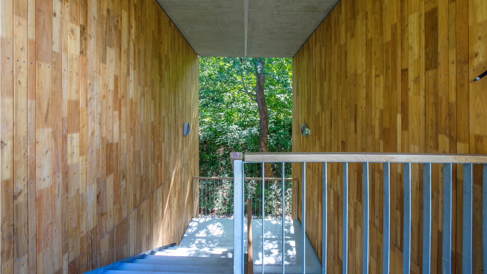 A faburkolatnak kettős szerepe van: az erdei környezettel és az elbontott faházakkal is kapcsolatot teremt. Az egyéb anyagok kiválasztásánál az egyszerűséget és a tartósságot kerestük. A födémek és lépcsők látszóbetonból készülnek, a járófelületek műgyanta burkolatot kapnak, a korlátok és egyéb kiegészítők natúr titáncinkből és tűzihorganyzott acélból készülnek.
