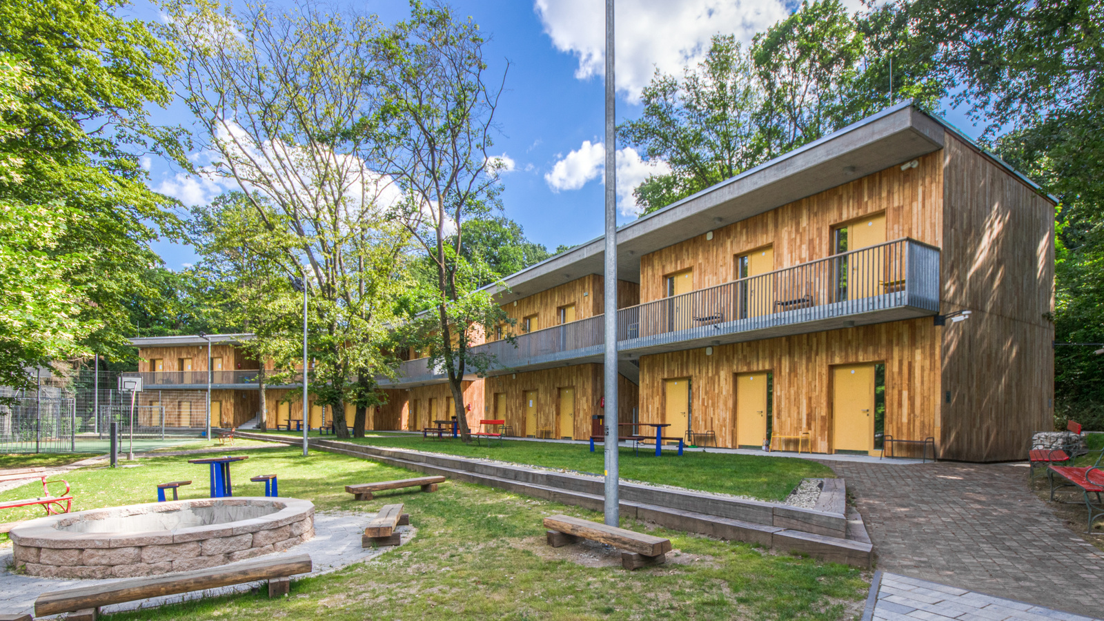 A táborra úgy gondoltunk, mint egy nagy, közös élettérre, egy tisztásra, aminek a határait a természetes és épített elemek harmonikus rendszere jelenti. Bár az építészet hagyományosan belső tereket határoz meg, itt pont az ellenkezőjére törekedtünk: a meglévő épületek és fák között a tábor helyét kerestük, melynek csak egy térfala az új szállásépület.