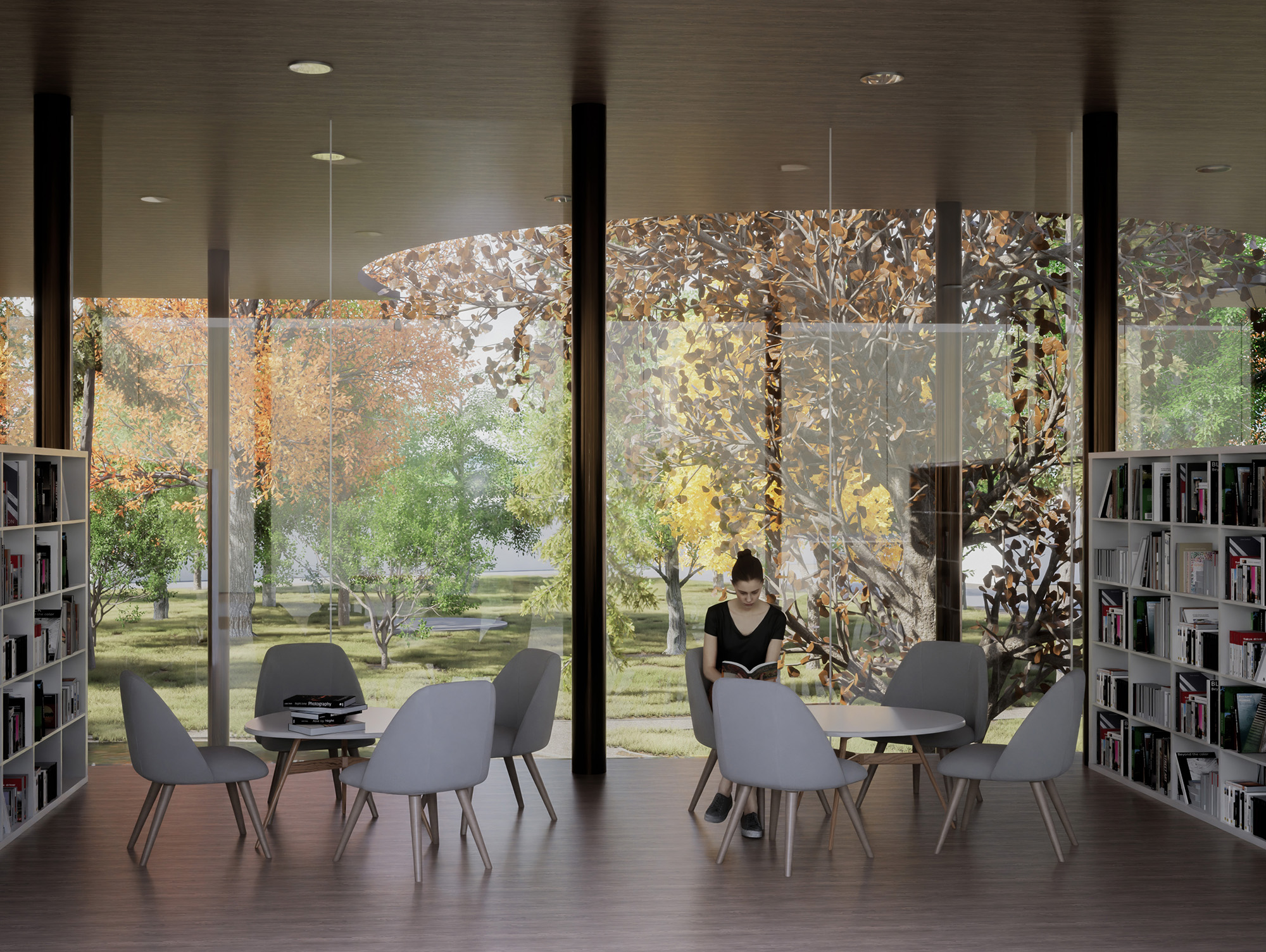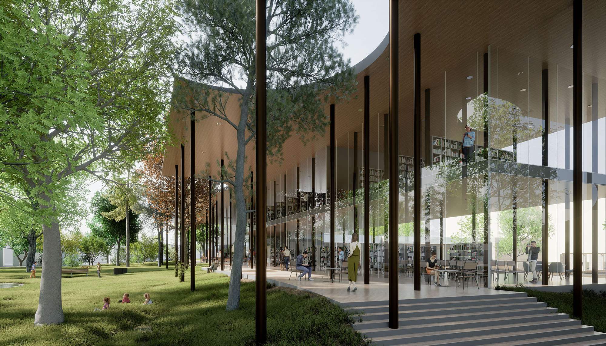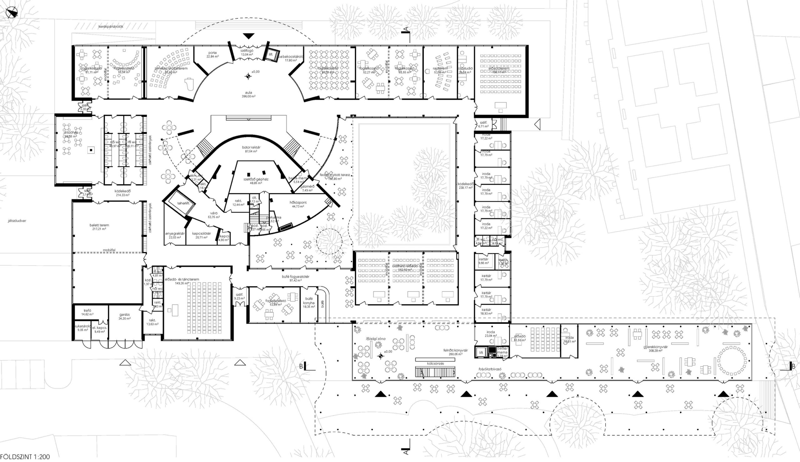 Az épületbe mindkét oldalt be lehet jutni: a város ütőere felől a Tóth Dezső által komponált igen látványos térsoron át, a kert felől pedig a könyvtár széles tornácán és üvegezett terein átszivárogva.