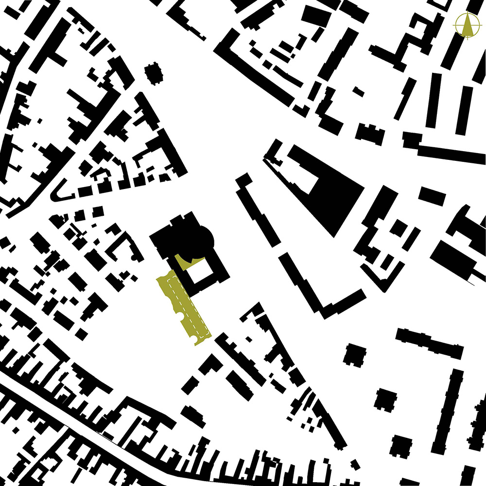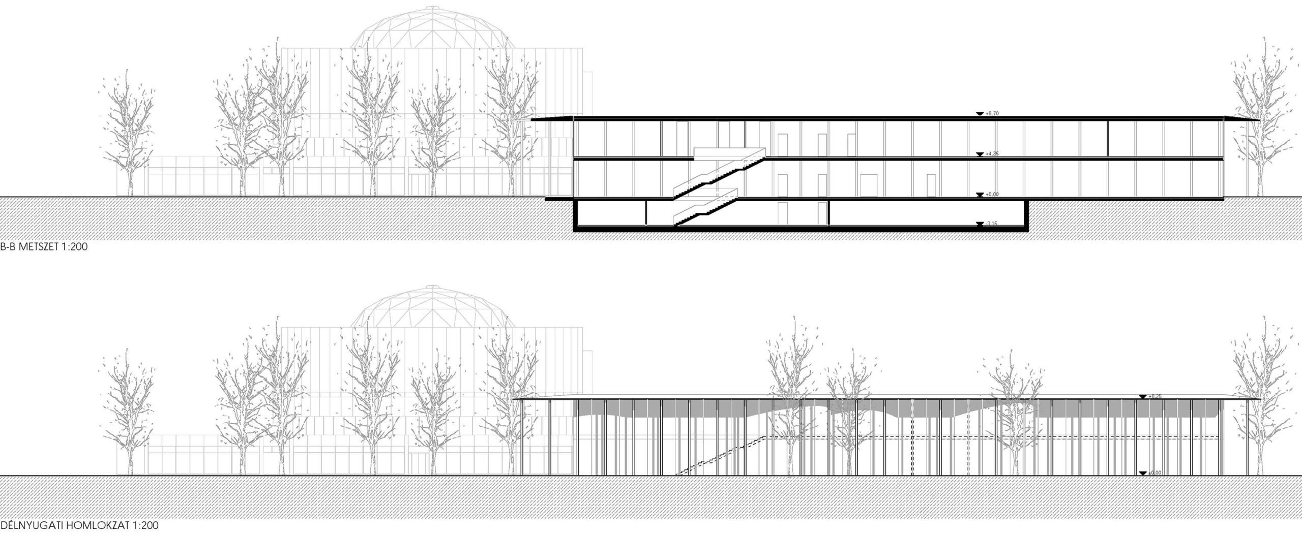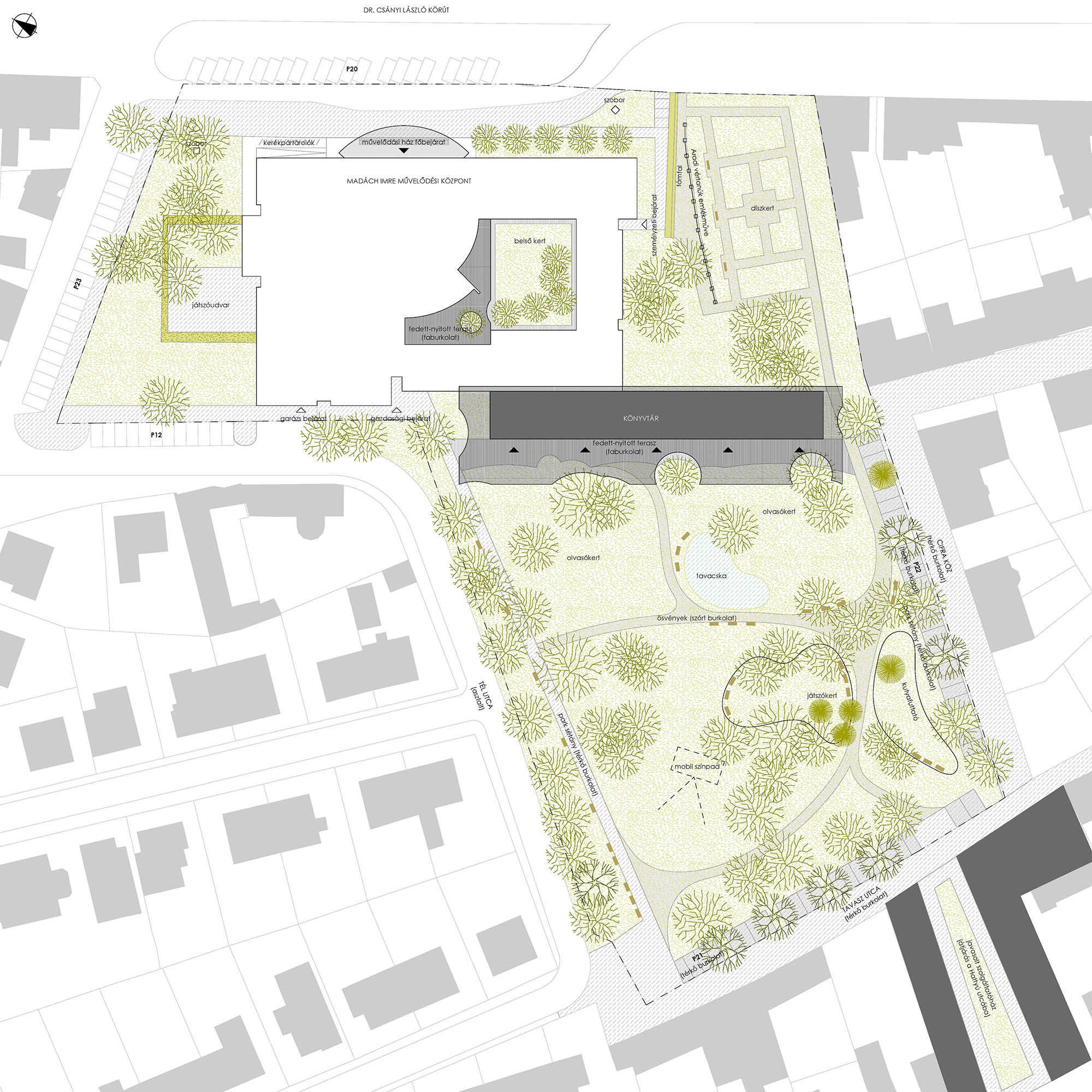 A meglévő épület a Dr. Csányi László körútra néz, ezzel határozottan hátat fordít a Rózsakertnek. A könyvtárunk ennek az ellenkezőjét teszi: egyértelműen a kertre néz, és ezzel hátat fordít a körútnak… és a két ház háta összeér, összenő, végül egy Janus-szerű egységbe rendeződik.