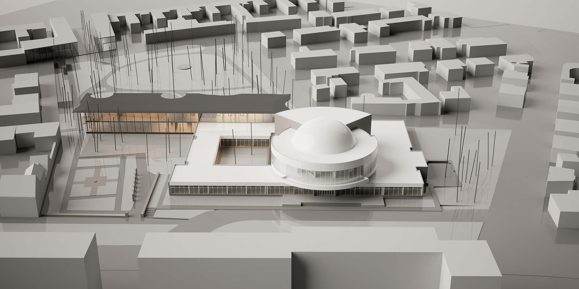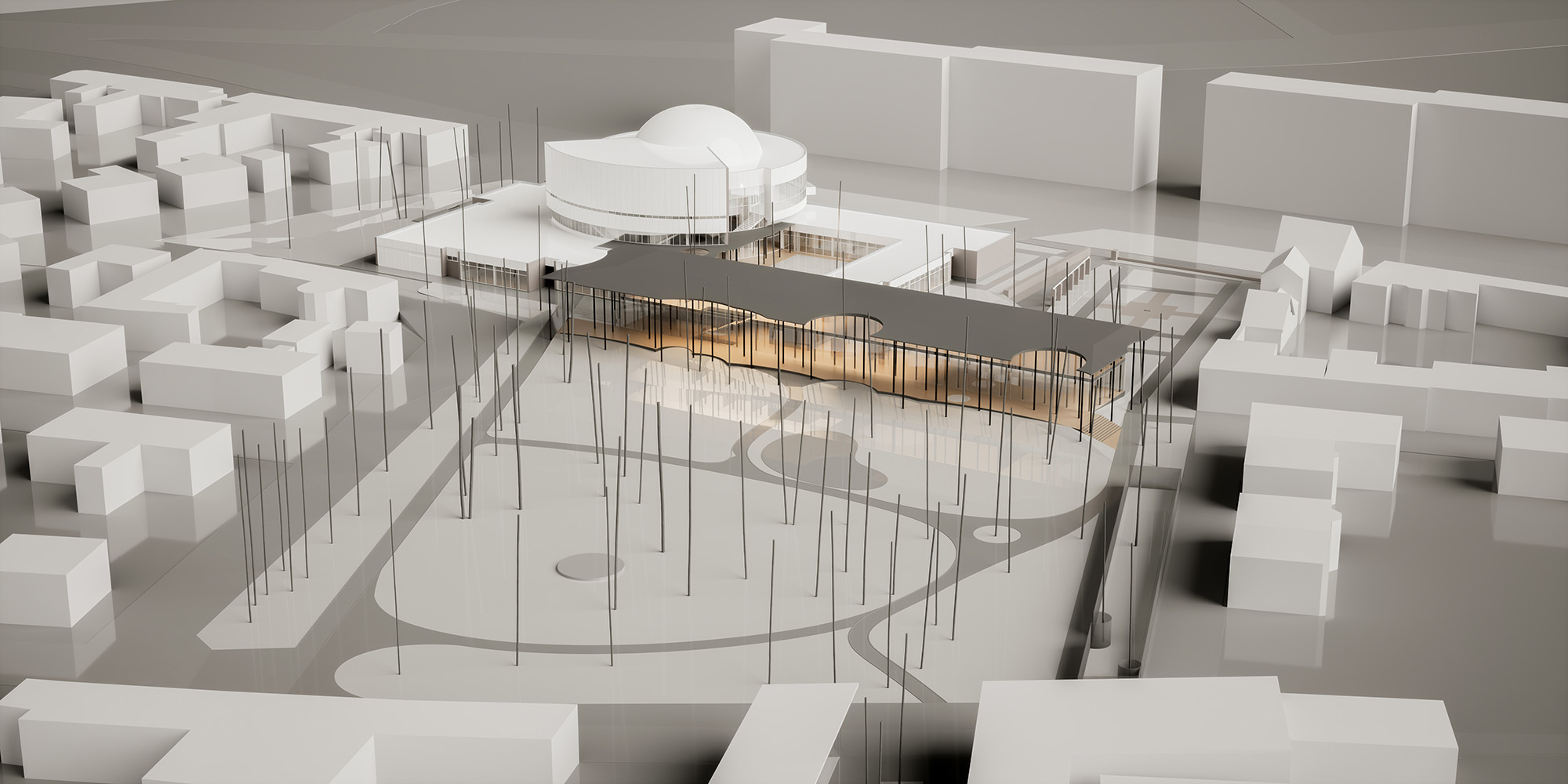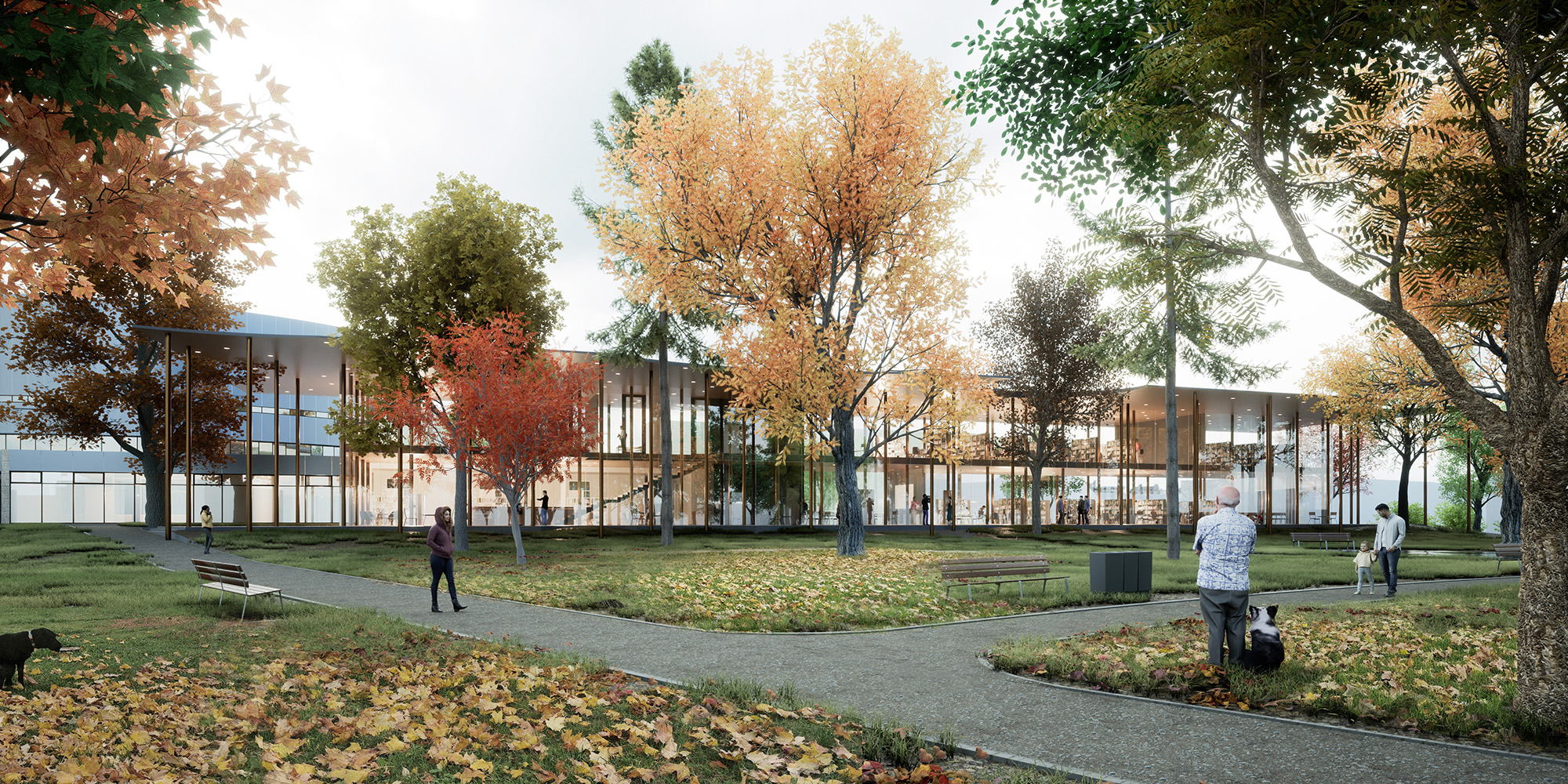 A meglévő épület a Dr. Csányi László körútra néz, ezzel határozottan hátat fordít a Rózsakertnek. A könyvtárunk ennek az ellenkezőjét teszi: egyértelműen a kertre néz, és ezzel hátat fordít a körútnak… és a két ház háta összeér, összenő, végül egy Janus-szerű egységbe rendeződik.