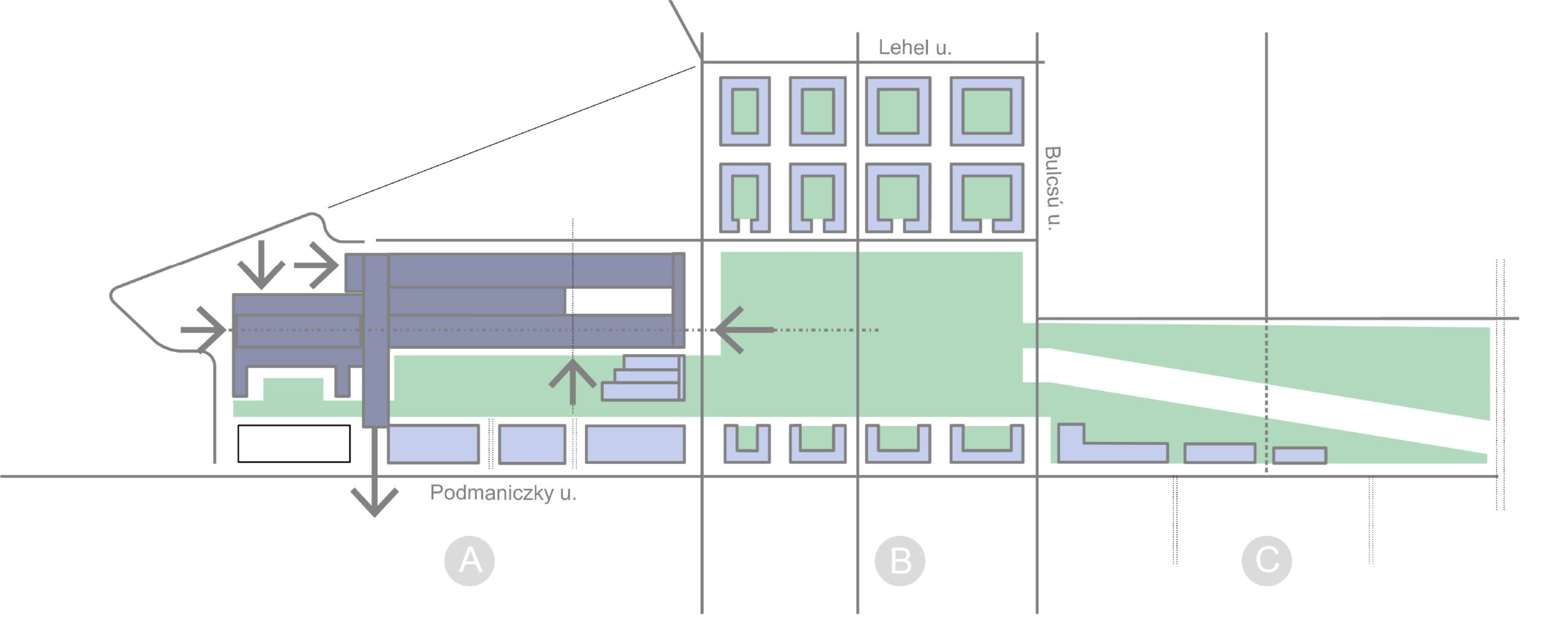 Ebben a szektorban vegyes rendeltetésű középületek és irodák építését javasoljuk. Az épületek a lineáris park szélességéhez igazodóan hátrébb húzva helyezkednek el. A folyamatosságot a lineáris parkba való bejutás érdekében alacsony boltívek alatt kialakított nagyméretű fedett átjárók biztosítják, amelyek folytonossá teszik a Podmanizcky u. felé vezető utcákat. Ugyanakkor a sínek felett egy gyalogos és kerékpáros sétányt javaslunk, amely összeköti a VI. és XIII. kerületet.