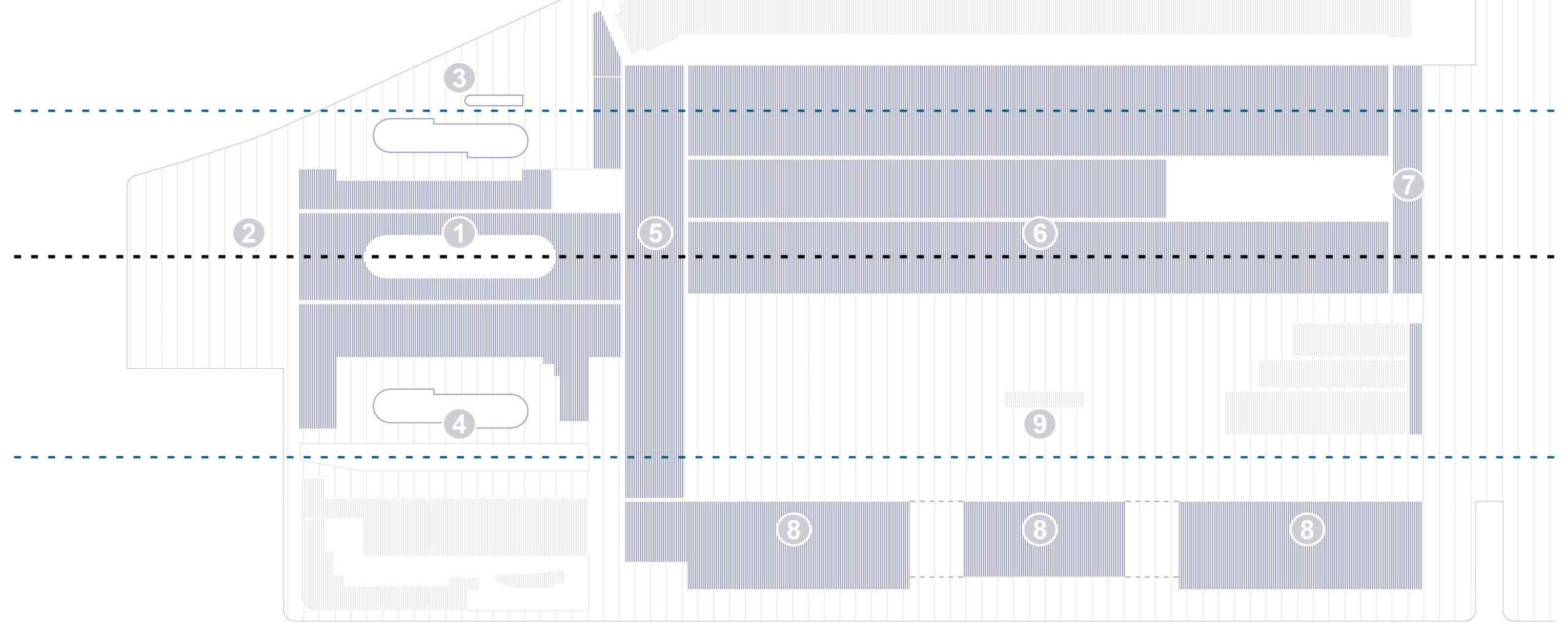 -2. szintek között, ahol az új peronok létesülnek, mely által a Vágánycsarnok vasúti jellege megőrizhető. A vonatok áthaladása és a vasúti közlekedéssel való aktív térbeli kapcsolat révén a Nyugati Pályaudvar Eiffel Csarnoka továbbra is vasútállomás marad.