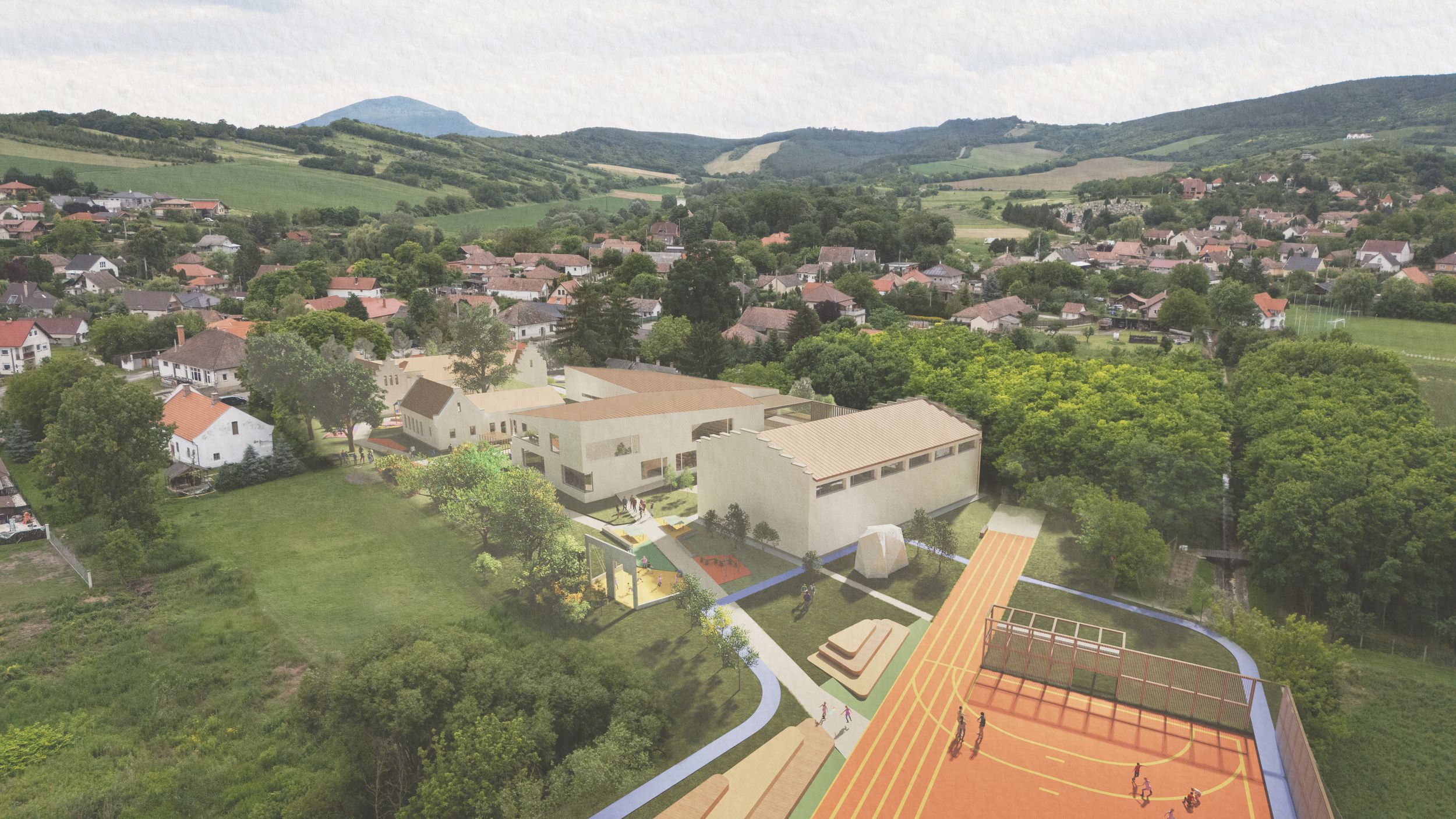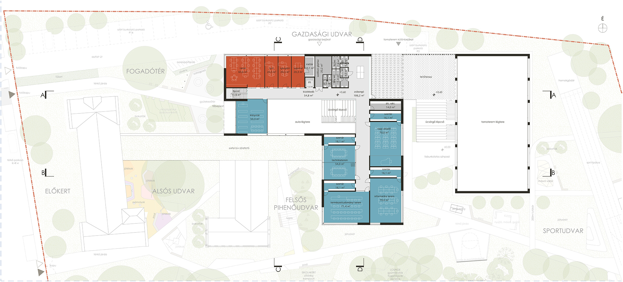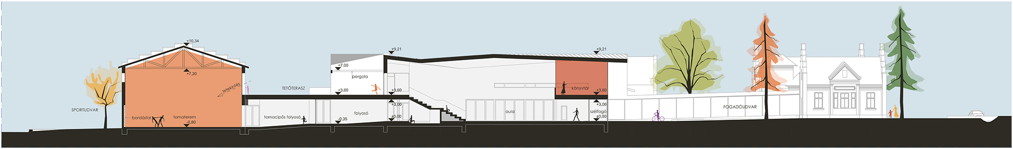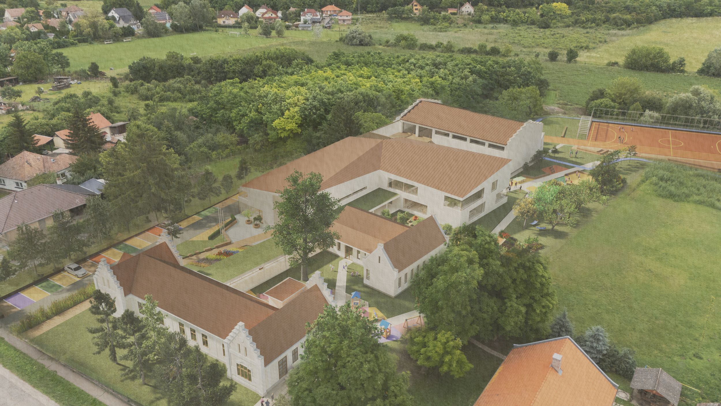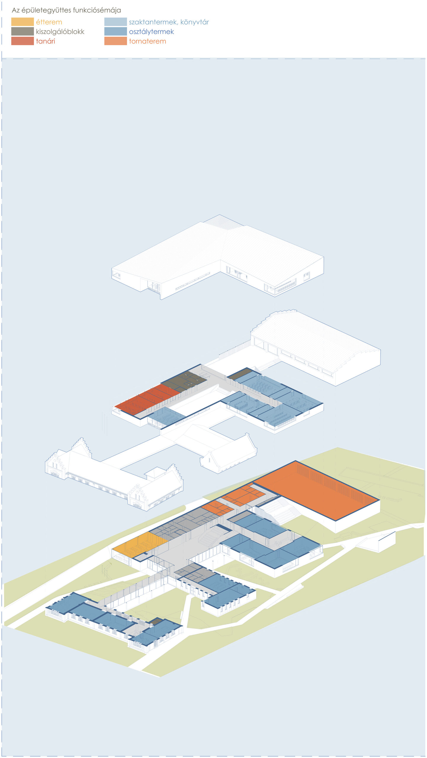 Több eszközzel is próbáltuk „szelídíteni” az épületegyüttes érzékelhető tömegét. Erre egyik eszközünk maga a pavilonos építészeti koncepció, mellyel, ha nem is falusi, de még elfogadható méretű egységekre bontottuk az épületet. Másik eszközünk, hogy az új, kétszintes tömeget a telken hátrahúztuk, a hozzá leginkább hasonló tornaterem közelébe, minél távolabb az Evva-kastélytól. Magát az új épületet építészeti eszközökkel is „lebontjuk”: ezt segíti az L-alakú forma, az oromfalakat nélkülöző, alacsony hajlású tető, a kevés, de nagy megnyitások.