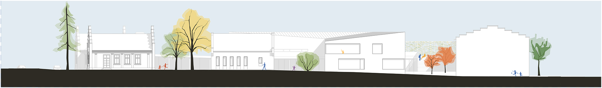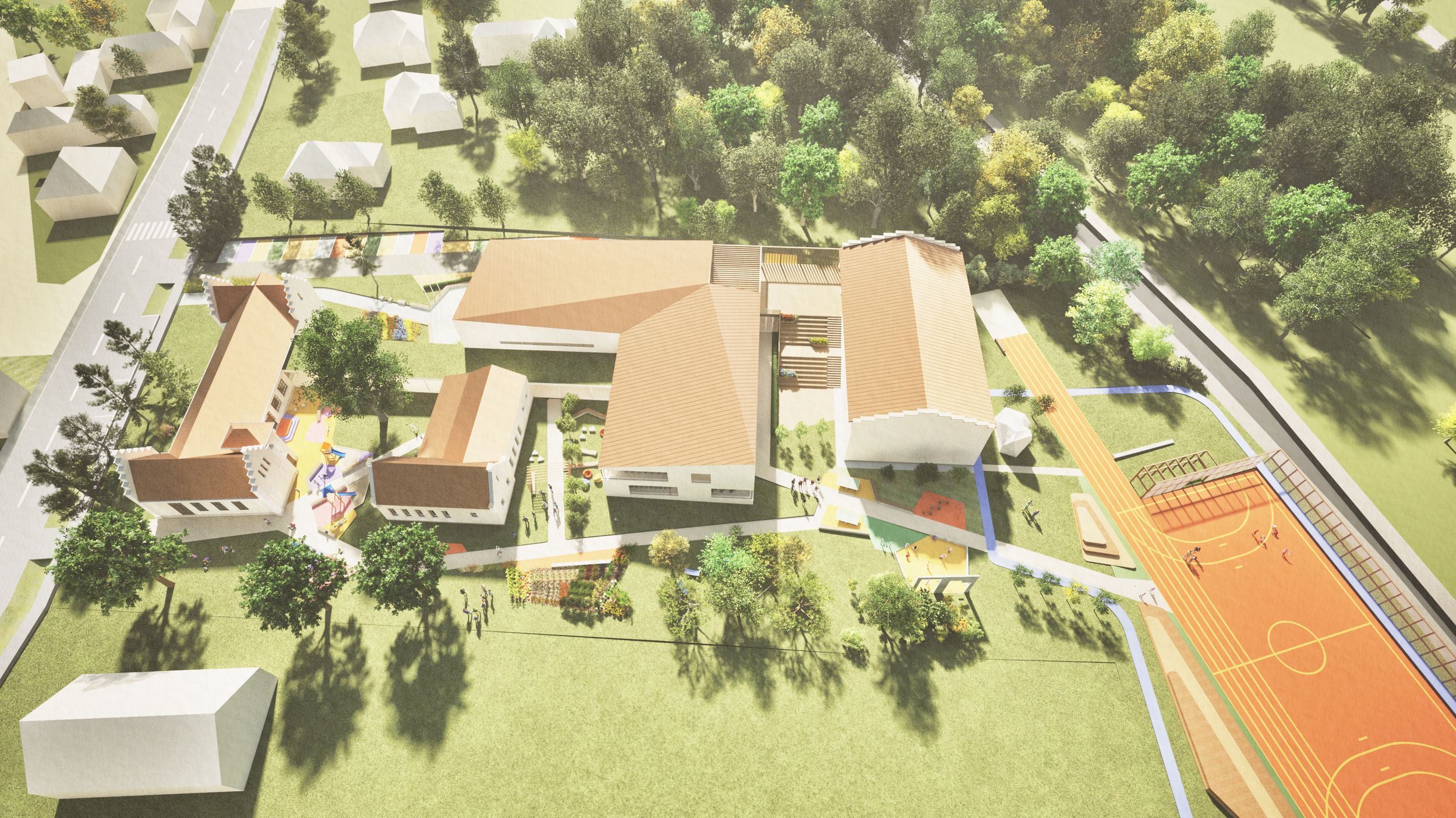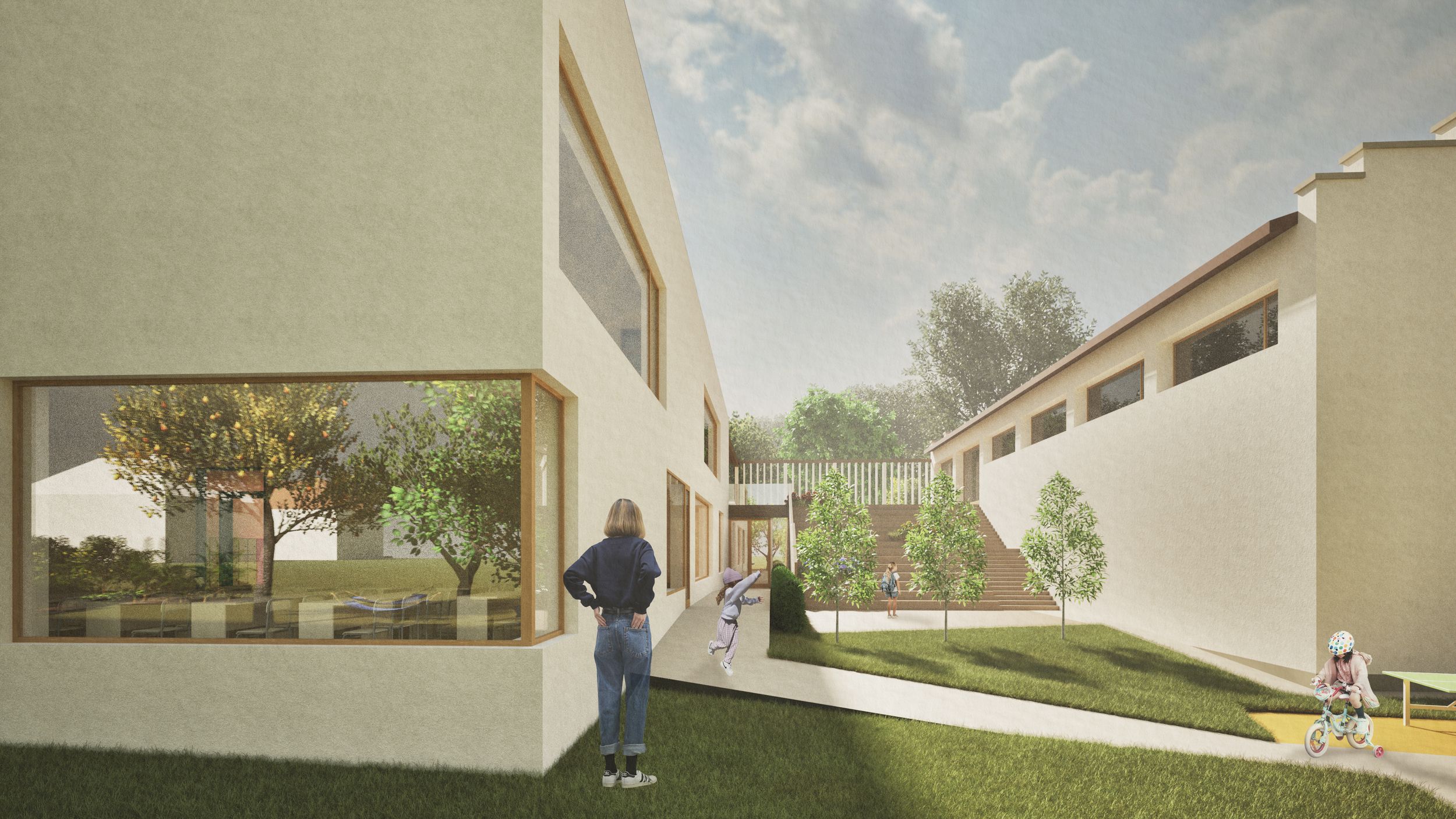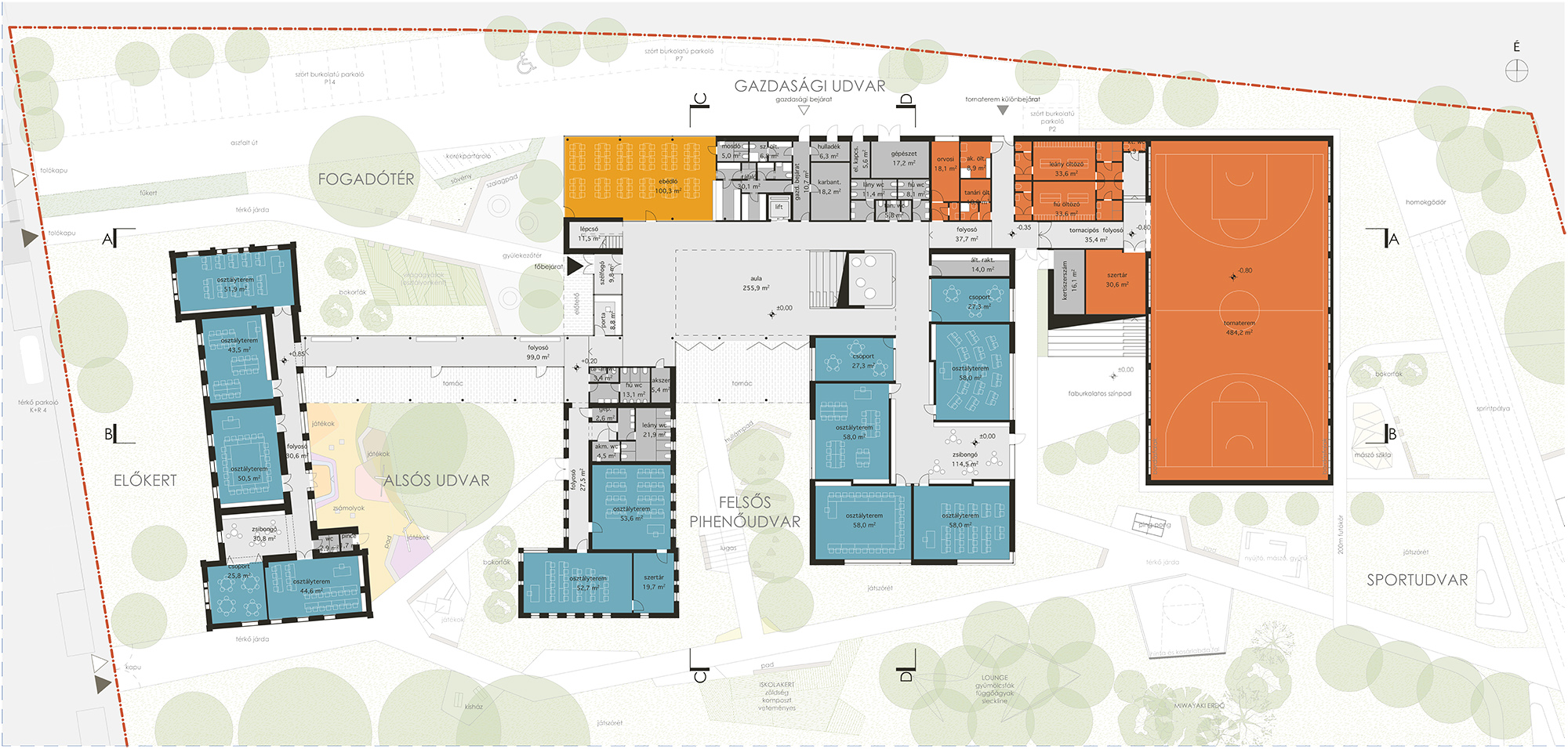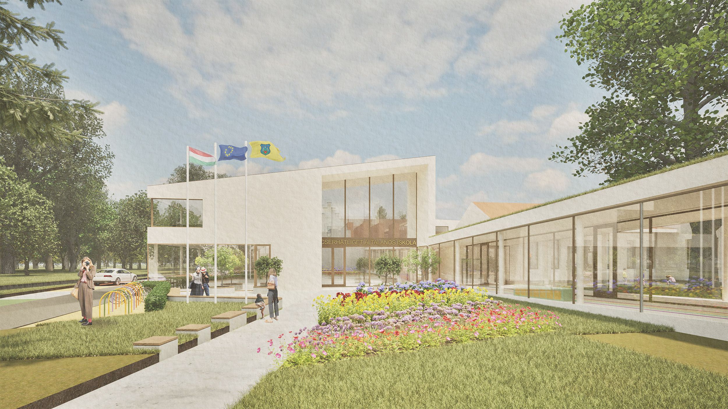 Több eszközzel is próbáltuk „szelídíteni” az épületegyüttes érzékelhető tömegét. Erre egyik eszközünk maga a pavilonos építészeti koncepció, mellyel, ha nem is falusi, de még elfogadható méretű egységekre bontottuk az épületet. Másik eszközünk, hogy az új, kétszintes tömeget a telken hátrahúztuk, a hozzá leginkább hasonló tornaterem közelébe, minél távolabb az Evva-kastélytól. Magát az új épületet építészeti eszközökkel is „lebontjuk”: ezt segíti az L-alakú forma, az oromfalakat nélkülöző, alacsony hajlású tető, a kevés, de nagy megnyitások.