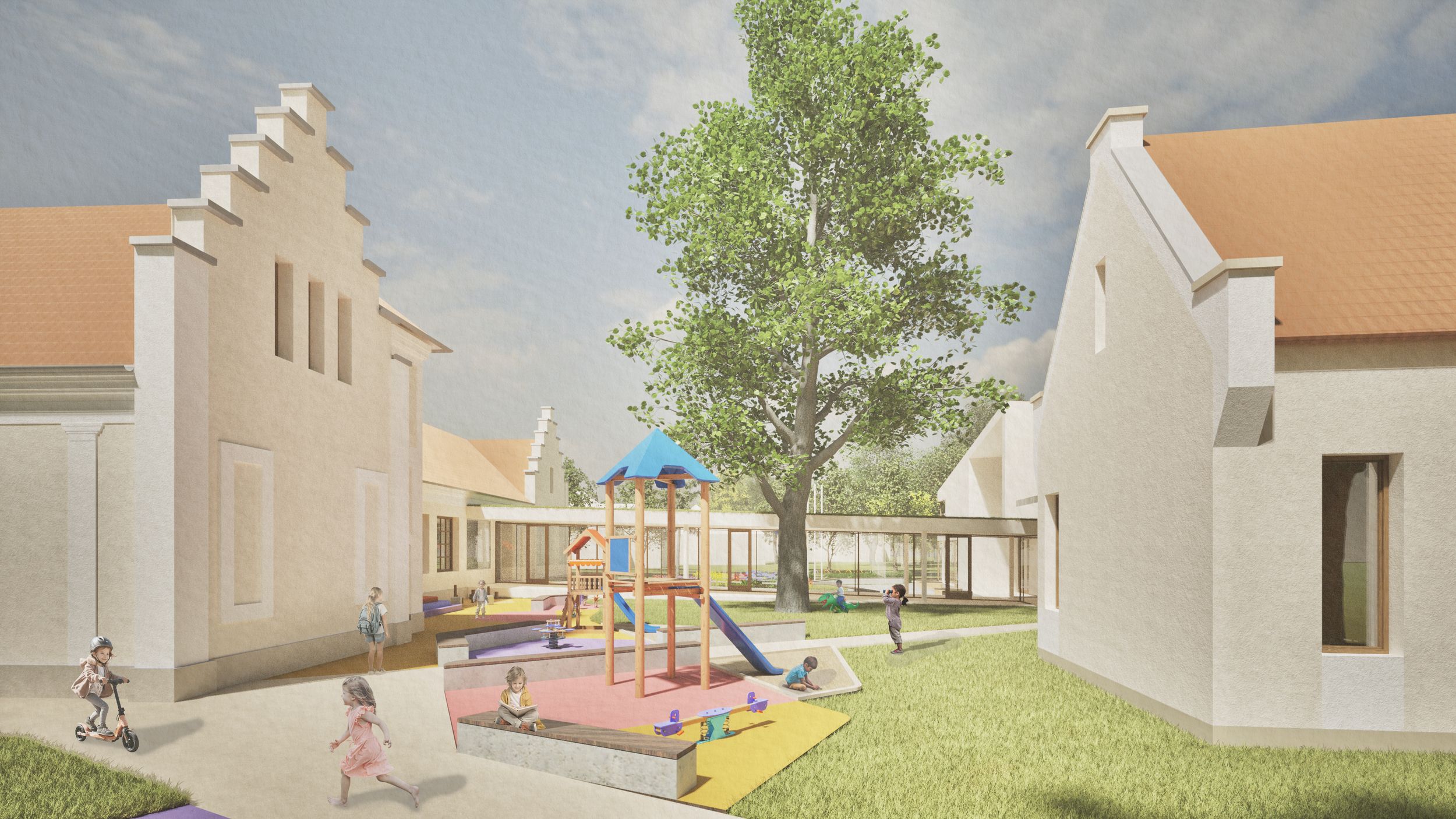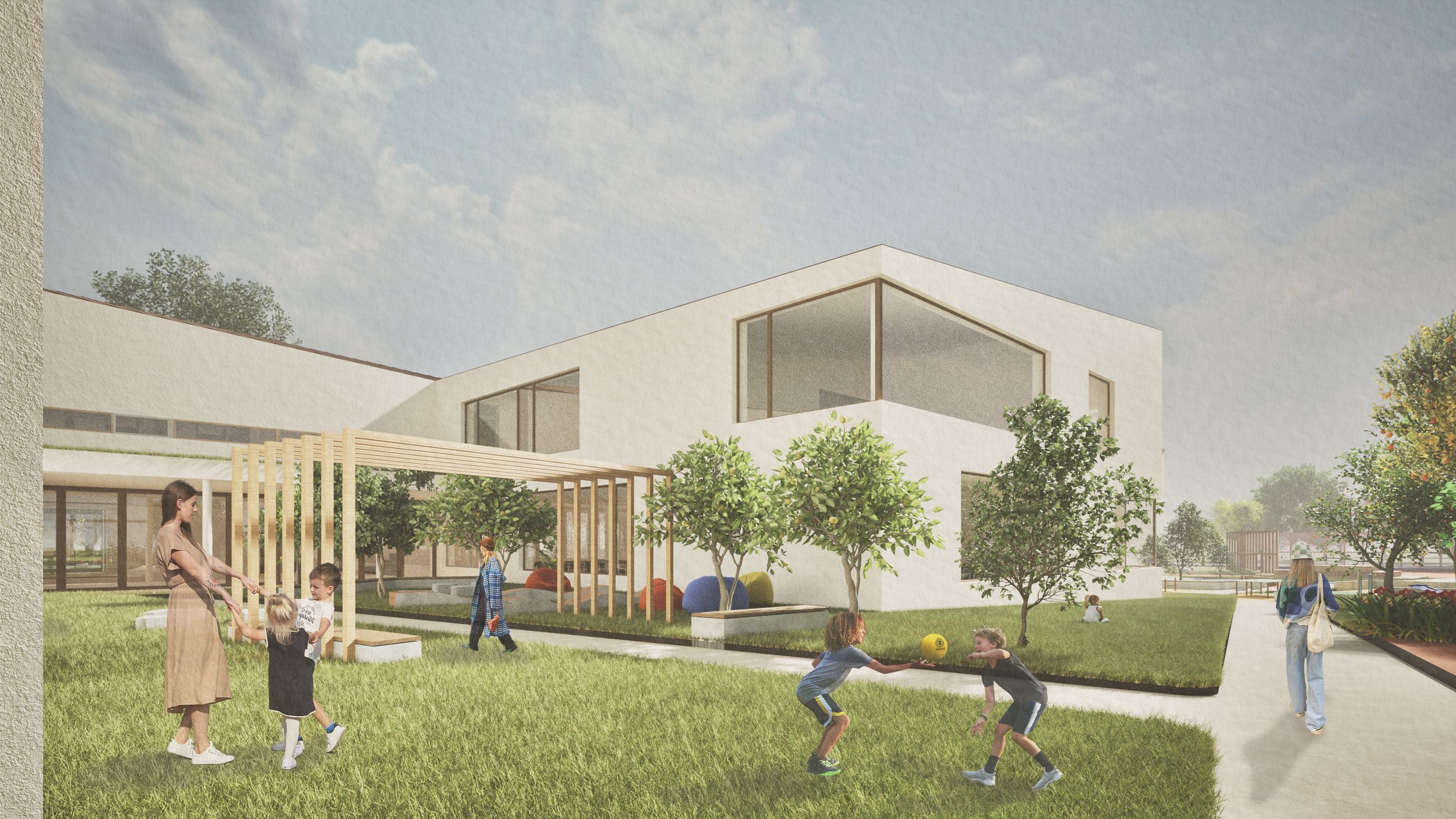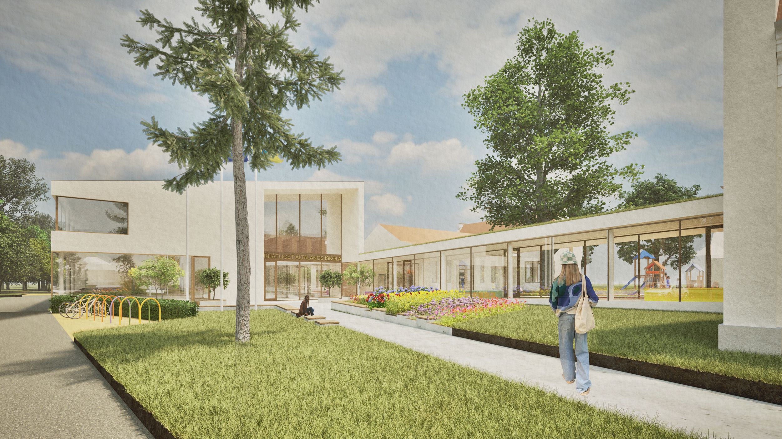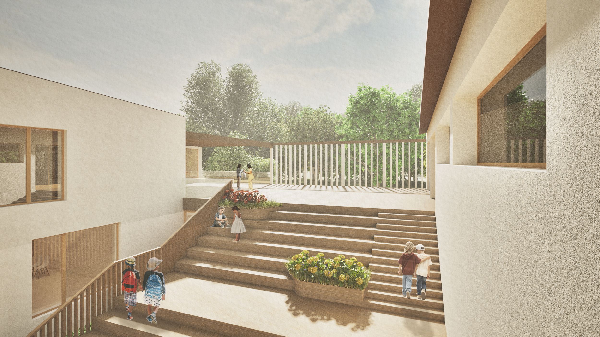 Több eszközzel is próbáltuk „szelídíteni” az épületegyüttes érzékelhető tömegét. Erre egyik eszközünk maga a pavilonos építészeti koncepció, mellyel, ha nem is falusi, de még elfogadható méretű egységekre bontottuk az épületet. Másik eszközünk, hogy az új, kétszintes tömeget a telken hátrahúztuk, a hozzá leginkább hasonló tornaterem közelébe, minél távolabb az Evva-kastélytól. Magát az új épületet építészeti eszközökkel is „lebontjuk”: ezt segíti az L-alakú forma, az oromfalakat nélkülöző, alacsony hajlású tető, a kevés, de nagy megnyitások.