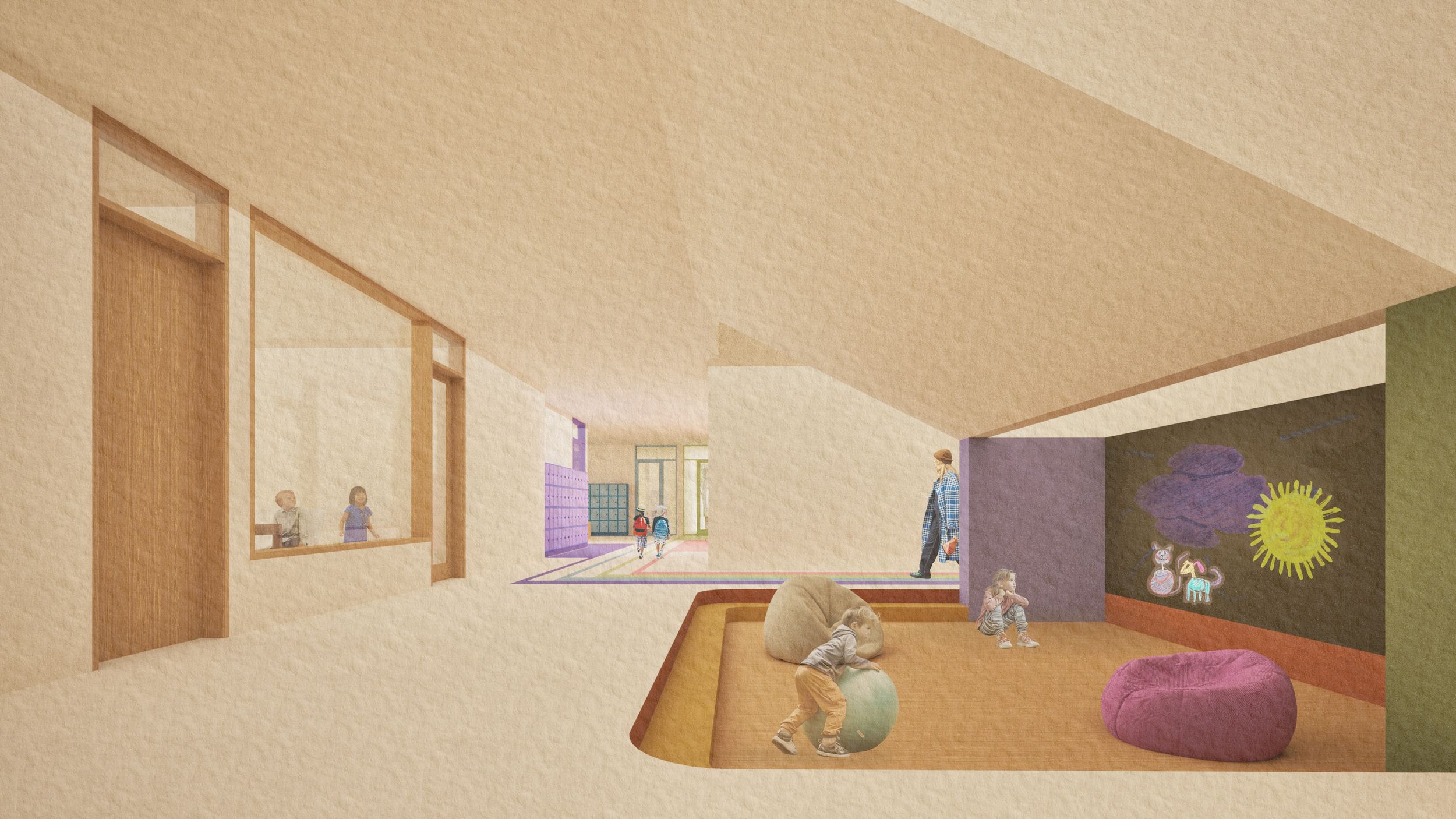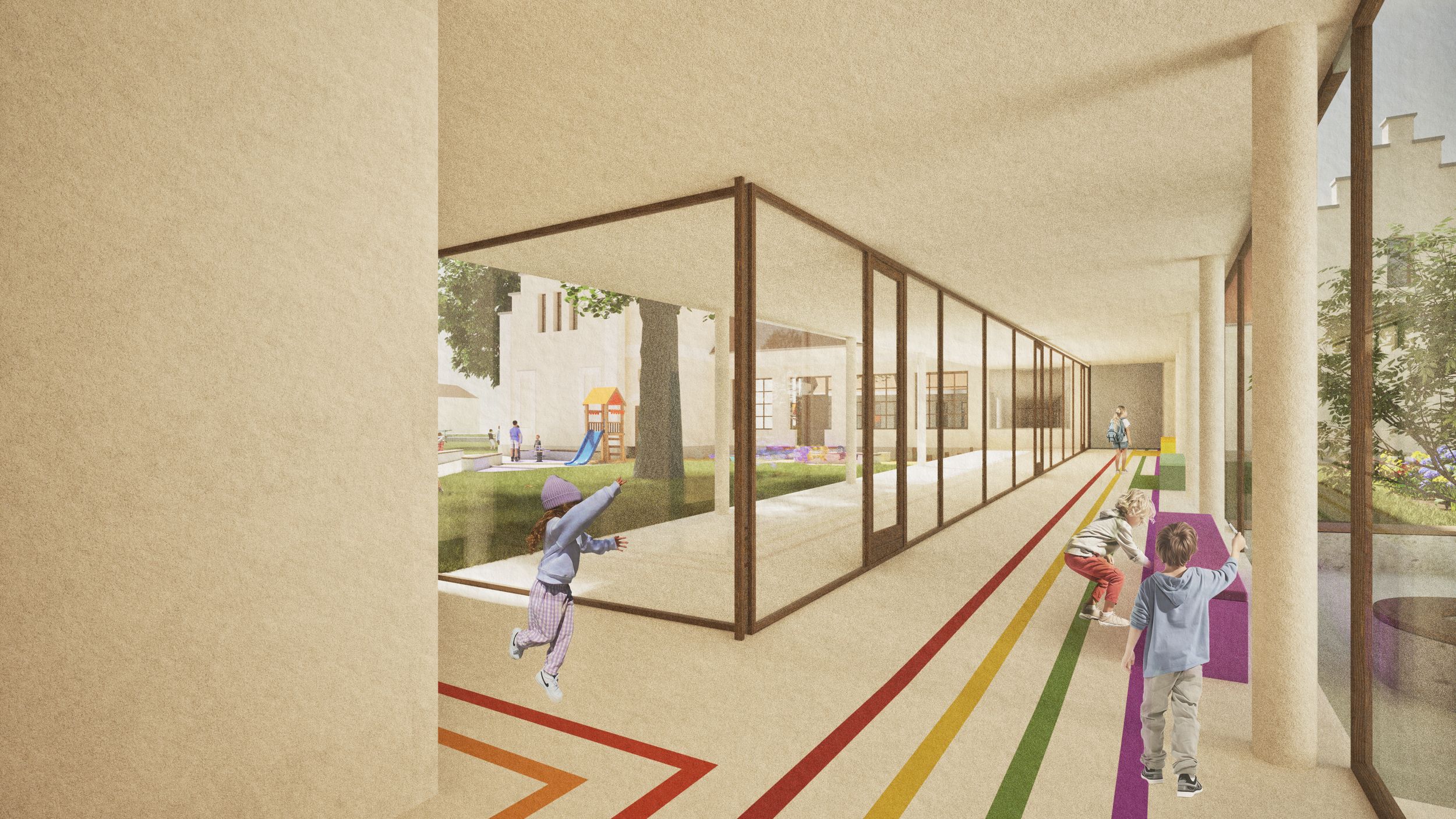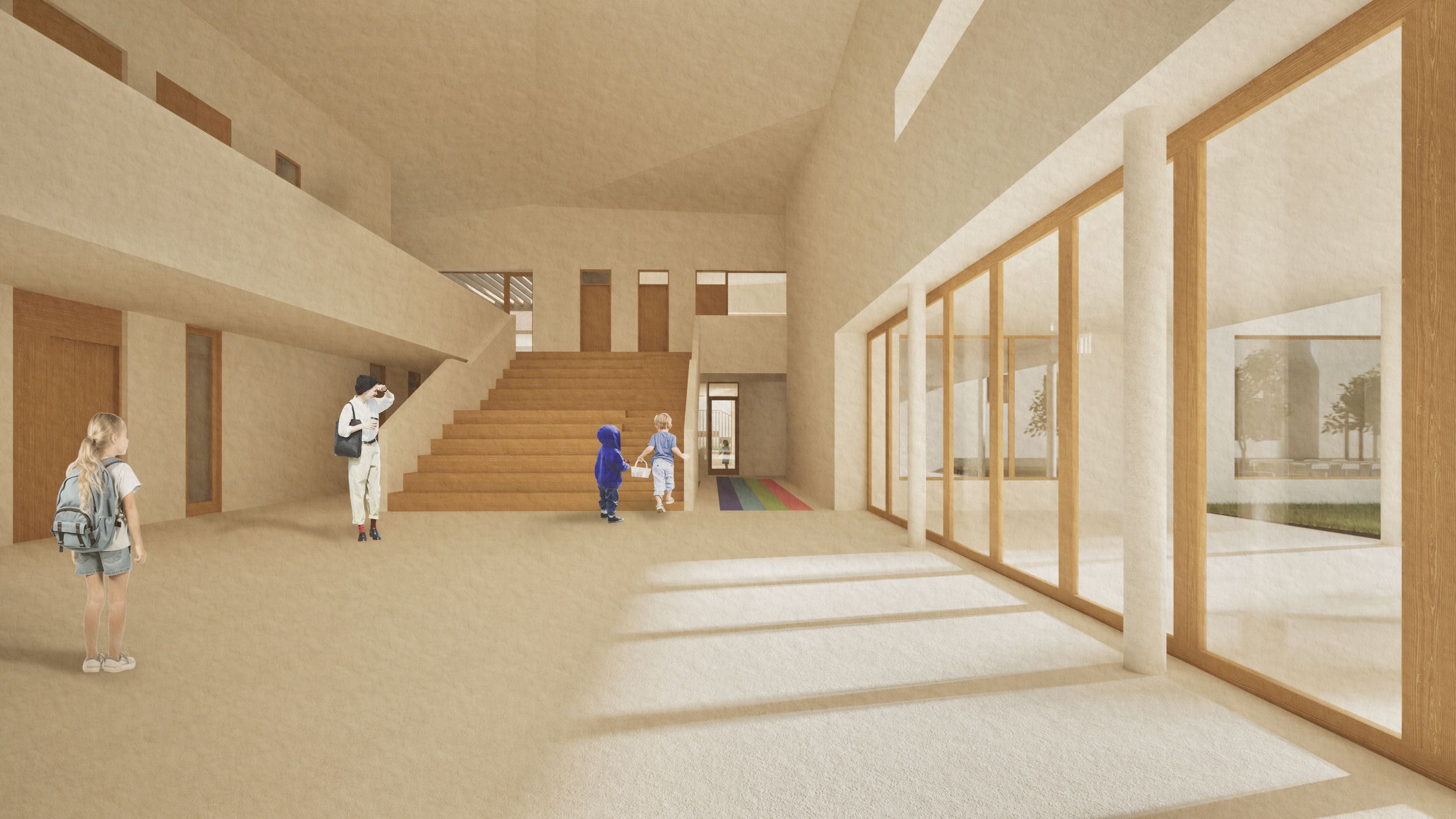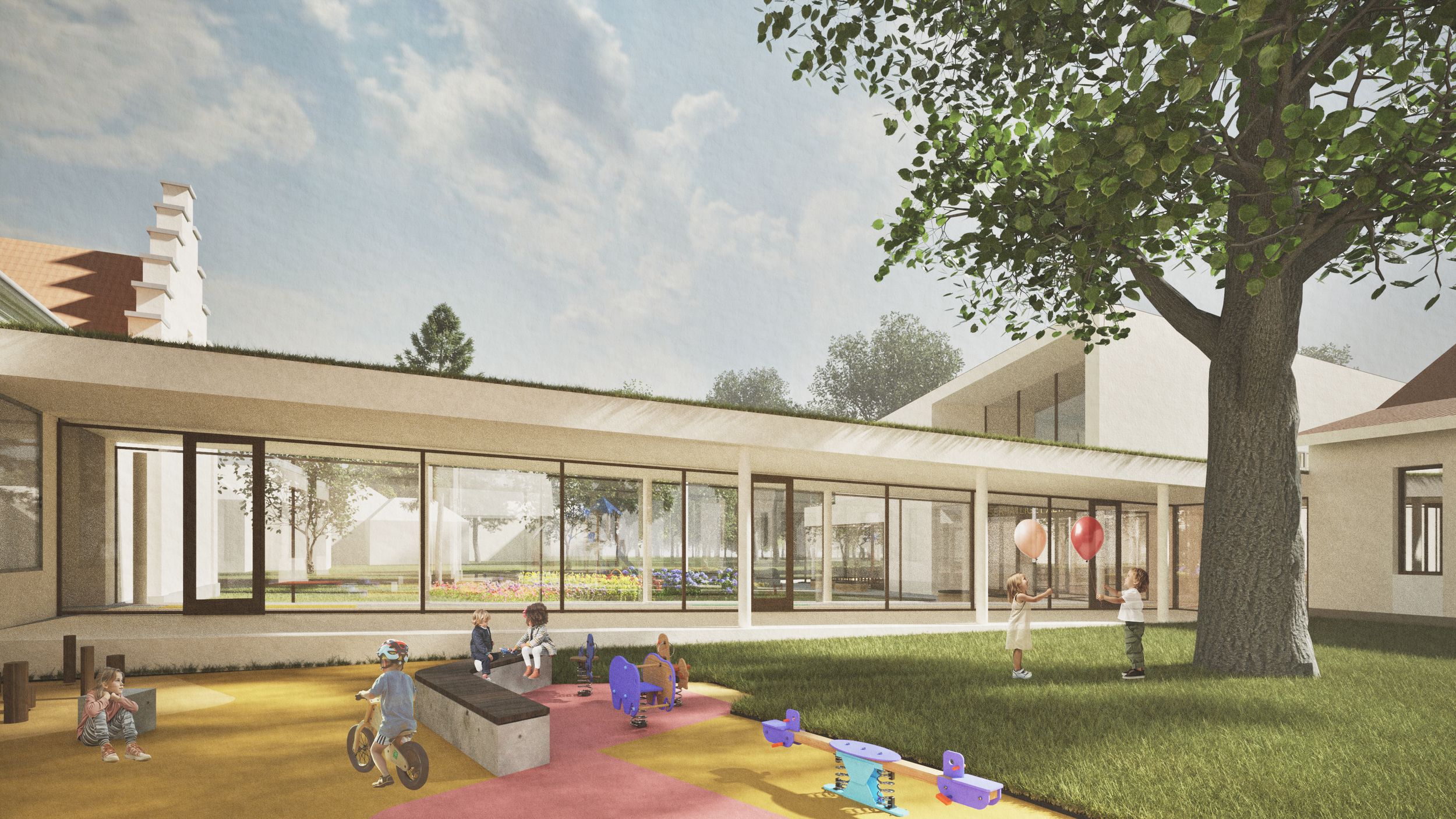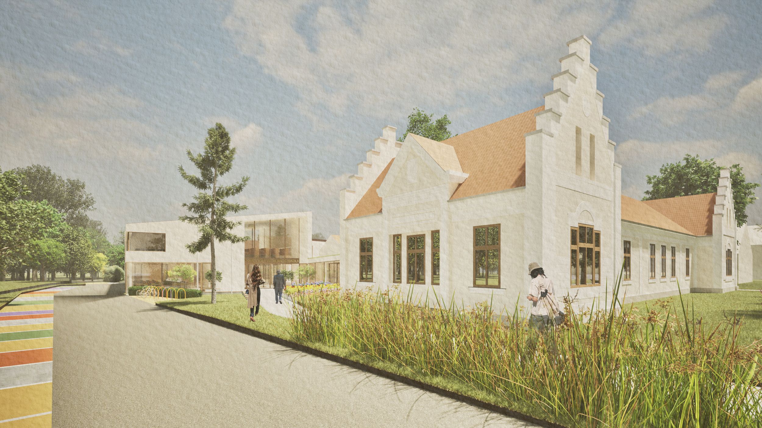 Több eszközzel is próbáltuk „szelídíteni” az épületegyüttes érzékelhető tömegét. Erre egyik eszközünk maga a pavilonos építészeti koncepció, mellyel, ha nem is falusi, de még elfogadható méretű egységekre bontottuk az épületet. Másik eszközünk, hogy az új, kétszintes tömeget a telken hátrahúztuk, a hozzá leginkább hasonló tornaterem közelébe, minél távolabb az Evva-kastélytól. Magát az új épületet építészeti eszközökkel is „lebontjuk”: ezt segíti az L-alakú forma, az oromfalakat nélkülöző, alacsony hajlású tető, a kevés, de nagy megnyitások.