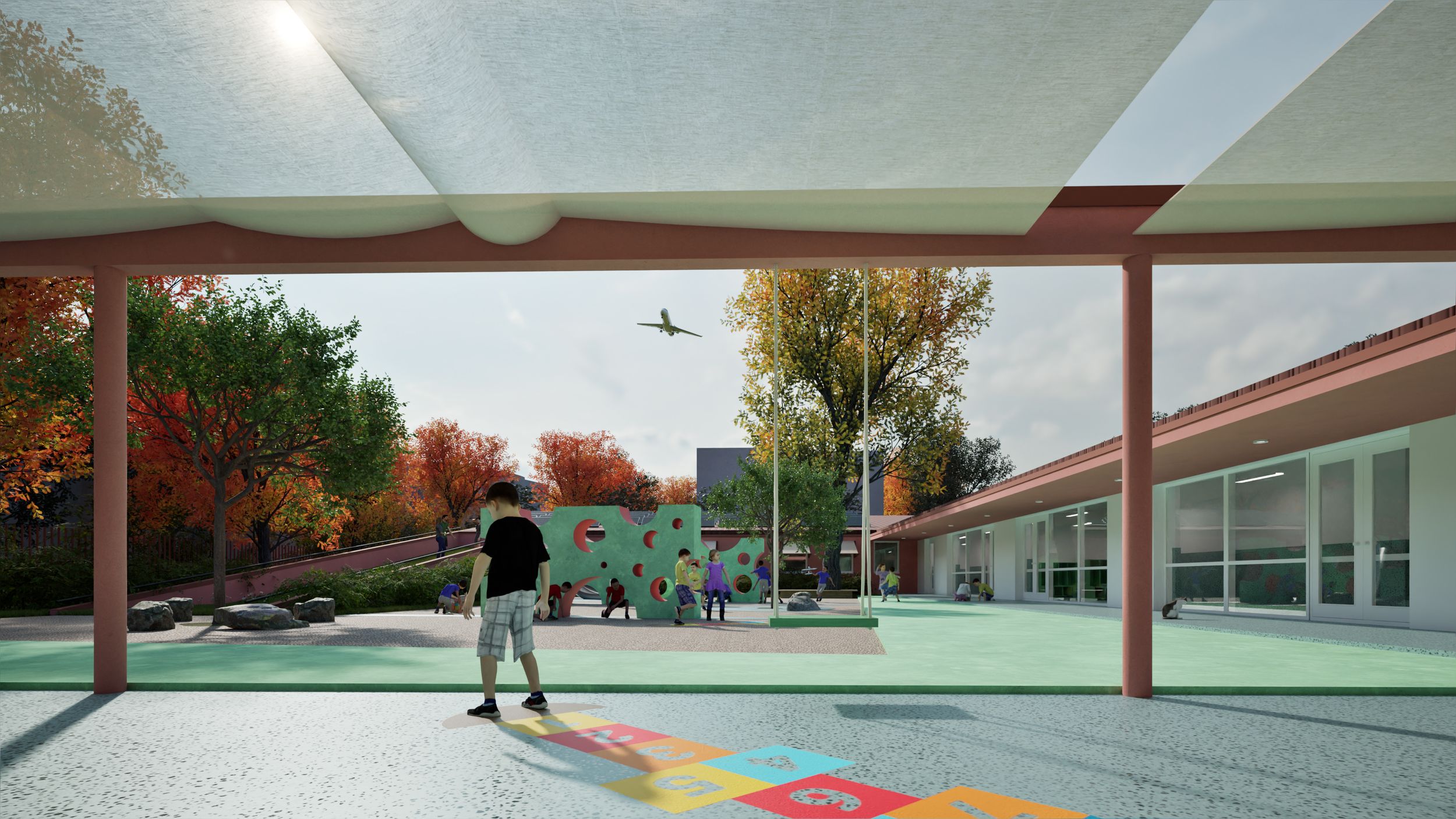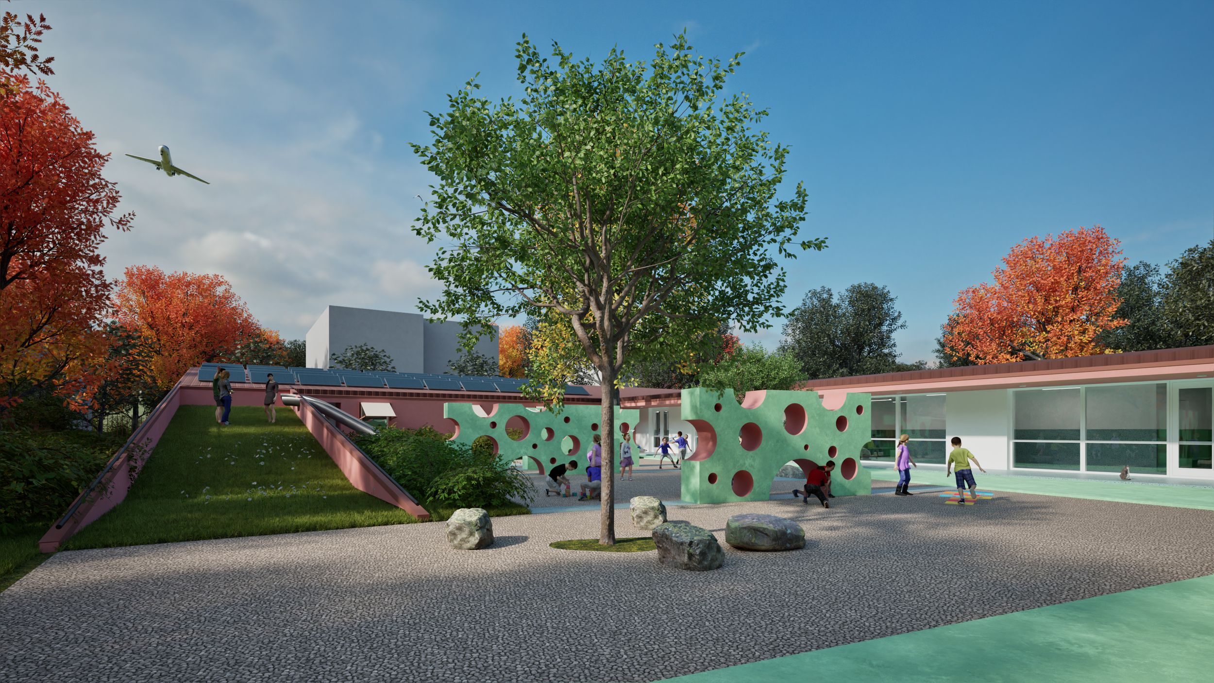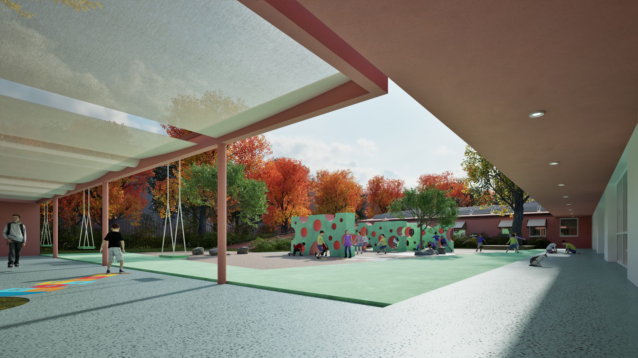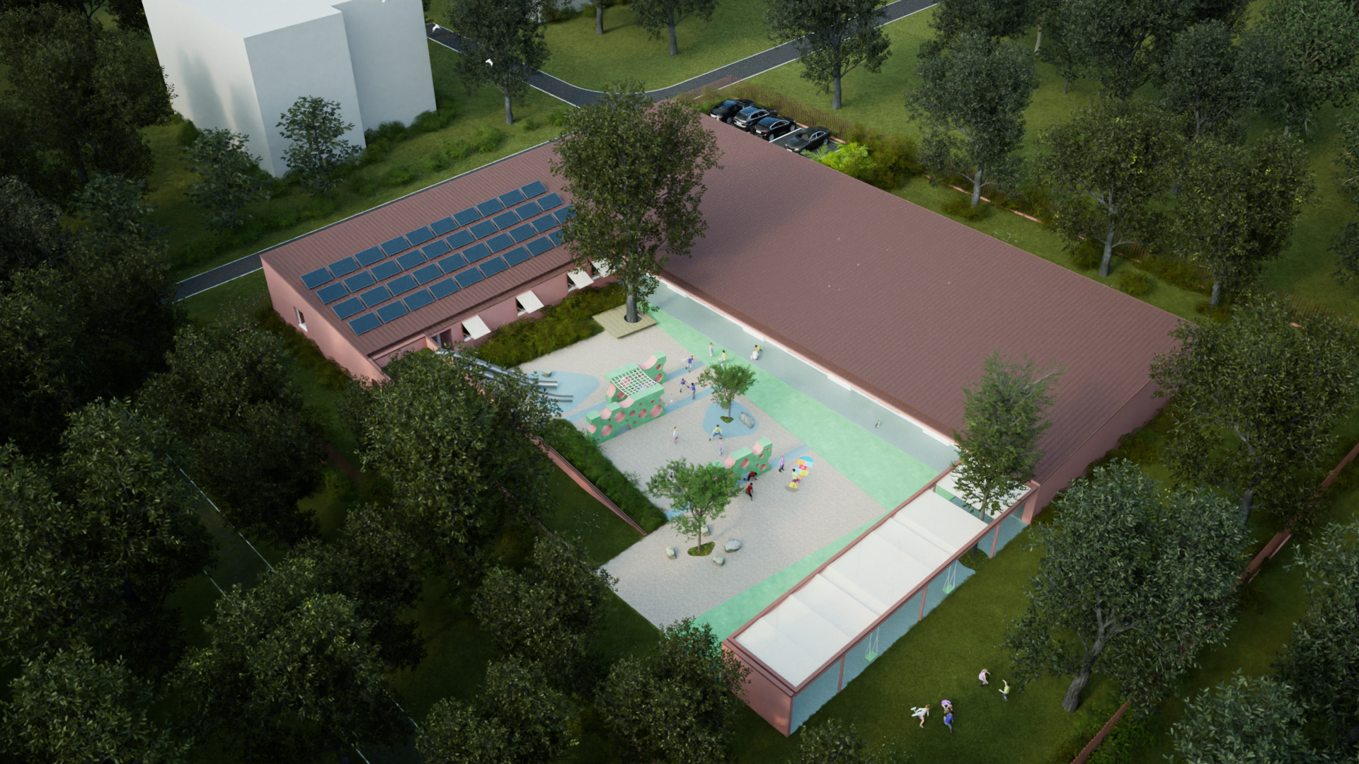 Alapvető döntésünk volt továbbá, hogy a racionálisan szerkesztett épület egyszerű képlete a gyermeki világ sajátos követelményeit is keretbe foglalja: ezért egészítettük ki az épületet a kert DNY-i oldalán egy mozgatható árnyékolóval, melyre játékok és hinták is függeszthetők, valamint az ÉK-i oldalon egy futkározó-szánkózó, füves rámpával.