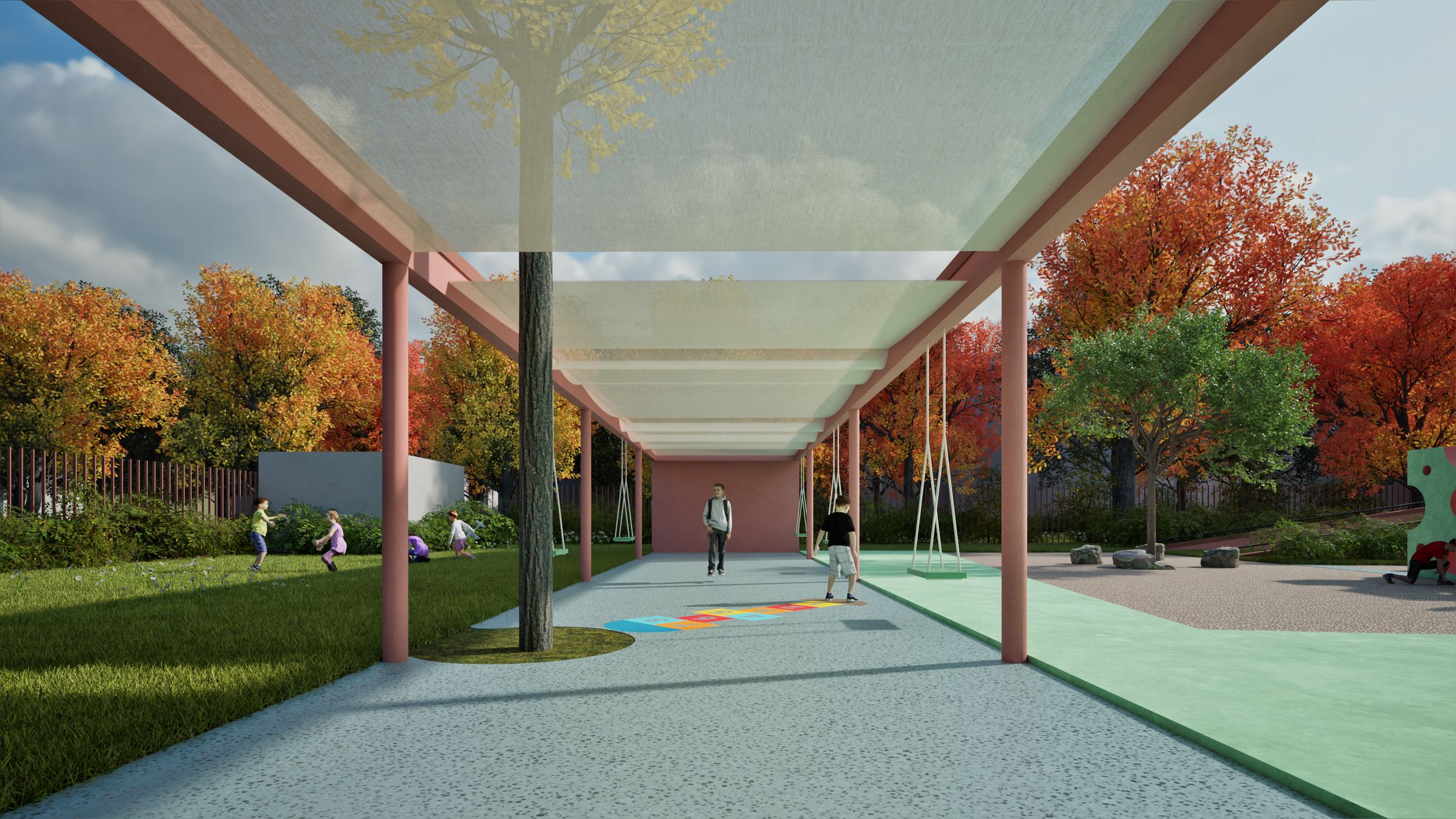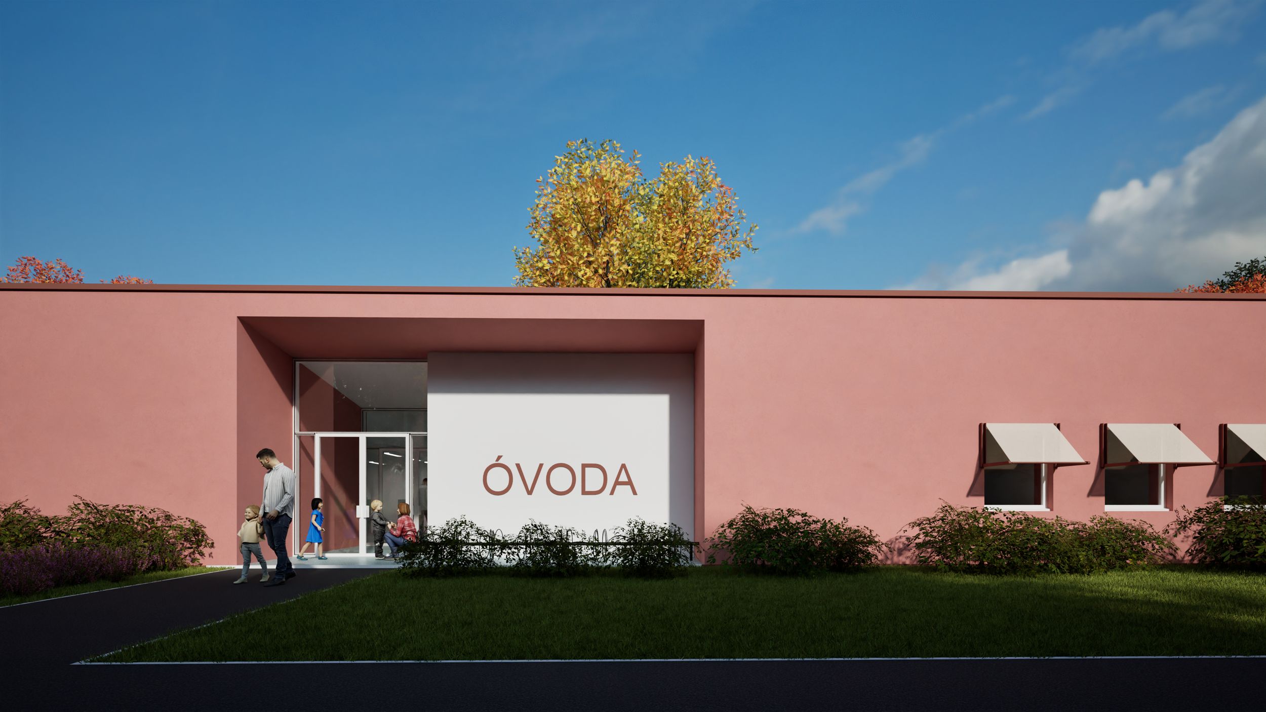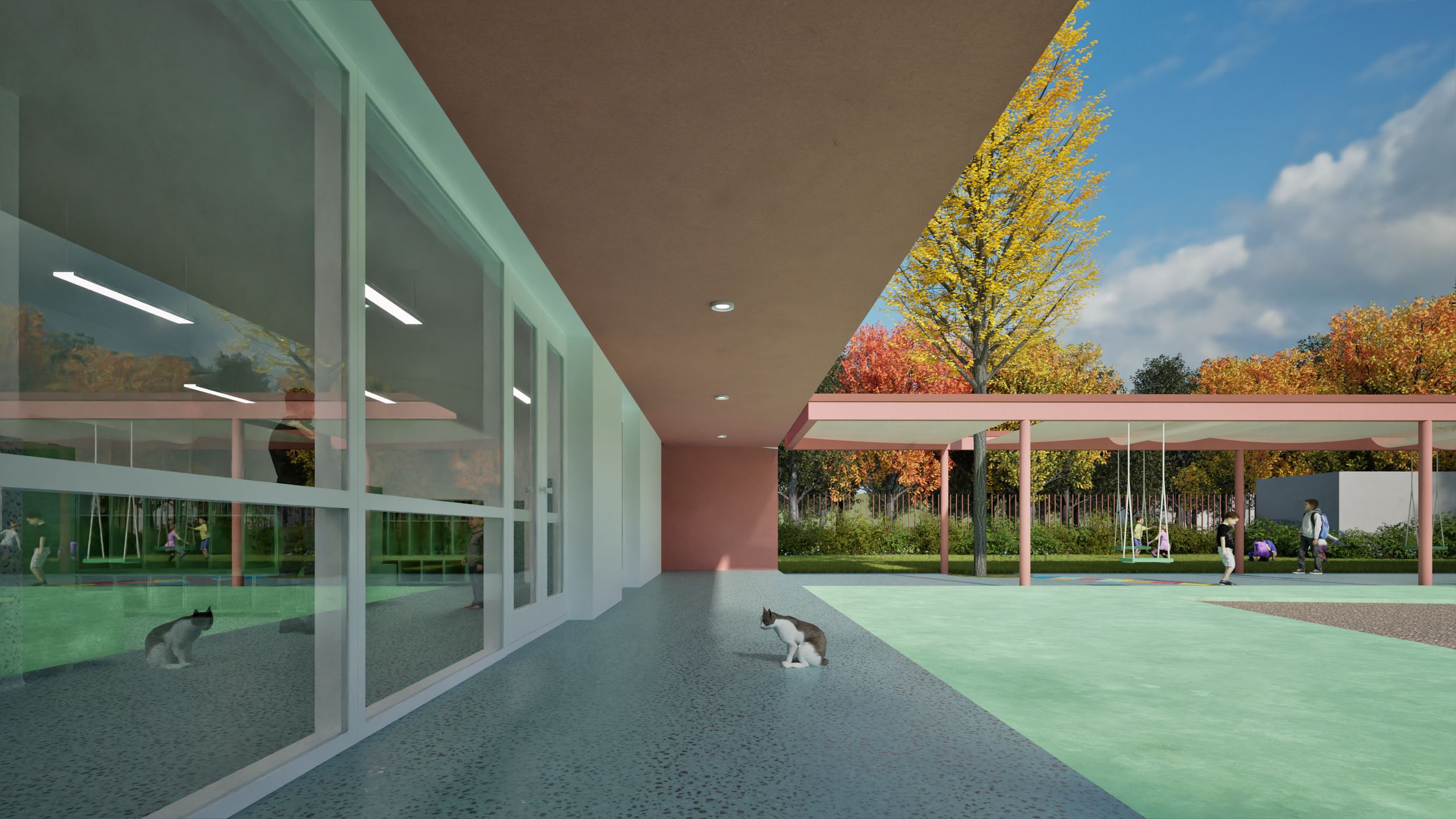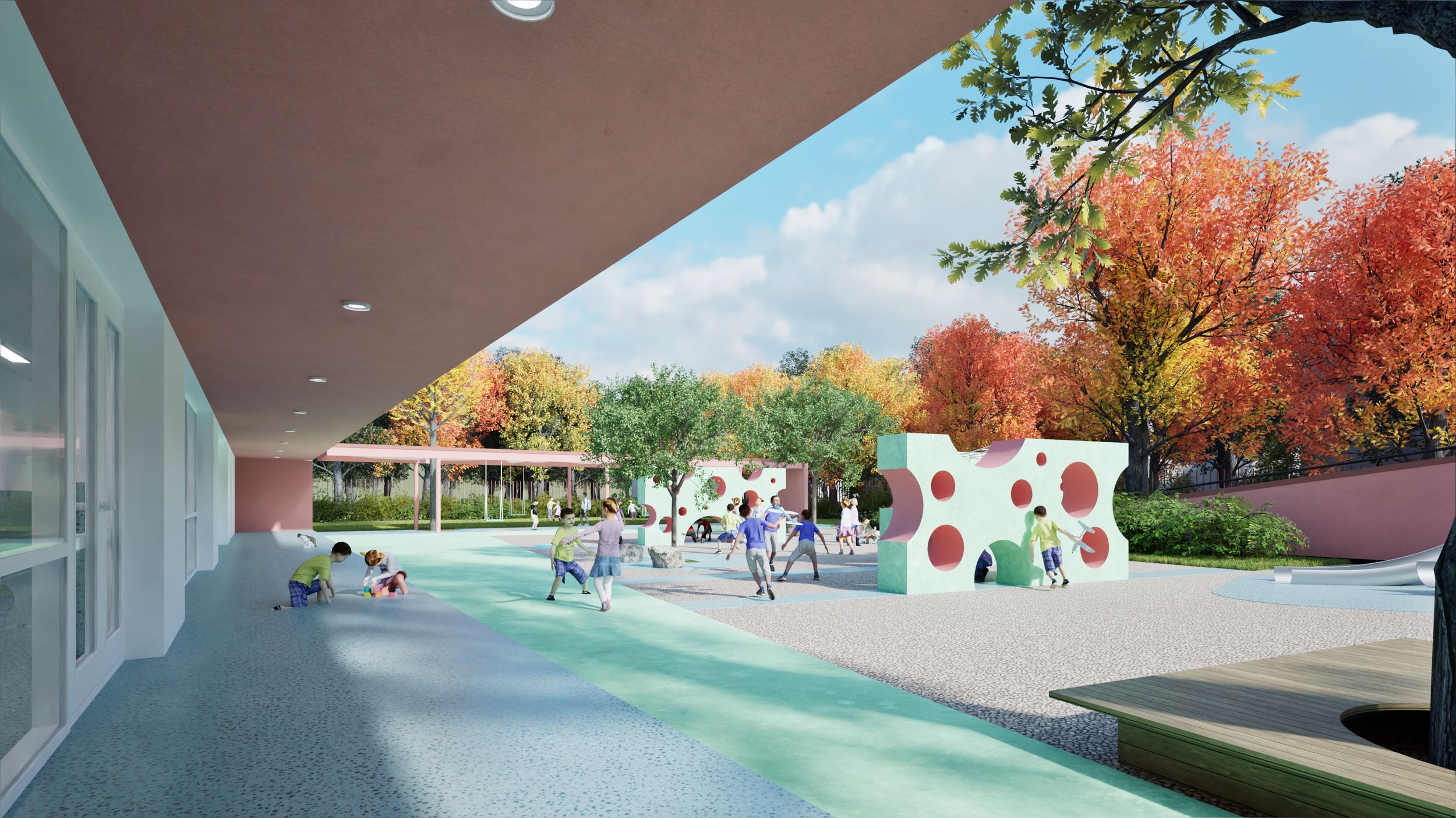Alapvető döntésünk volt továbbá, hogy a racionálisan szerkesztett épület egyszerű képlete a gyermeki világ sajátos követelményeit is keretbe foglalja: ezért egészítettük ki az épületet a kert DNY-i oldalán egy mozgatható árnyékolóval, melyre játékok és hinták is függeszthetők, valamint az ÉK-i oldalon egy futkározó-szánkózó, füves rámpával.
