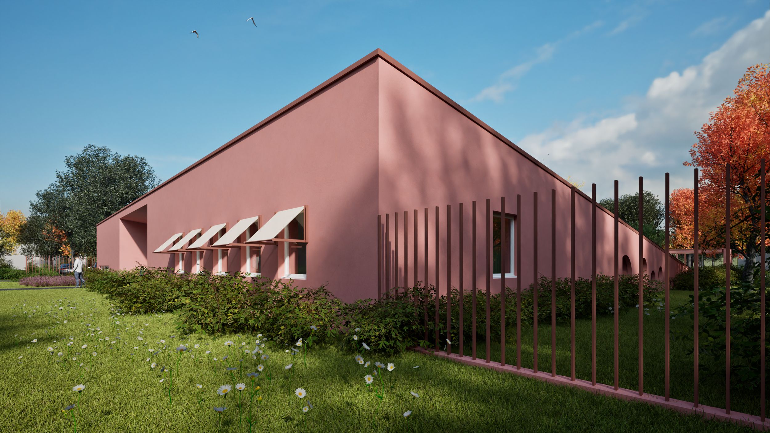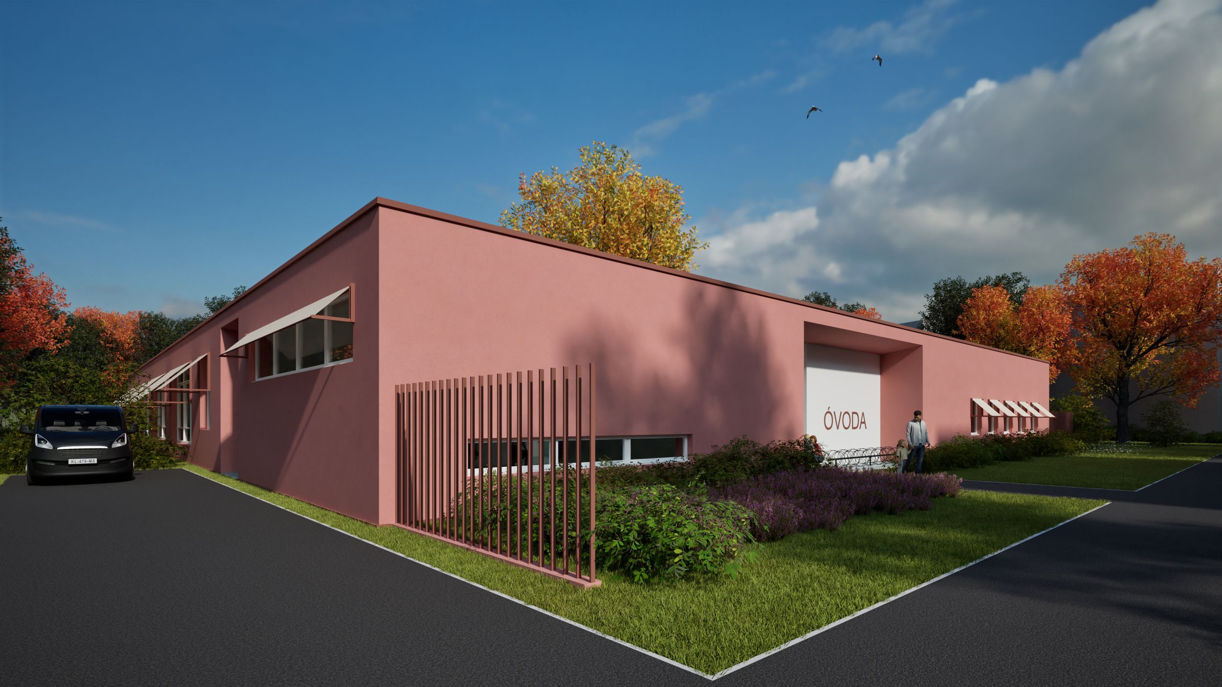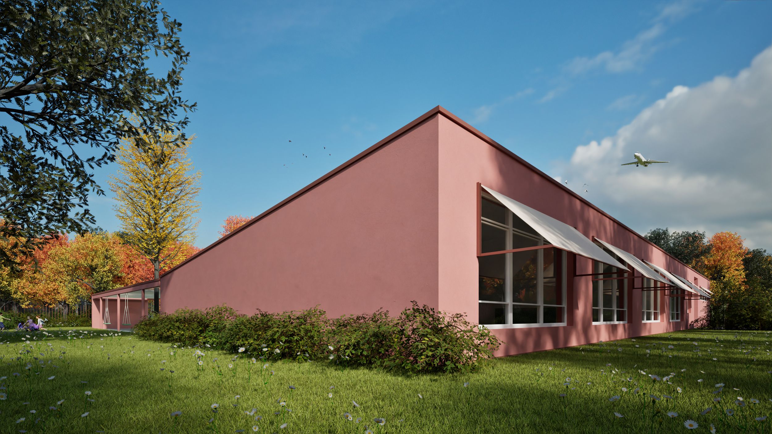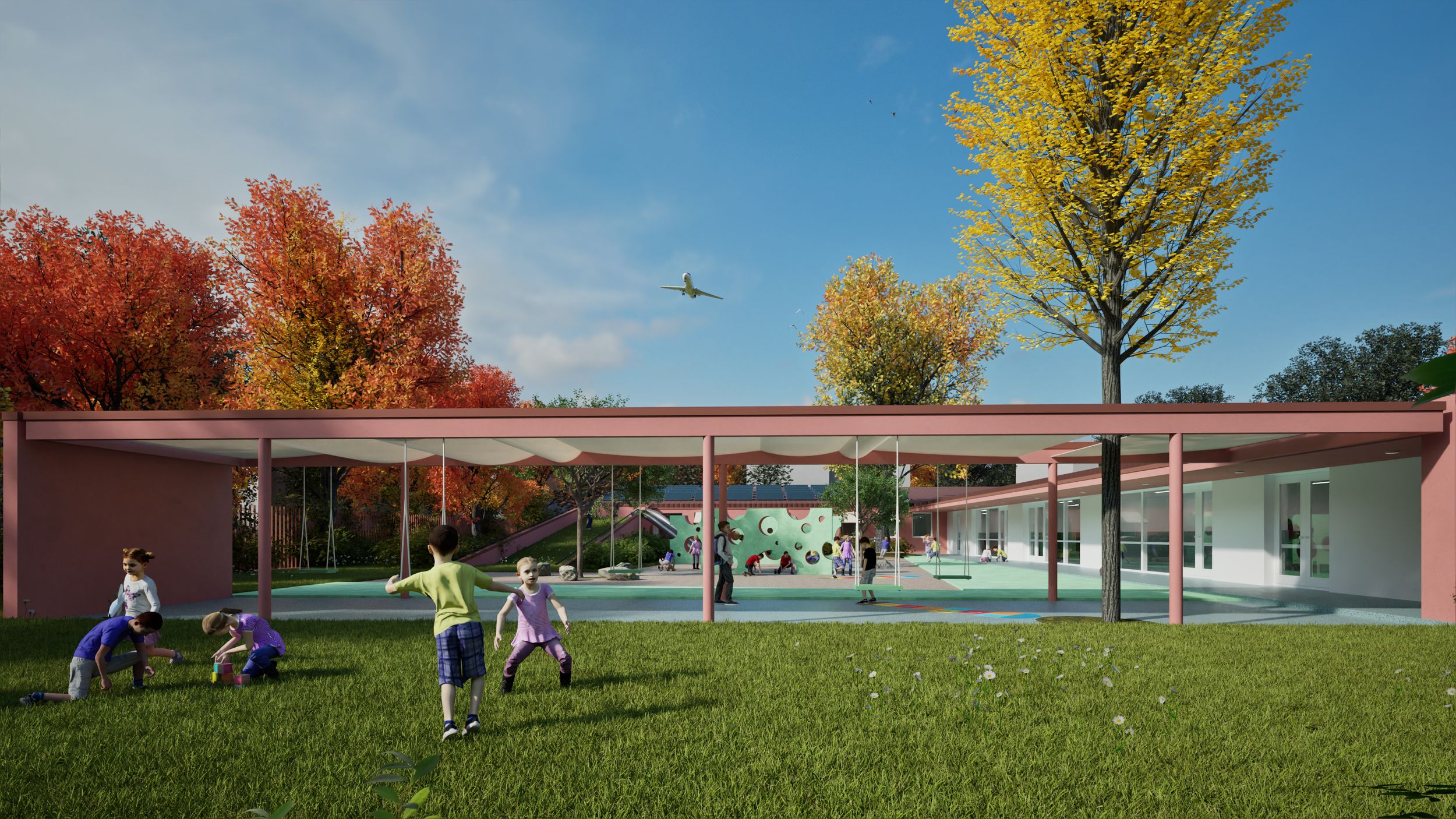 Alapvető döntésünk volt továbbá, hogy a racionálisan szerkesztett épület egyszerű képlete a gyermeki világ sajátos követelményeit is keretbe foglalja: ezért egészítettük ki az épületet a kert DNY-i oldalán egy mozgatható árnyékolóval, melyre játékok és hinták is függeszthetők, valamint az ÉK-i oldalon egy futkározó-szánkózó, füves rámpával.