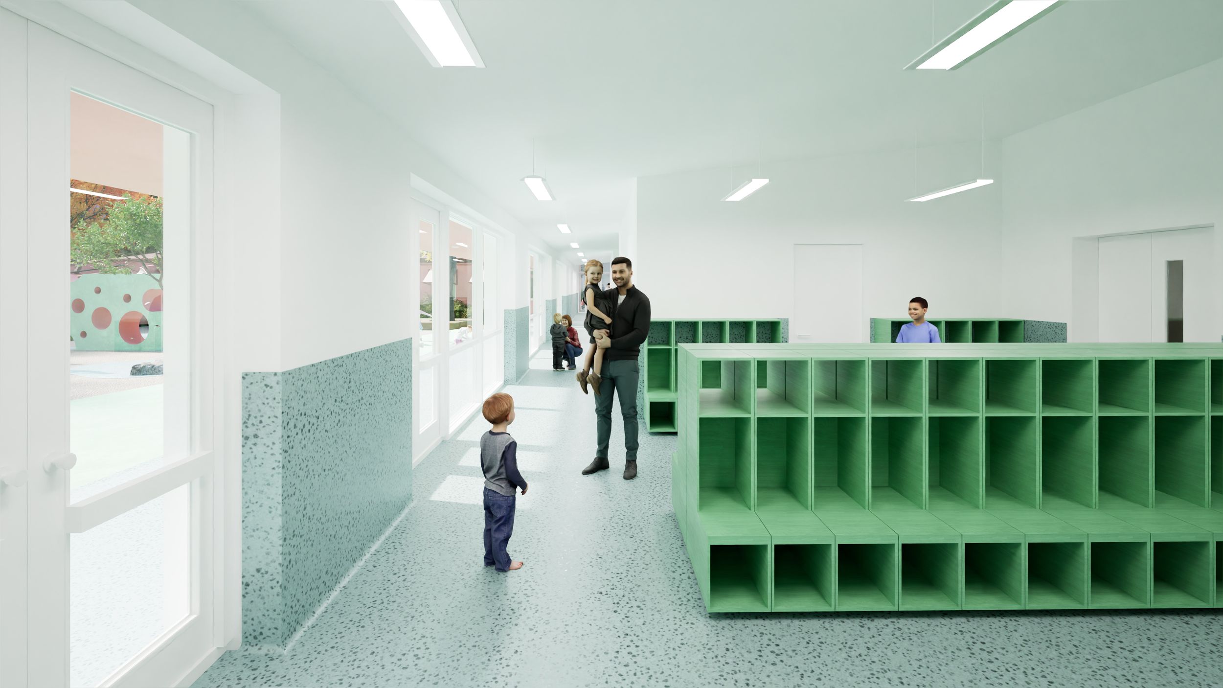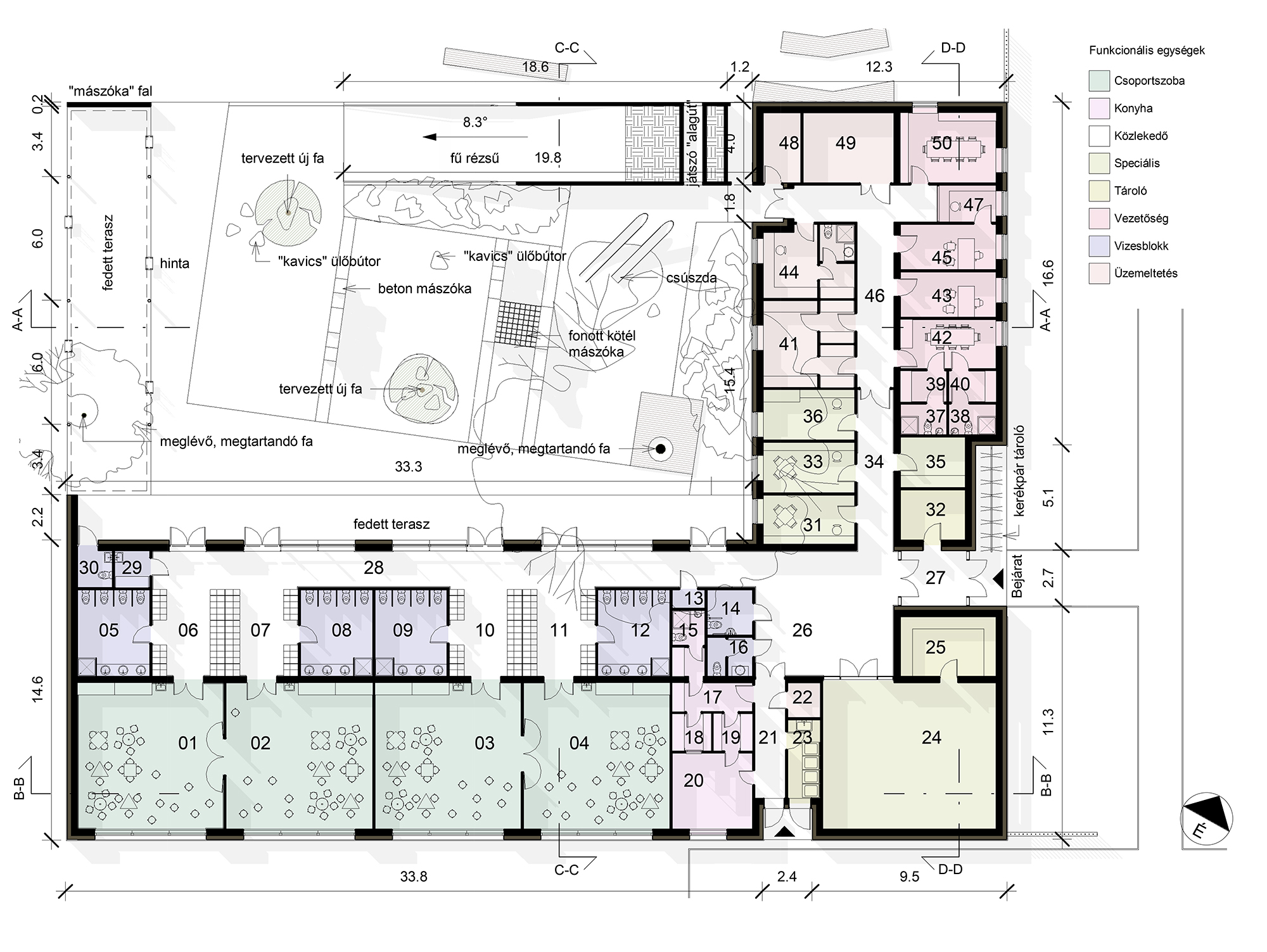 Alapvető döntésünk volt, hogy a foglalkoztató helyiségeket az általunk optimálisnak tartott dél- délkeleti irányba tájoljuk és a legtöbb helyiségnek természetes megvilágítást és szellőzést biztosítsunk. Ez is csökkenti az üzemeltetési költségeket és szerethetőbb, egészségesebb környezetet biztosít a gyerekeknek és a dolgozóknak egyaránt.